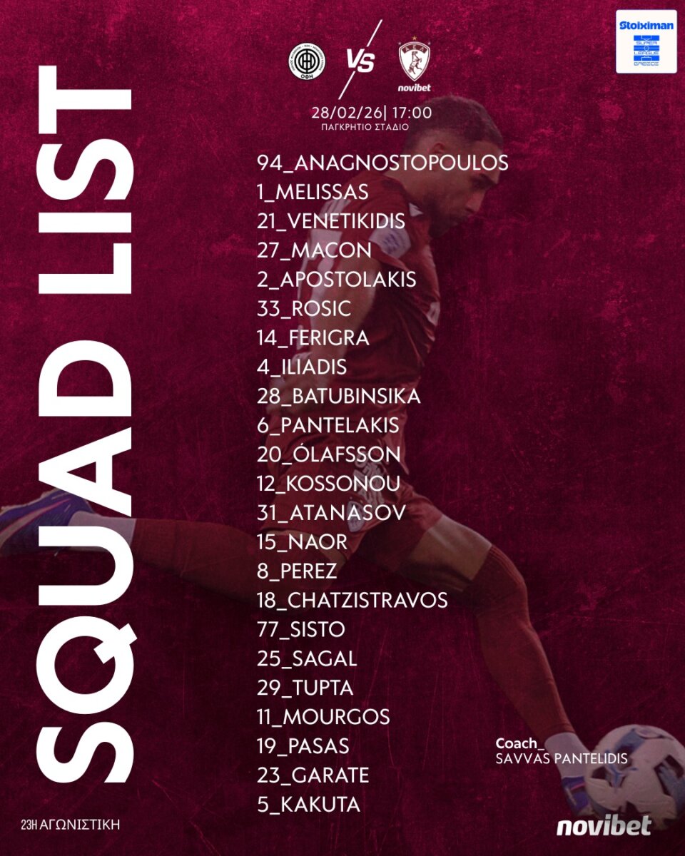 Οι 23 παίκτες που επέλεξε ο κ. Σάββας Παντελίδης είναι οι: Αναγνωστόπουλος, Μελίσσας. Βενετικίδης, Μασόν, Αποστολάκης, Ρόσιτς, Φερίγκρα, Ηλιάδης, Παντελάκης, Μπατουμπινσικά, Όλαφσον, Κοσονού, Σίστο, Ατανάσοφ, Ναόρ, Πέρεζ, Χατζηστραβός, Σαγάλ, Τούπτα, Μούργος, Πασάς, Γκαράτε, Κακουτά.