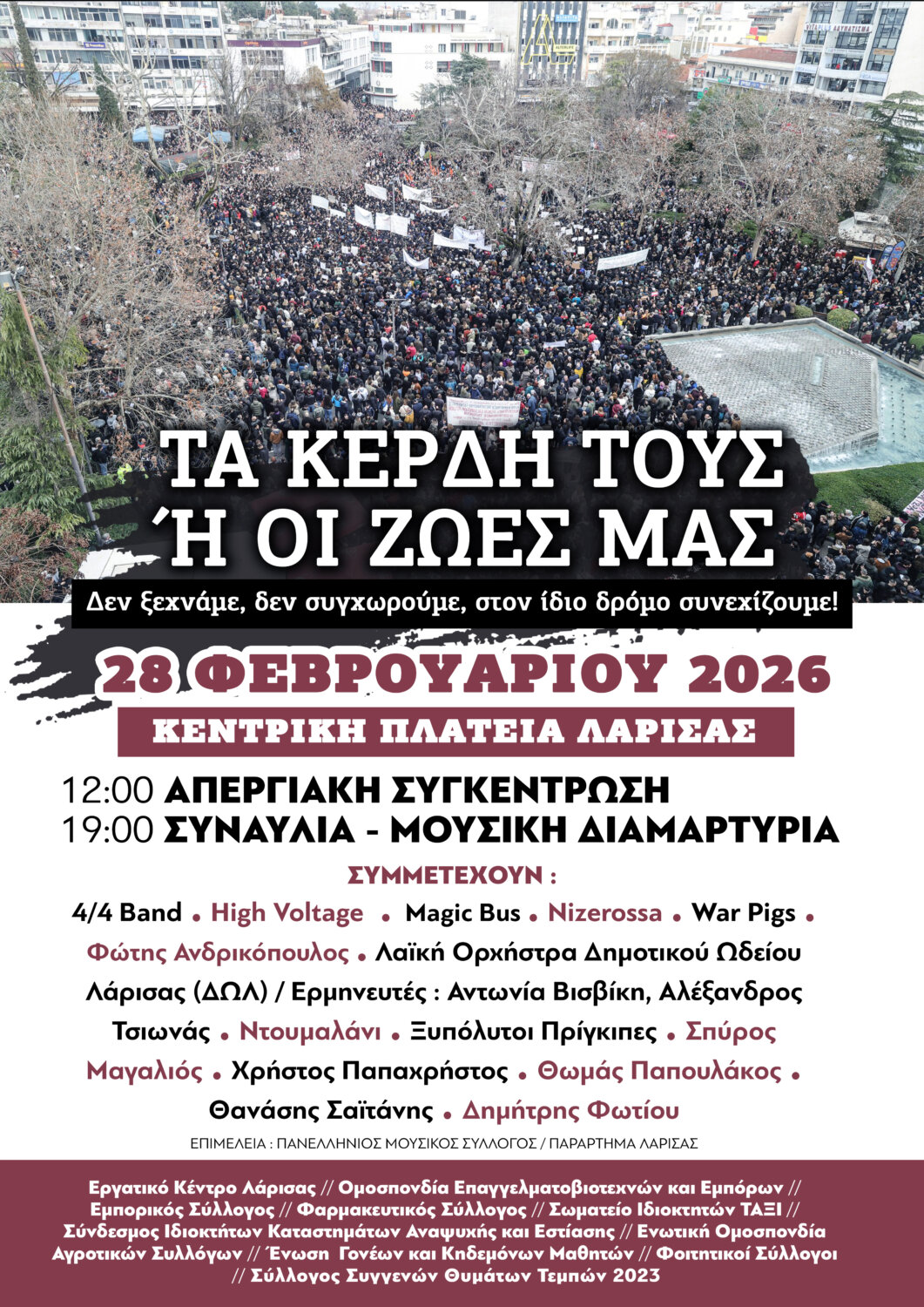 Αποφασίστηκε η από κοινού συμμετοχή στην Απεργιακή Συγκέντρωση που συνδιοργανώνουν: Εργατικό Κέντρο Λάρισας, Ομοσπονδία Επαγγελματοβιοτεχνών και Εμπόρων, Εμπορικός Σύλλογος. Φαρμακευτικός Σύλλογος, Σωματείο Ιδιοκτητών ΤΑΞΙ, Σύνδεσμος Ιδιοκτήτων Καταστημάτων Αναψυχής και Εστίασης, Ενωτική Ομοσπονδία Αγροτικών Συλλόγων, Ένωση Γονέων και Κηδεμόνων Μαθητών, Φοιτητικοί Σύλλογοι και ο Σύλλογος Συγγενών Θυμάτων Τεμπών – 2023 στις 28 Φεβρουαρίου 2026, 3 χρόνια μετά το έγκλημα στα Τέμπη.