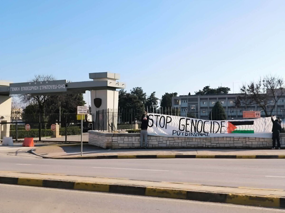 «Ανάρτηση πανό ενάντια στην αποστολή ελληνικής στρατιωτικής δύναμης στη Γάζα στο Στρατόπεδο «Στρατηγού Νικολάου Πλαστήρα» στην Λάρισα, όπου στεγάζεται το Ελληνικό Στρατηγείο Επιχειρήσεων Ευρωπαϊκής Ένωσης «EL EU-OHQ», που από από το 2024 έχει οριστεί με πρωτοβουλία του ελληνικού κράτους ως επιχειρησιακό κέντρο της ναυτικής επιχείρησης της ΕΕ εναντίον της Υεμένης στην Ερυθρά Θάλασσα.