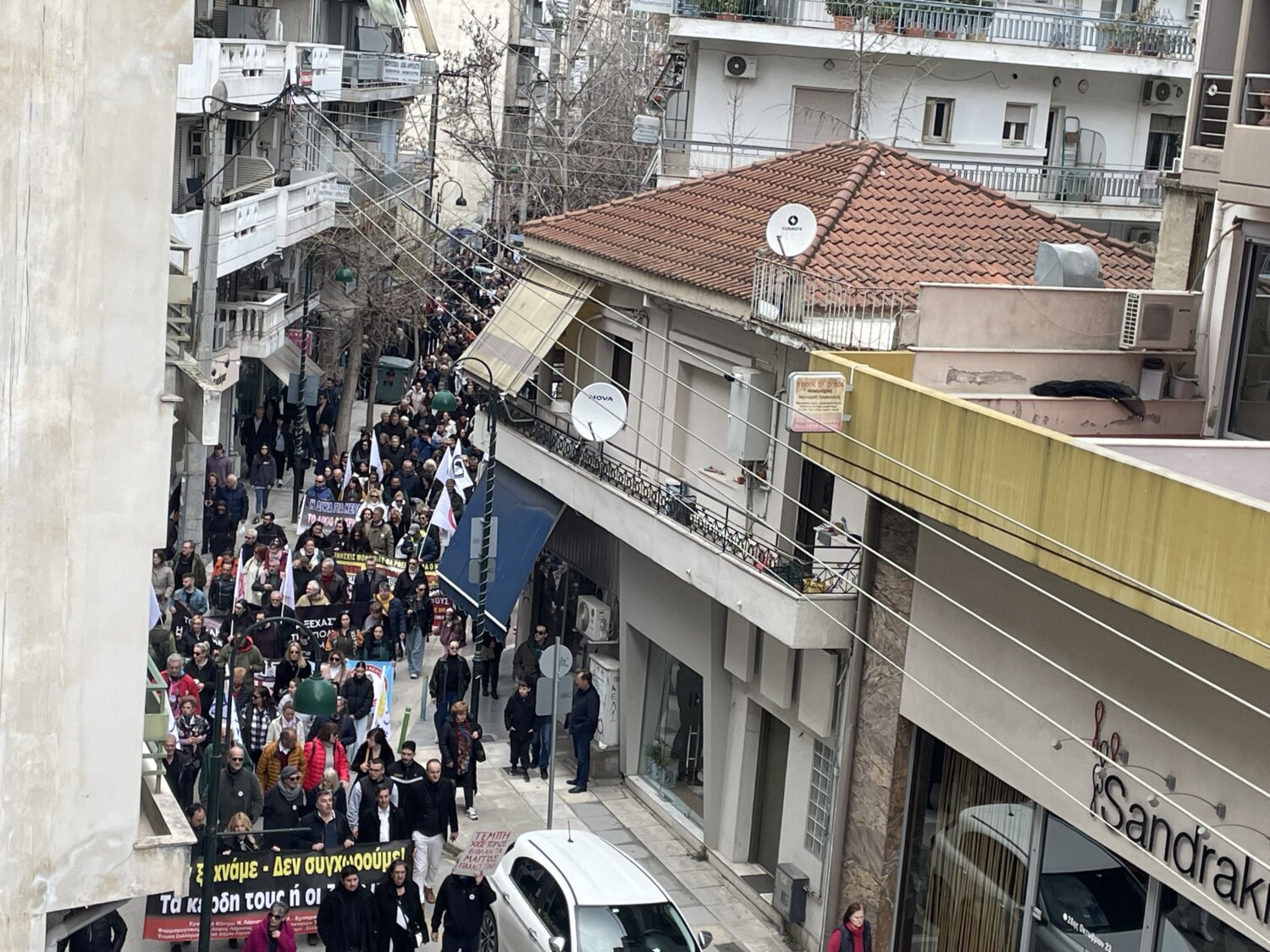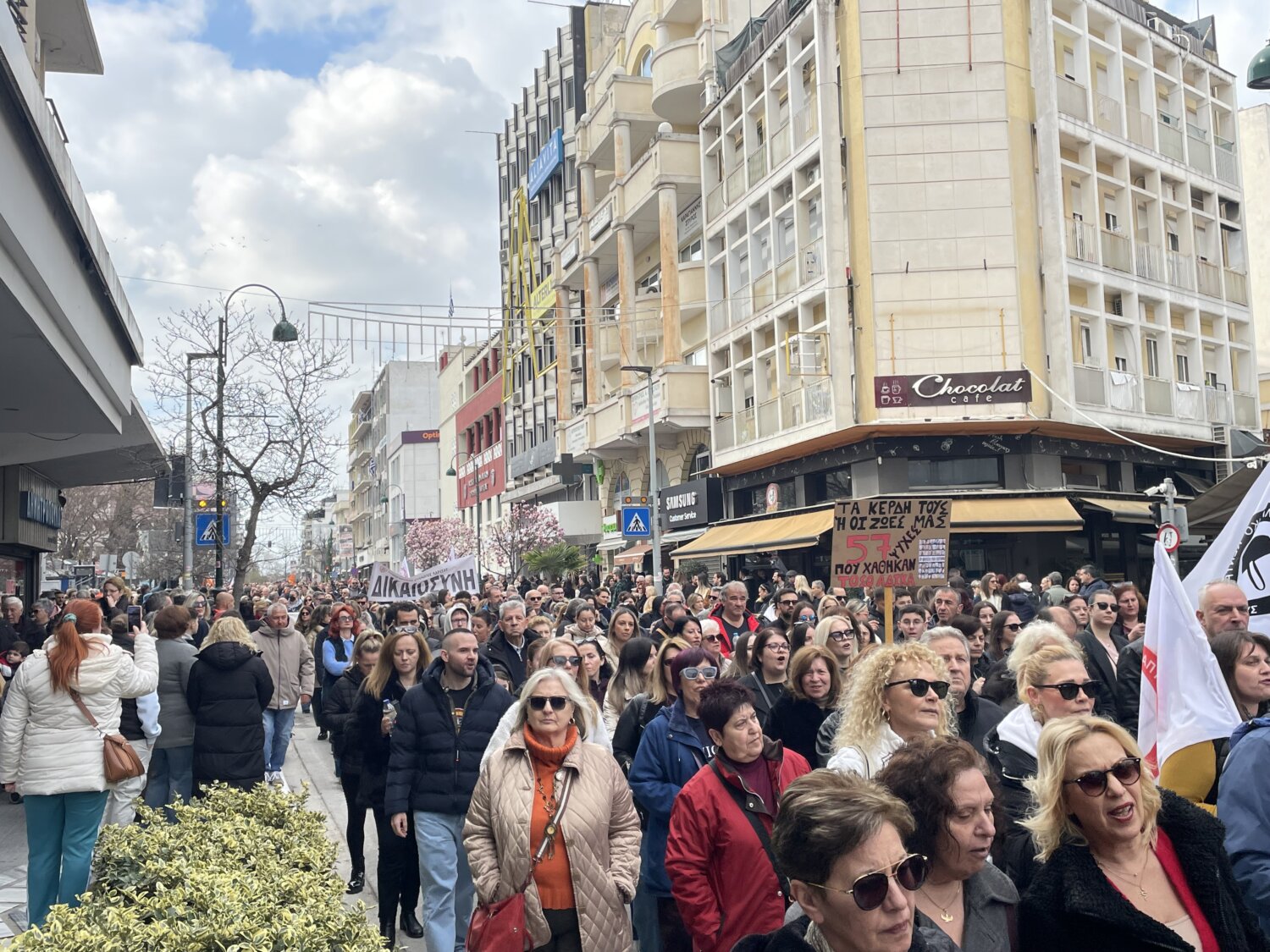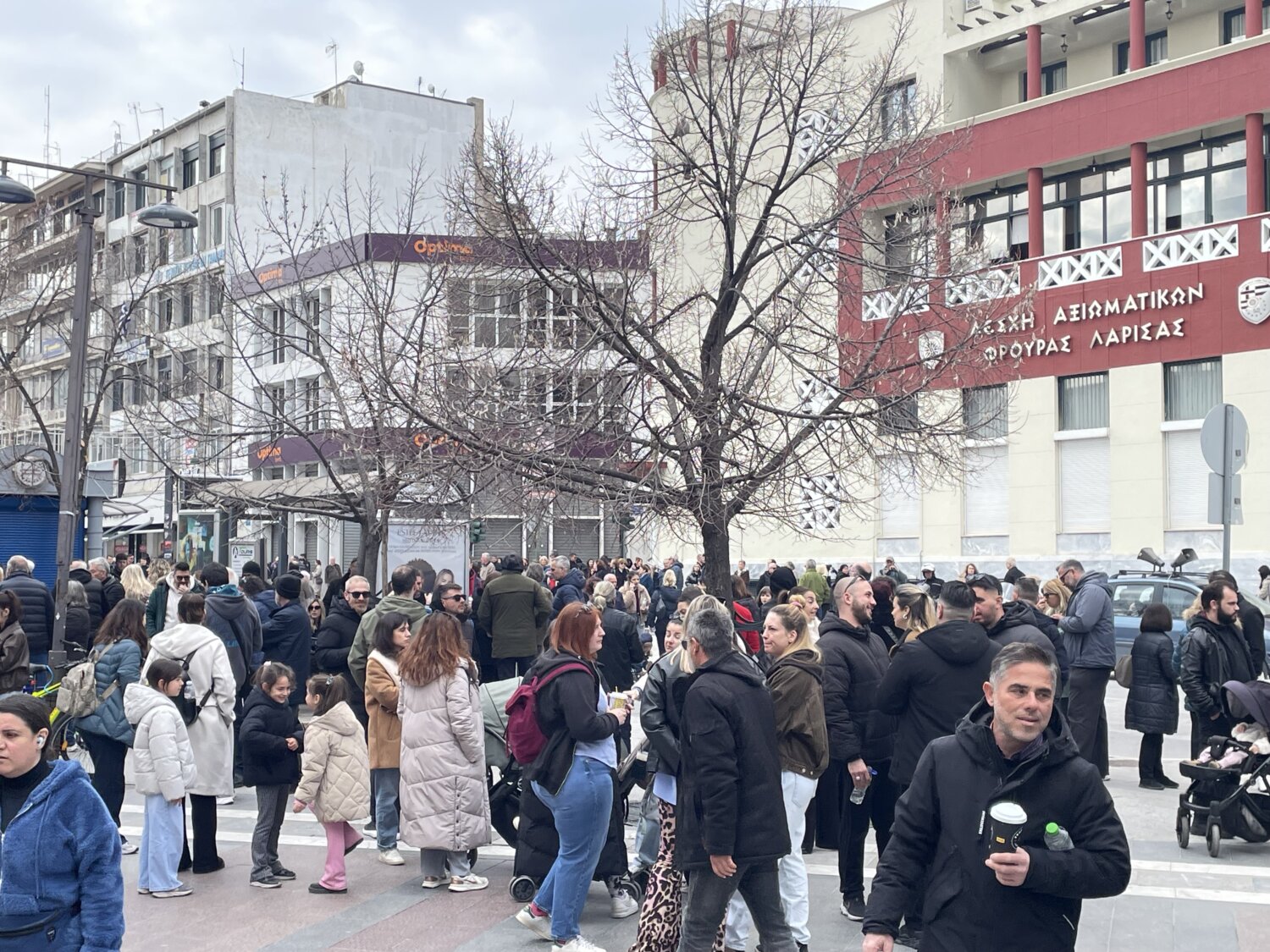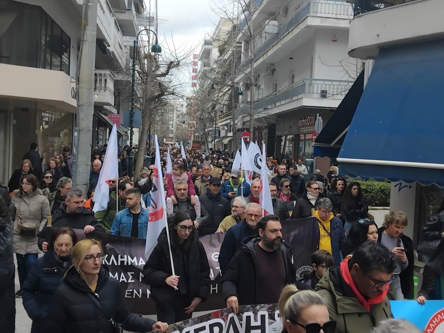 Λίγο μετά τη μία το μεσημέρι ξεκίνησε η πορεία στους δρόμους της Λάρισας, με τη μαζική συμμετοχή πολιτών που ζητούν δικαιοσύνη για την σιδηροδρομική τραγωδία των Τεμπών.