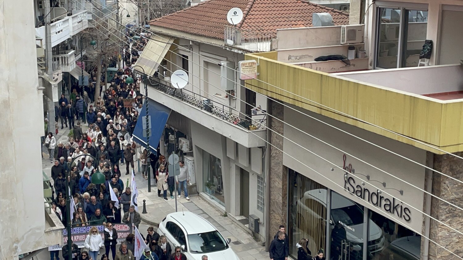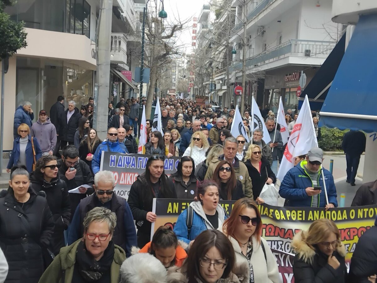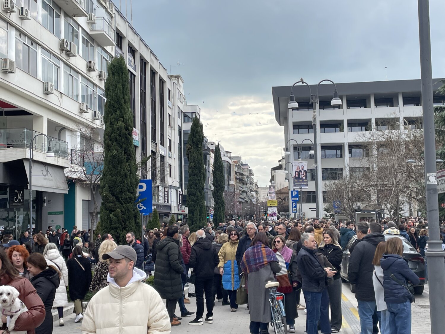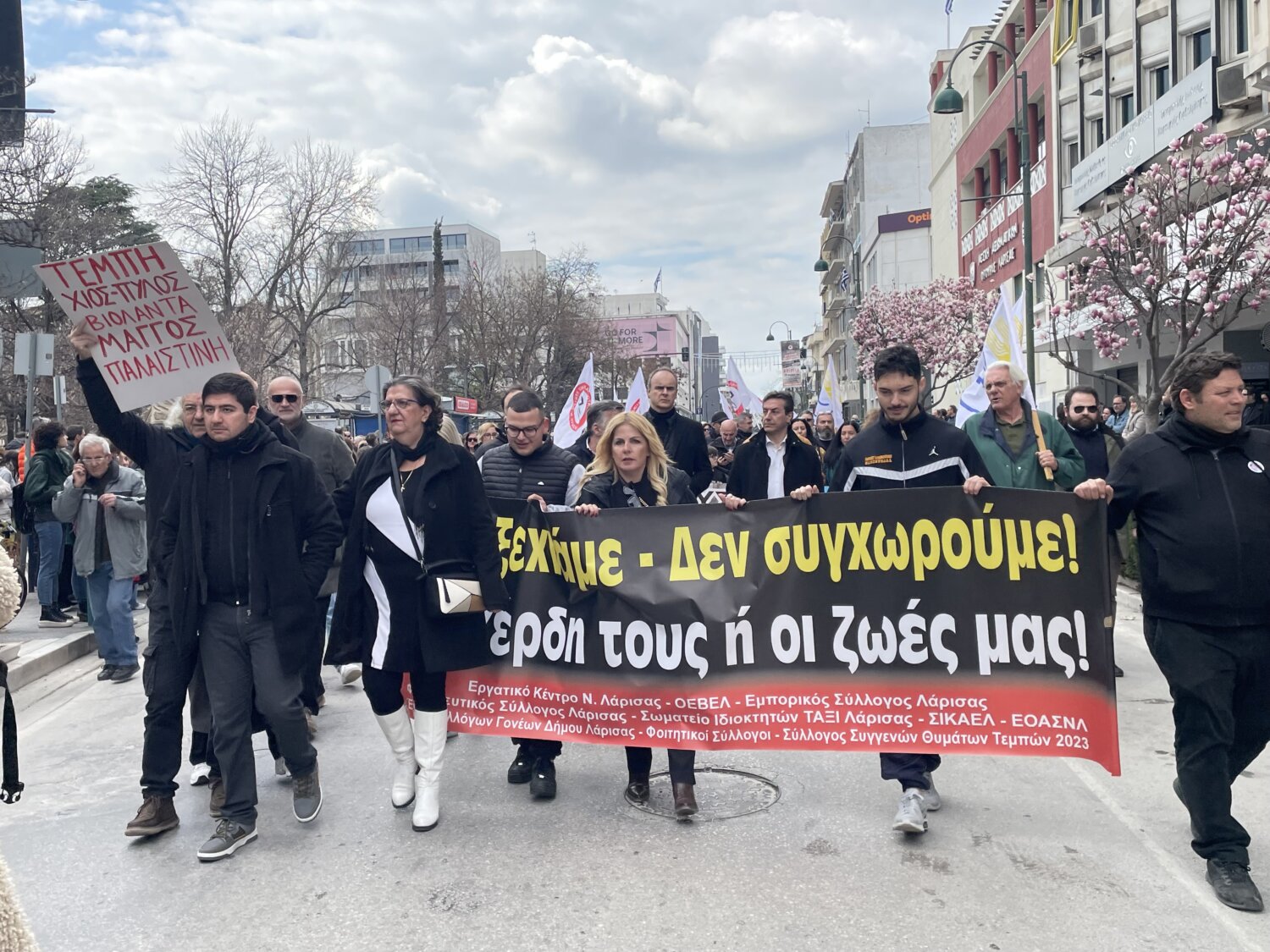 Λίγο μετά τη μία το μεσημέρι ξεκίνησε η πορεία στους δρόμους της Λάρισας, με τη μαζική συμμετοχή πολιτών που ζητούν δικαιοσύνη για την σιδηροδρομική τραγωδία των Τεμπών.