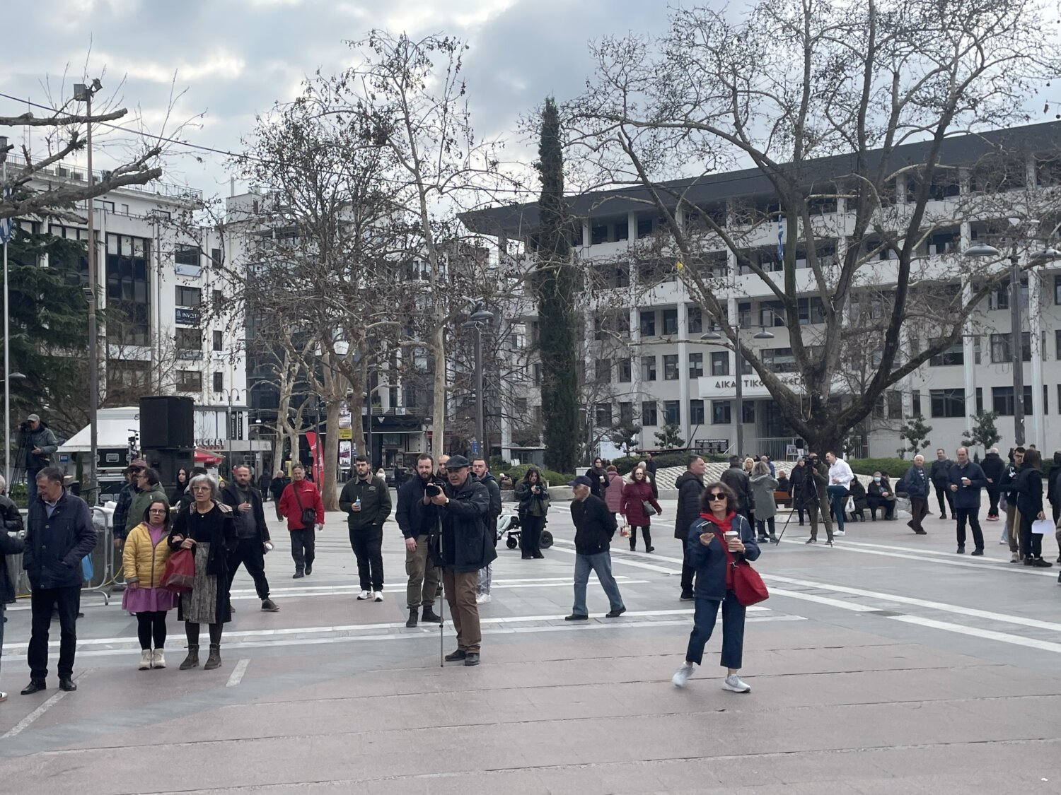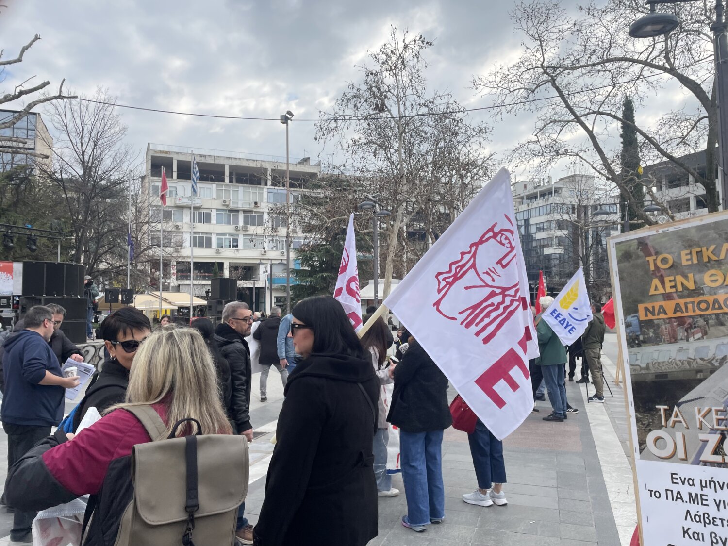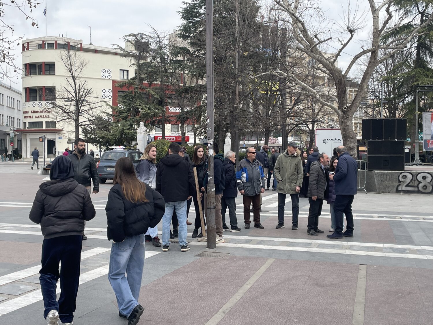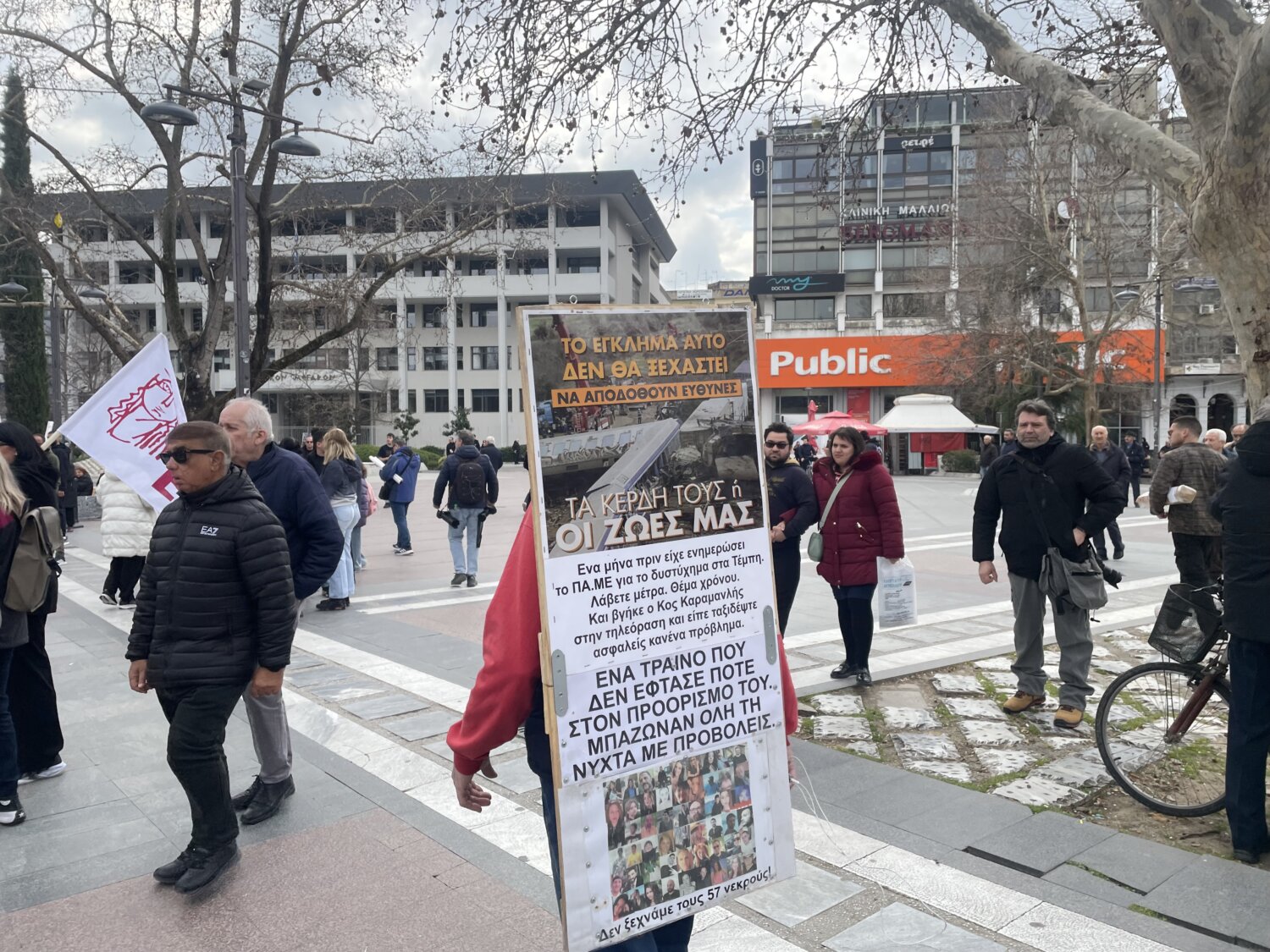 Προσέρχεται ο κόσμος στην Κεντρική Πλατεία της Λάρισας όπου αναμένεται να διαδηλώσει για τη συμπλήρωση τριών ετών από τη σιδηροδρομική τραγωδία των Τεμπών.