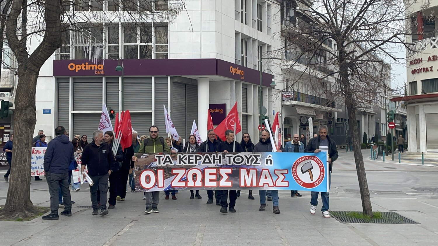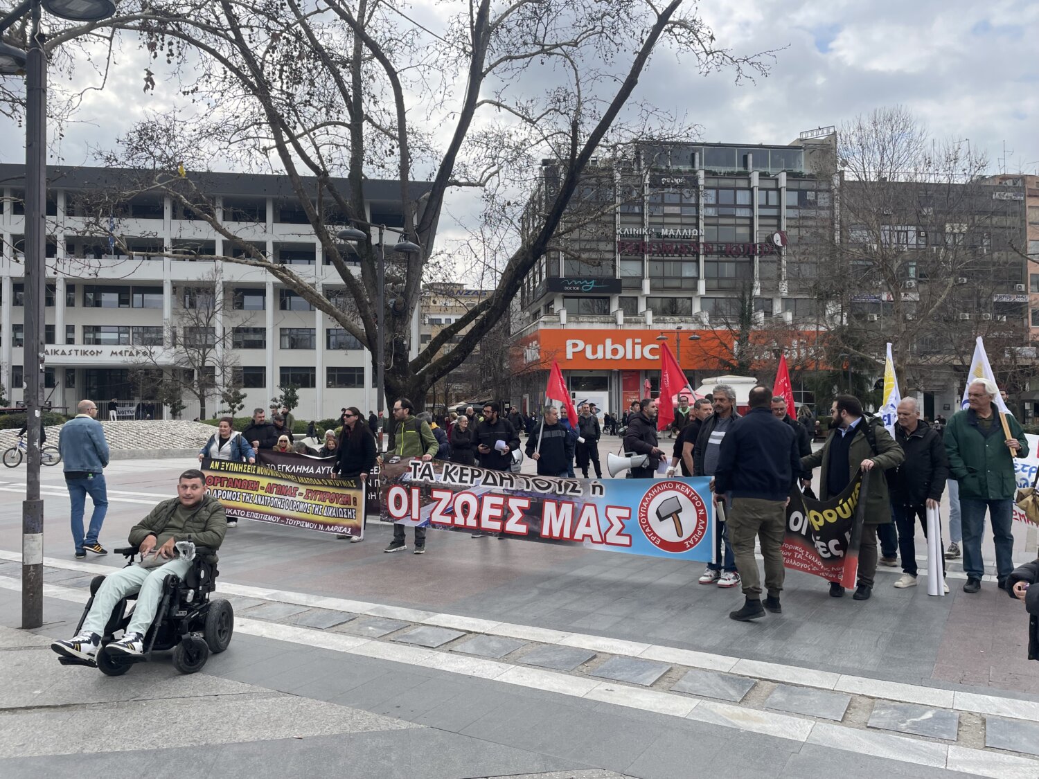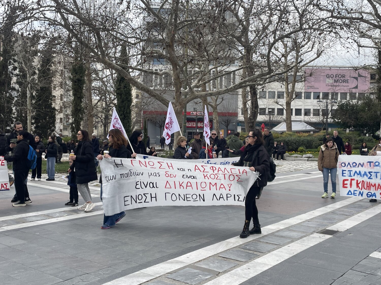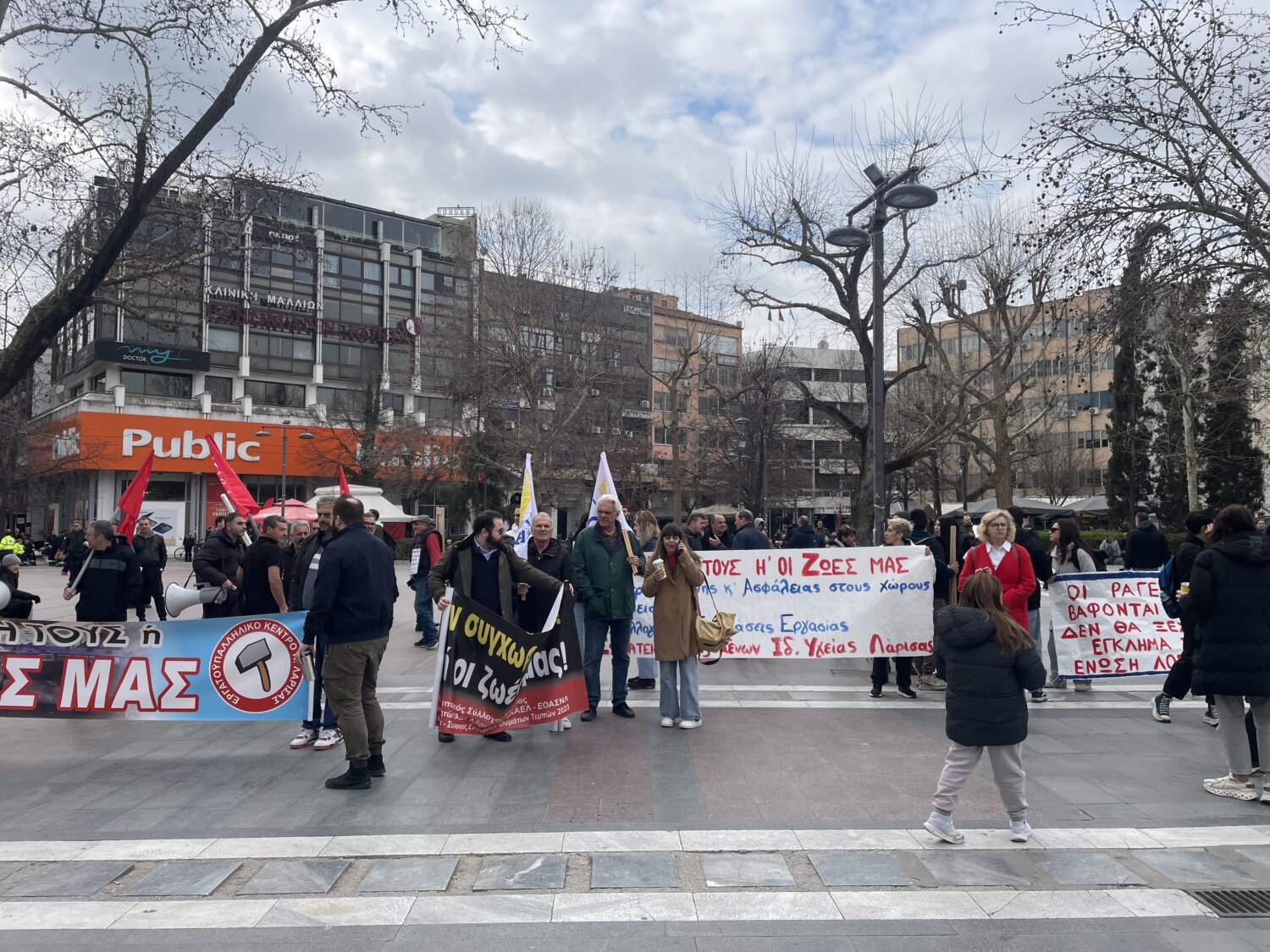 Προσέρχεται ο κόσμος στην Κεντρική Πλατεία της Λάρισας όπου αναμένεται να διαδηλώσει για τη συμπλήρωση τριών ετών από τη σιδηροδρομική τραγωδία των Τεμπών.