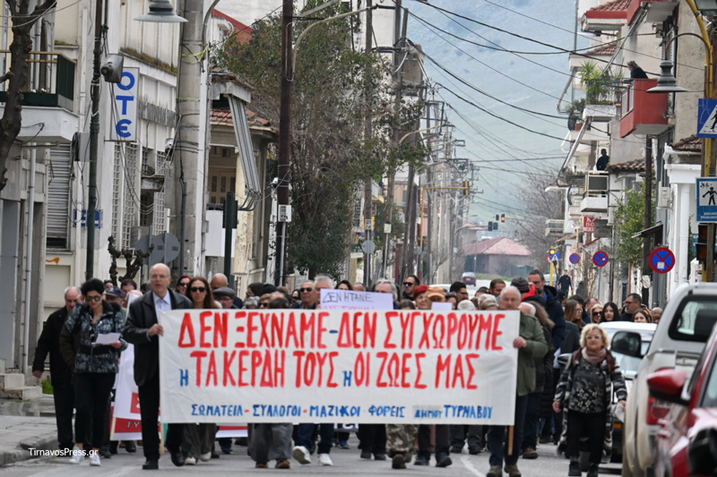Με τη συμμετοχή του Δήμου Τυρνάβου, συλλόγων, σωματείων και πλήθους πολιτών πραγματοποιήθηκε σήμερα συλλαλητήριο στο κέντρο του Τυρνάβου, με αφορμή τη συμπλήρωση τριών ετών από την τραγωδία των Τεμπών.