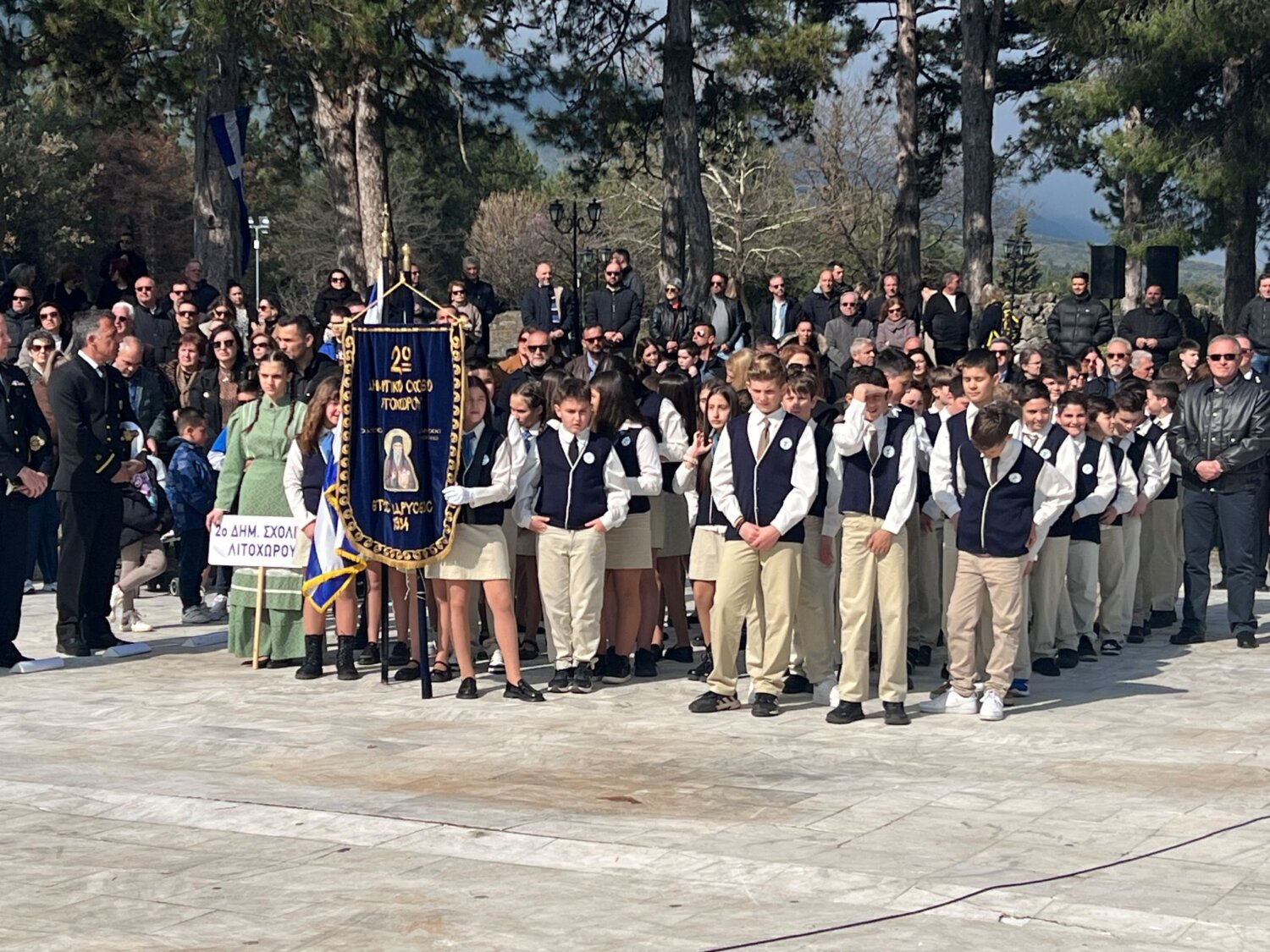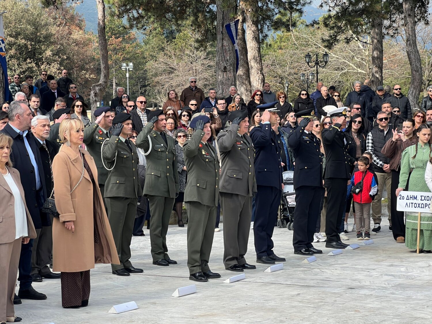 Στεφάνι κατέθεσαν ο υφυπουργός Ανάπτυξης, Σταύρος Καλαφάτης, ως εκπρόσωπος της Κυβέρνησης, ο αρχηγός της αξιωματικής αντιπολίτευσης, πρόεδρος του «ΠΑΣΟΚ-Κίνημα Αλλαγής», Νίκος Ανδρουλάκης, ο βουλευτής Πιερίας, Κομνηνός Δελβερούδης, ως εκπρόσωπος της Βουλής των Ελλήνων, η περιφερειάρχης Κεντρικής Μακεδονίας, Αθηνά Αηδονά, ο δήμαρχος Δίου-Ολύμπου, Βαγγέλης Γερολιόλιος, o εκπρόσωπος του Στρατηγού Διοικητή της Ανώτατης Στρατιωτικής Διοίκησης Ηπείρου-Μακεδονίας, διοικητής της 2ης Μηχανοκίνητης Μεραρχίας Πεζικού «Ελλασών», υποστράτηγος Αλέξανδρος Κουφόπουλος, ο πρόεδρος της δημοτικής κοινότητας Λιτοχώρου, Ευστράτιος Κυριακάκης, ο διευθυντής της Διεύθυνσης Αστυνομίας Πιερίας, Αστυνομικός Διευθυντής Γεώργιος Κουκουσέλας, ο εκπρόσωπος των Πυροσβεστικών Υπηρεσιών Πιερίας, αντιπύραρχος Σπυρίδωνας Κίτσος, ο εκπρόσωπος του Λιμενικού Τμήματος Πλαταμώνα, σημαιοφόρος Δημήτριος Σλούτσας, ο δήμαρχος Αμαθούντας Κύπρου, Κυριάκος Ξυδιάς, ο εκπρόσωπος του Συνδέσμου Εφέδρων Αξιωματικών Πιερίας, Δημήτριος Πόδας, ο πρόεδρος της Ένωσης Στρατιωτικών Περιφερειακής Ενότητας Πιερίας, Βασίλειος Κουτσιάδης, η διευθύντρια της Διεύθυνσης Πρωτοβάθμιας Εκπαίδευσης Πιερίας, Παρθένα Τριανταφυλλίδου, ο διευθυντής της Διεύθυνσης Δευτεροβάθμιας Εκπαίδευσης Πιερίας, Γεώργιος Μακρής, καθώς και εκπρόσωποι της Εθνικής Αντίστασης, του κοινοβουλευτικού κόμματος «Ελληνική Λύση» και του Συλλόγου Κοκκινοπλιτών Νομού Πιερίας «Ο Όλυμπος».