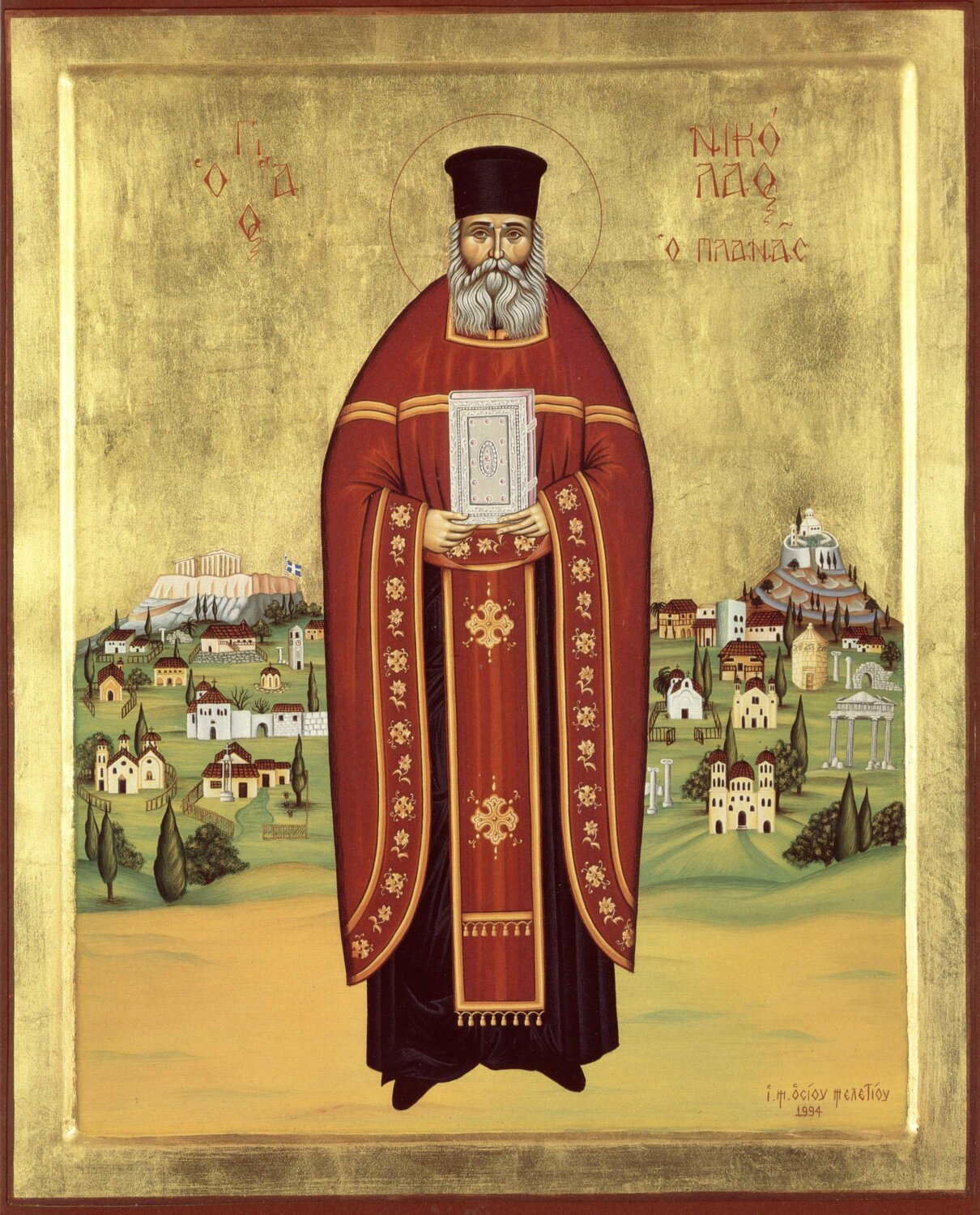 ΠΡΟΤΥΠΟ ΙΕΡΕΩΣ: Για πενήντα συνεχόμενα χρόνια, ο Άγιος λειτουργούσε καθημερινά από τις 8 το πρωί έως και τις 3 το μεσημέρι! Ήταν ανεπανάληπτες οι λειτουργίες του Αγίου. Ο ίδιος αγαπούσε τα μικρά ξωκλήσια τής Αθήνας, τα οποία καθημερινά επισκεπτόταν για να τελέσει το ευλογημένο καθήκον του. Τις Κυριακές και τις μεγάλες γιορτές παρέμενε στο ναό του, συχνά όμως πήγαινε στο εκκλησάκι του Προφήτου Ελισσαίου, στην οδό Άρεως στην Πλάκα, για αγρυπνίες. Ήταν οι πιο κατανυκτικές αγρυπνίες του Αγίου και όλο το εκκλησίασμα αισθανόταν την ευλογία. Σ’ αυτές τις συχνές αγρυπνίες στο ψαλτήρι στεκόντουσαν πάντα οι δυο κορυφαίοι λογοτέχνες, ο Αλέξανδρος Παπαδιαμάντης [περιγράφει ο άγιος των Γραμμάτων συχνά στα έργα του τις θείες εκείνες εμπειρίες] και ο Αλέξανδρος Μωραϊτίδης, που αγαπούσαν πολύ τον άγιο ιερέα και τον βοηθούσαν με το ψάλσιμό τους. Ο Άγιος Νικόλαος υπήρξε ο άνθρωπος του Θεού, ο λειτουργός ο άγιος του Υψίστου, ο άοκνος ιερουργός και λάτρης του Τριαδικού Θεού. Η μεγάλη του ευλάβεια, η απεριόριστη καλΟσύνη του, η υπερβολική του αφιλοχρηματία, η απλότητά του, το ακτινοβόλο ιερατικό του ήθος, η άφθαστη ιεροπρέπειά του, η ταπείνωσή του, η αγάπη του για την Θεία Λατρεία και οι λοιπές του αρετές, τον καταξίωσαν στη συνείδηση του λαού. Δεν αγάπησε ποτέ του τα πλούτη. Η ζωή του Αγίου ήταν απλή, όπως ήταν απλός σαν παιδί και ο ίδιος. Νήστευε αυστηρά, προσευχόταν συνεχώς, με όλη τη δύναμη της ψυχής του, αγαπούσε χωρίς διάκριση όλους και ποτέ του δεν κρατούσε χρήματα. Όσα και να του έδιναν από μόνοι τους διάφοροι άνθρωποι, ο Άγιος τα σταύρωνε και πηγαίνοντας στα στενά σοκάκια και στις φτωχογειτονιές μοίραζε επιδόματα ανάγκης σε ανήμπορες νεαρές κοπέλες, σε φτωχές χήρες γυναίκες, σε άπορους σπουδαστές και σε νεαρά ζευγάρια για τα πρώτα τους έξοδα. Υπήρξε Άνθρωπος προσευχής, του οποίου η ζωή ήταν μια διακονία πίστεως και αγάπης. Ήταν νηστευτής. Νήστευε όλες τις Σαρακοστές και το λάδι. Και την νηστεία του Τιμίου Σταυρού την άρχιζε από την 1η Σεπτεμβρίου, μέχρι την 14η . Επίσης και των Ταξιαρχών νήστευσε από τη 1η μέχρι και την 8η Νοεμβρίου. Απλός και πανέξυπνος, εύστοχος στις απαντήσεις του, συνδίαζε την απλότητα και την ιεροπρέπεια, την αφέλεια με την αγιότητα. Δεν είχε σπουδάσει σε Πανεπιστήμια, ούτε σε Εκκλησιαστικές Σχολές, ούτε σε Λύκεια και Γυμνάσια. Και ίσως να μη φοίτησε και σε καμία τάξη του τότε Ελληνικού Σχολείου. Όμως άριστα κατείχε την σοφία του Θεού. Το παρουσιαστικό του συγκλόνιζε τούς πάντες. Η λαμπερή διαπεραστική ματιά του γαλήνευε όσους ήταν κοντά του. Η απλοϊκή ομιλία του συγκινούσε ακόμα και τους πιο μορφωμένους επιστήμονες. Αν και ήταν ψευδός, και πολλές φορές τα λόγια του ακούγονταν αστεία, ποτέ κανένας δεν γελούσε. Αντίθετα μάλιστα. Τα δακρυσμένα μάτια όλων μαρτυρούσαν πόσο πολύ τα λόγια του μιλούσαν στις ψυχές τους. Σαν τον αντίκριζαν να περπατάει στο δρόμο οι γυναίκες έκαναν με ευλάβεια το σταυρό τους, οι άνδρες έκοβαν το βήμα τους για να προσπεράσει, οι αμαξάδες σταματούσαν την πορεία τους και κατέβαιναν και τα μικρά παιδιά έτρεχαν να …