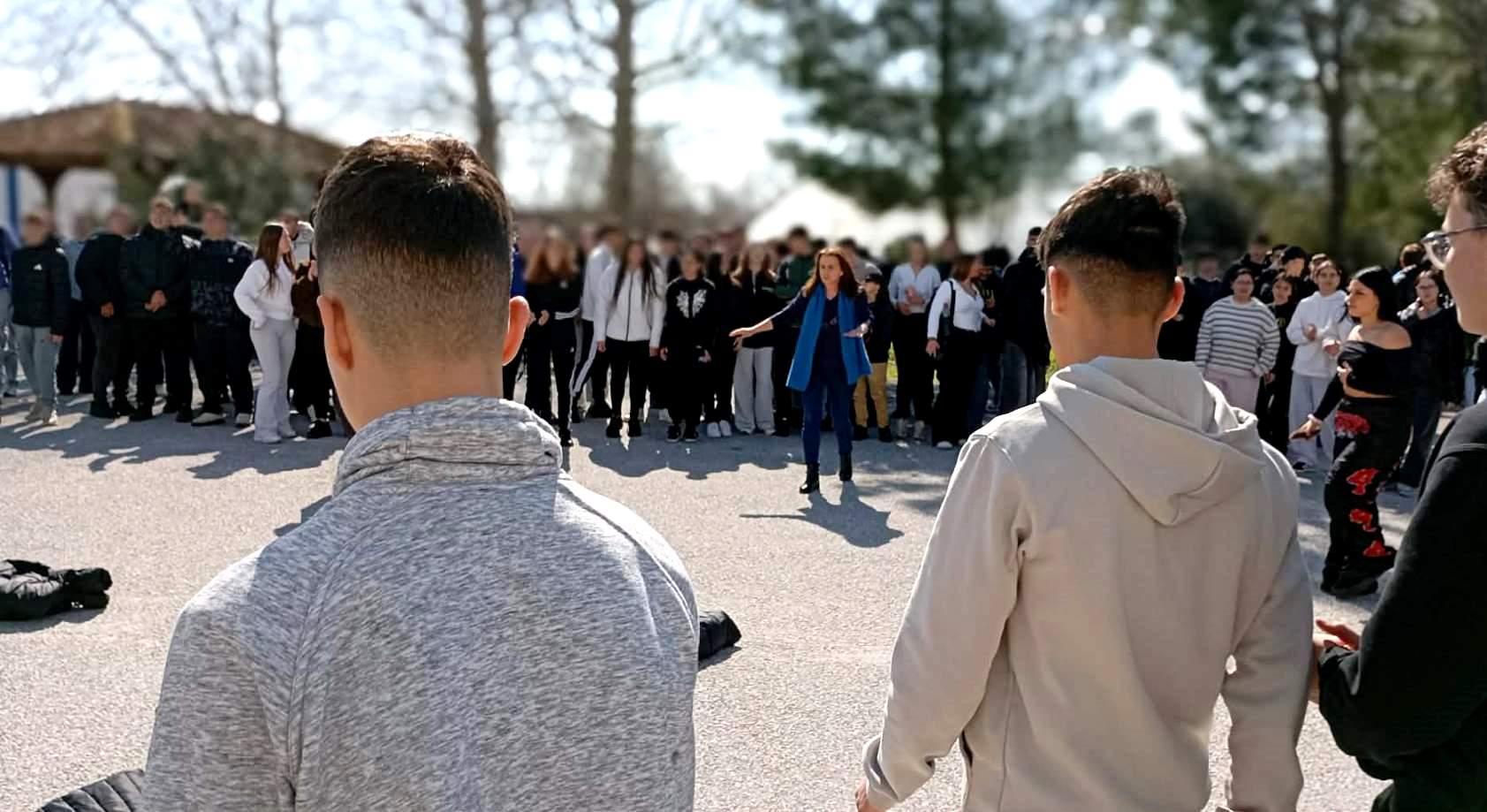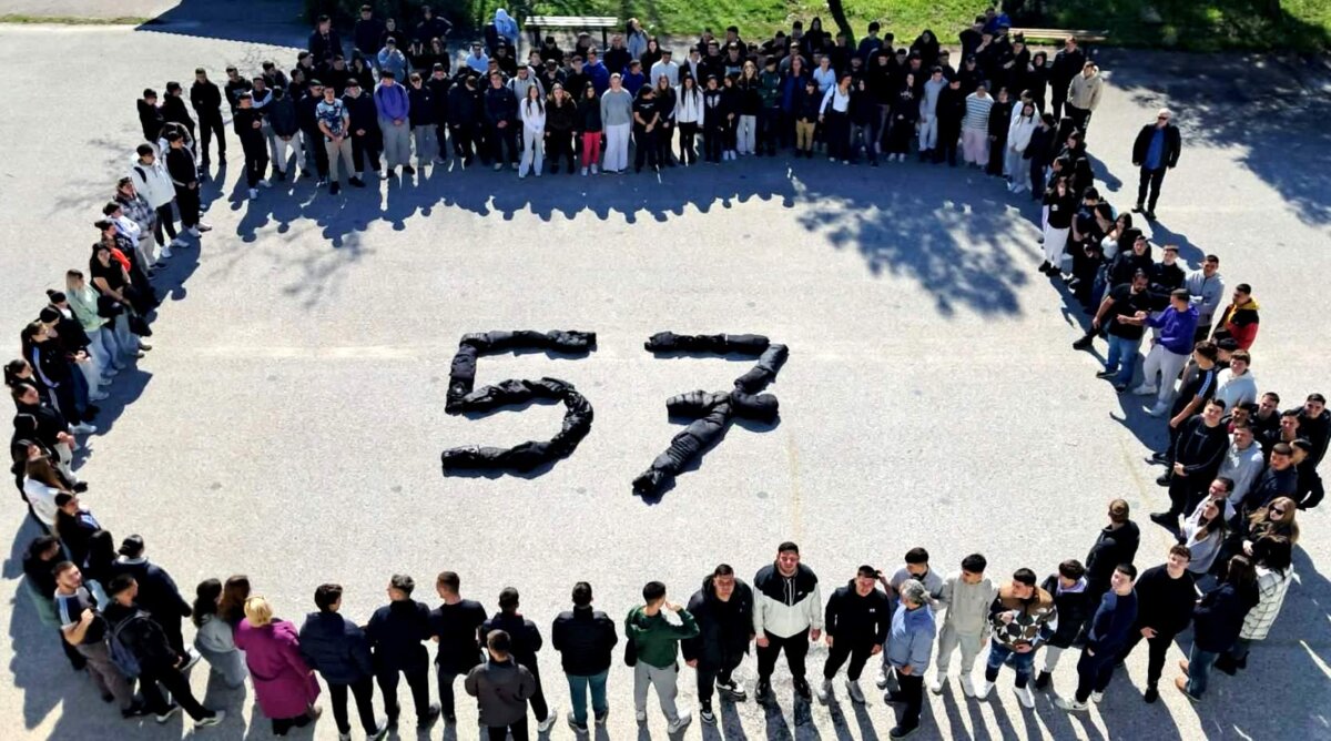 Αργότερα, με τη συμμετοχή όλου του σχολείου σχηματίστηκε ο αριθμός 57, με μαύρα μπουφάν παιδιών, δηλώνοντας με βροντερή φωνή «Ποτέ ξανά !». Όλοι οι μαθητές ανταποκρίθηκαν στο κάλεσμα του 15μελούς θετικά και με ενθουσιασμό, για αυτό και αξίζουν θερμά συγχαρητήρια, που κατάφεραν να εκφράσουν τα συναισθήματά τους για τη διατήρηση της μνήμης και της ανάγκη απόδοσης δικαιοσύνης.