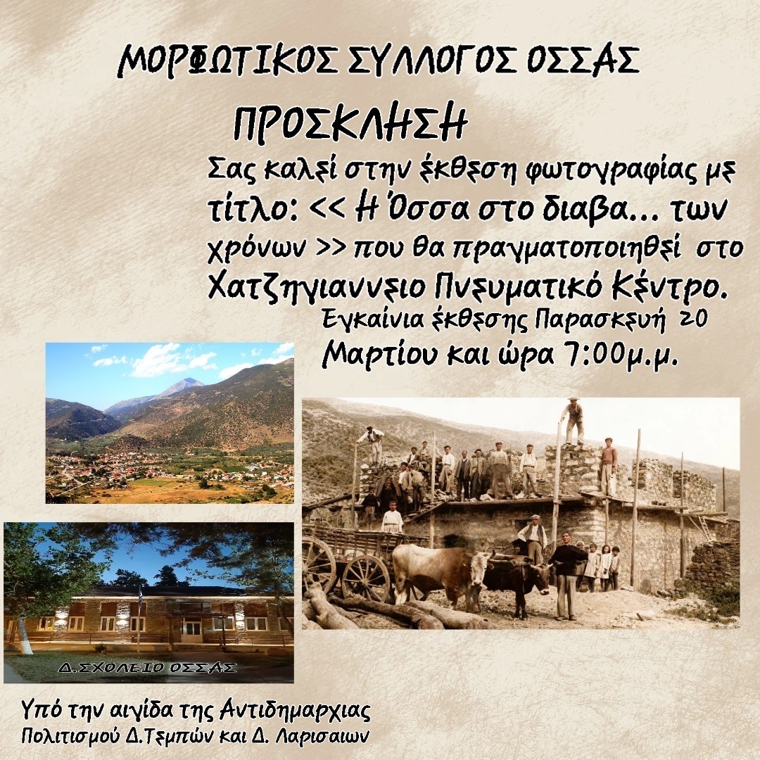 Ο Μορφωτικός Σύλλογος Όσσας θα παρουσιάσει την Παρασκευή 20 Μαρτίου και ώρα 7:00 μ.μ. στο Χατζηγιαννειο Πνευματικό Κέντρο στη Λάρισα την έκθεση φωτογραφίας με τίτλο «Η Όσσα στο διάβα… των χρόνων».