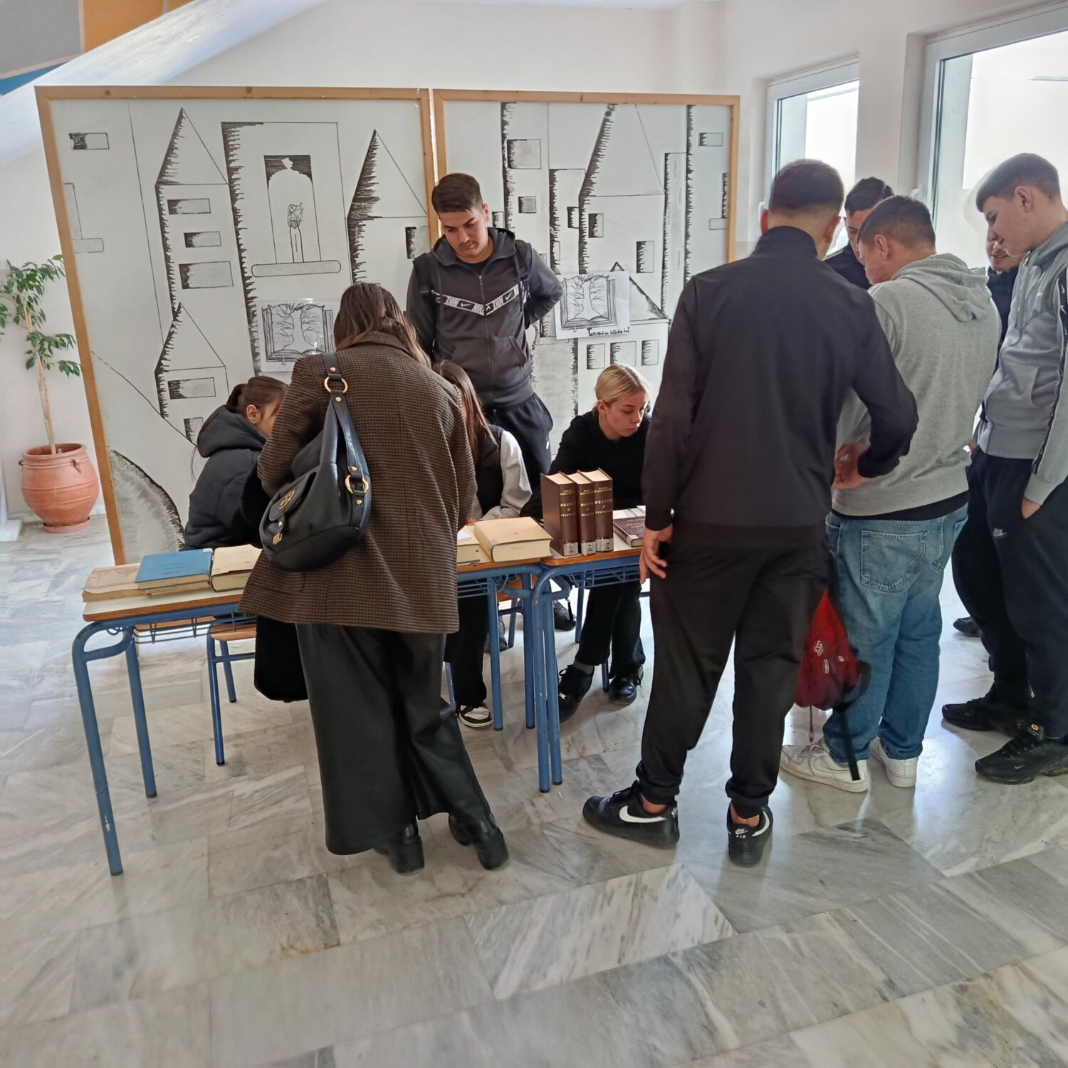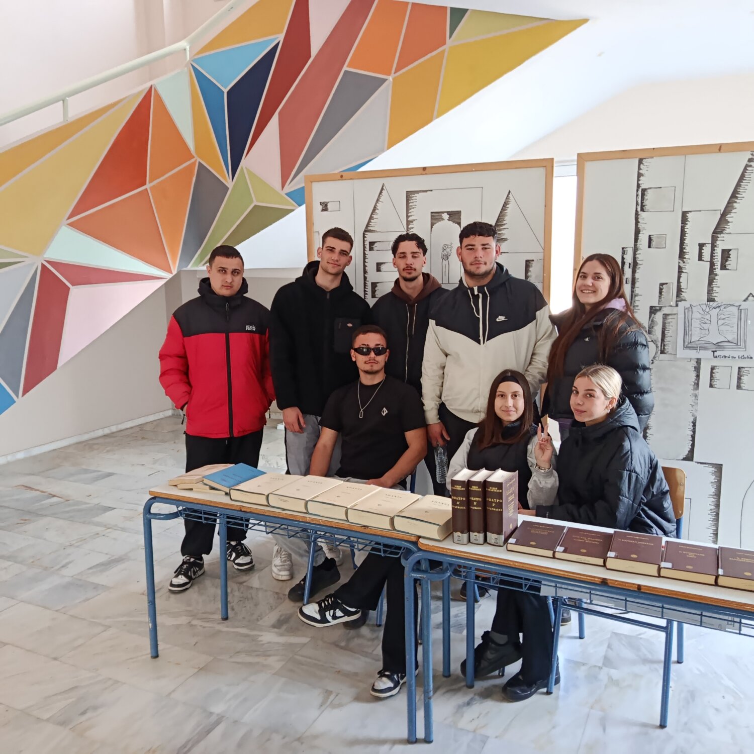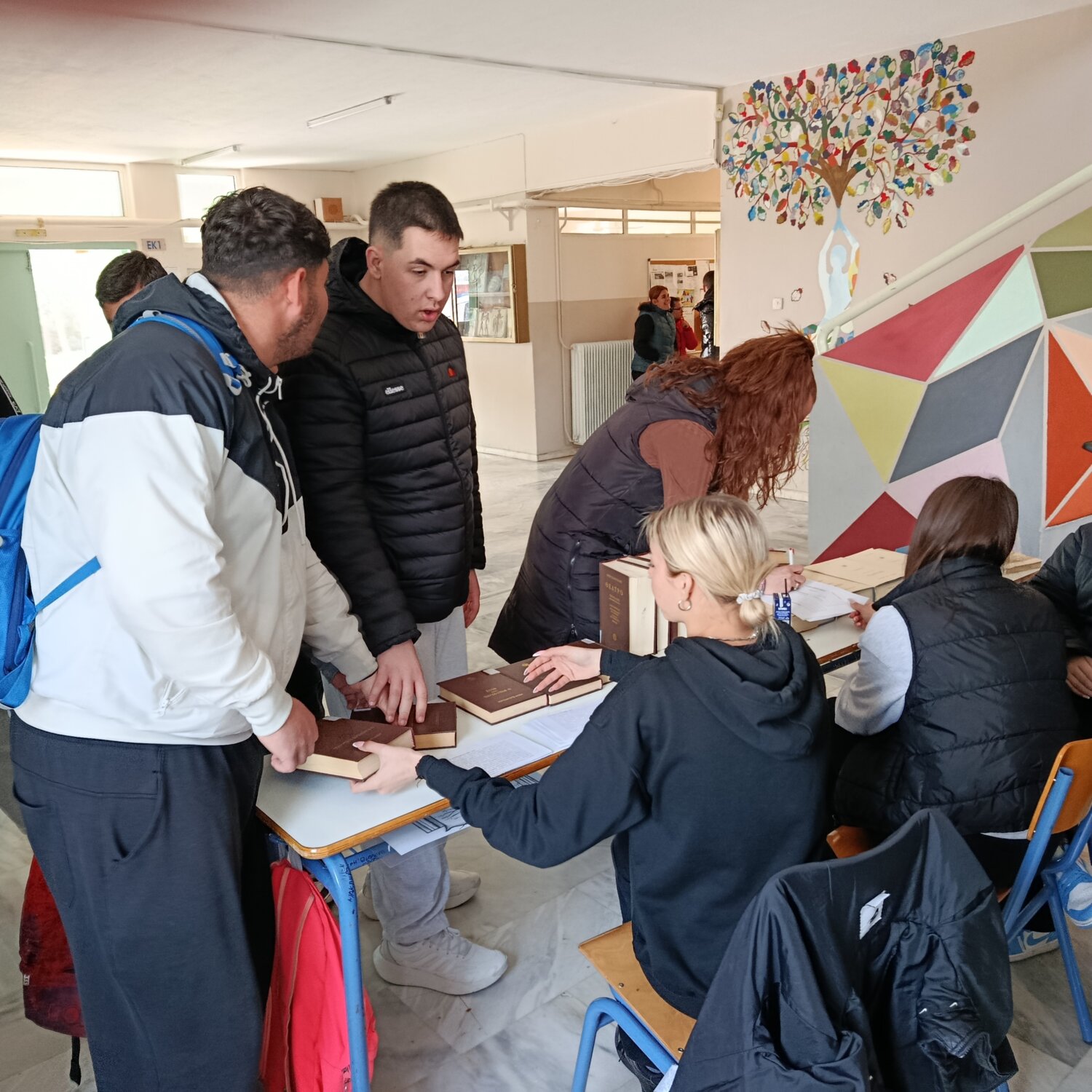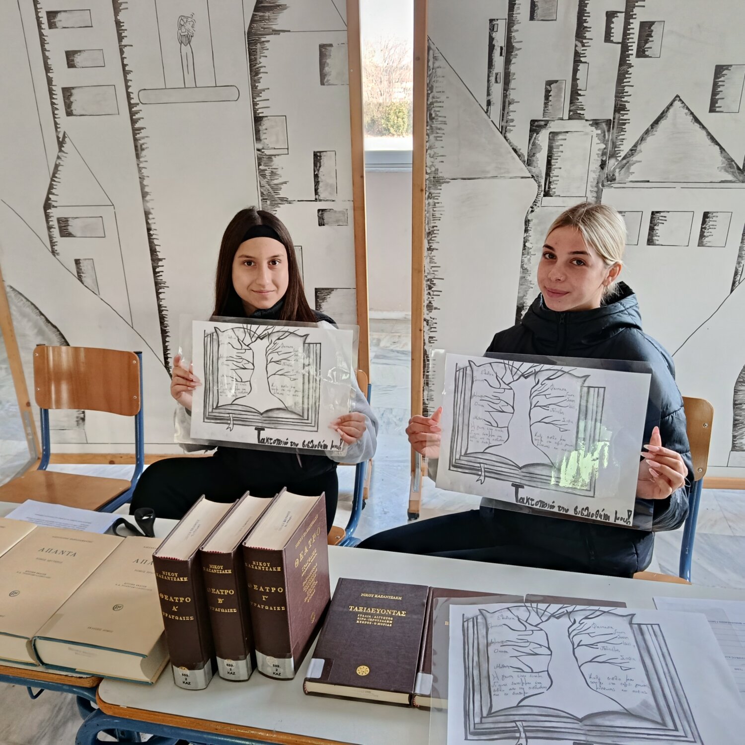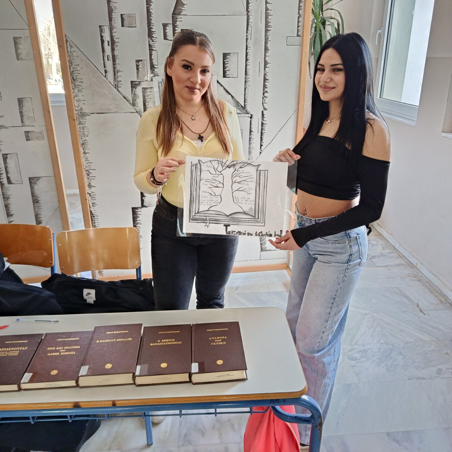 Μια ομάδα μαθητών του ΕΠΑΛ Τυρνάβου που συμμετέχει στο Πρόγραμμα «Τακτοποιώ την βιβλιοθήκη μας», πήρε σήμερα από τα ράφια της βιβλιοθήκης του σχολείου τους τα βιβλία δυο Ελλήνων συγγραφέων και κάλεσε μαθητές και εκπαιδευτικούς του σχολείου να τα δανειστούν και να τα διαβάσουν.