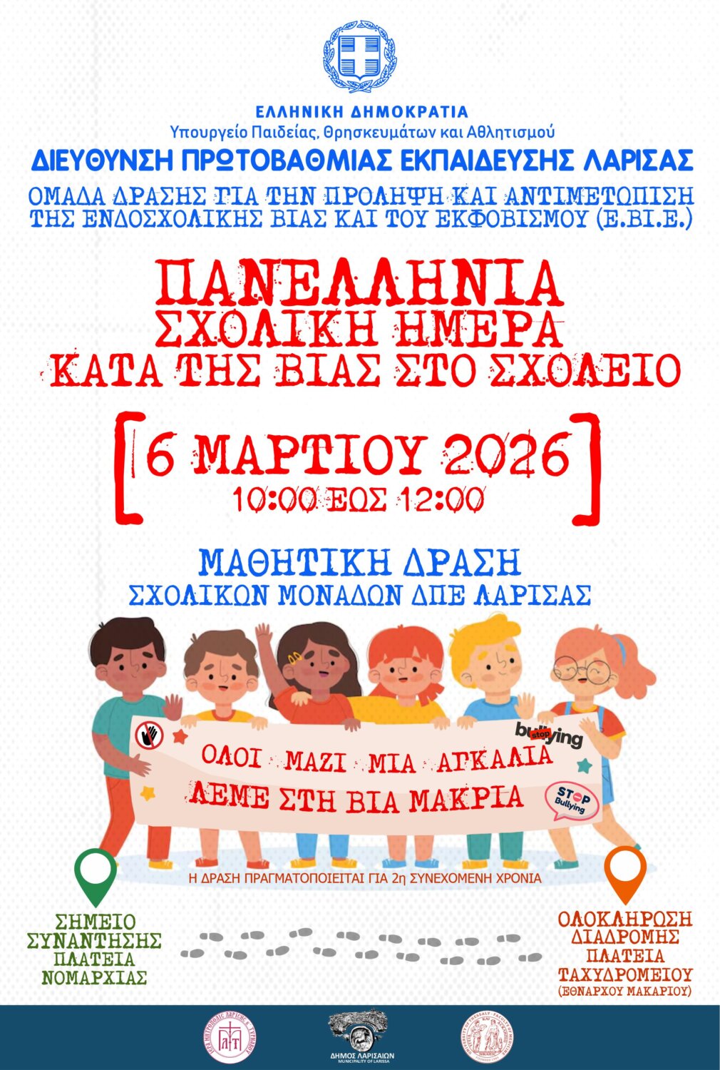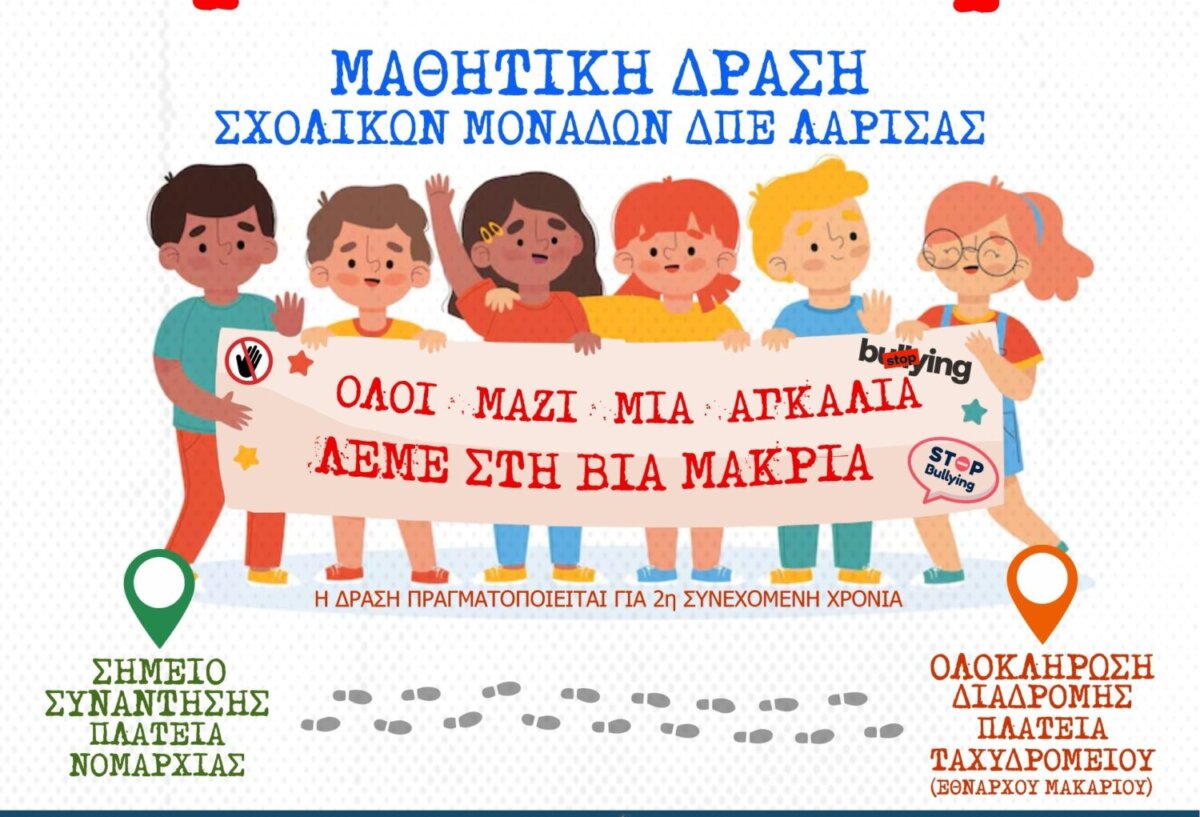 Η Διεύθυνση Πρωτοβάθμιας Εκπαίδευσης Λάρισας και η Ομάδα Δράσης της για την Πρόληψη και Αντιμετώπιση της Ενδοσχολικής Βίας και του Εκφοβισμού (Ε.ΒΙ.Ε.), σε συνεργασία με την Ιερά Μητρόπολη Λαρίσης και Τυρνάβου, τον Δήμο Λαρισαίων και το Τμήμα Ιατρικής του Πανεπιστημίου Θεσσαλίας, διοργανώνει τη μαθητική εκδήλωση με τίτλο: «Όλοι μαζί μια αγκαλιά, λέμε στη βία “μακριά”», την Παρασκευή 6/3/2026 και ώρες 10:00 π.μ.-12:00 μ.