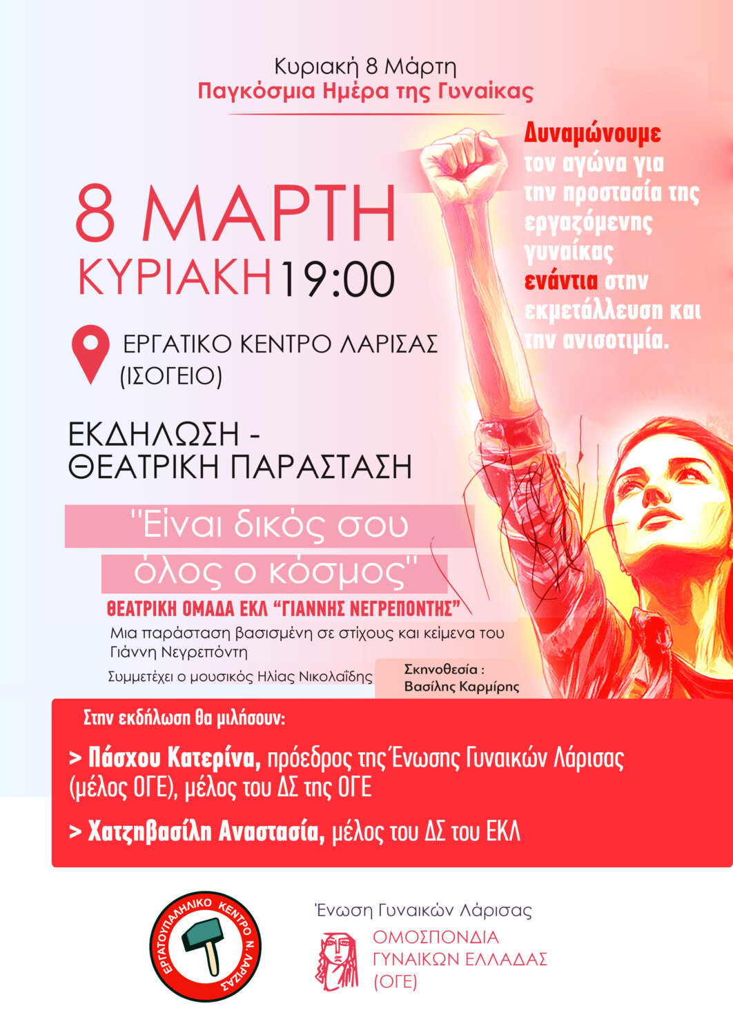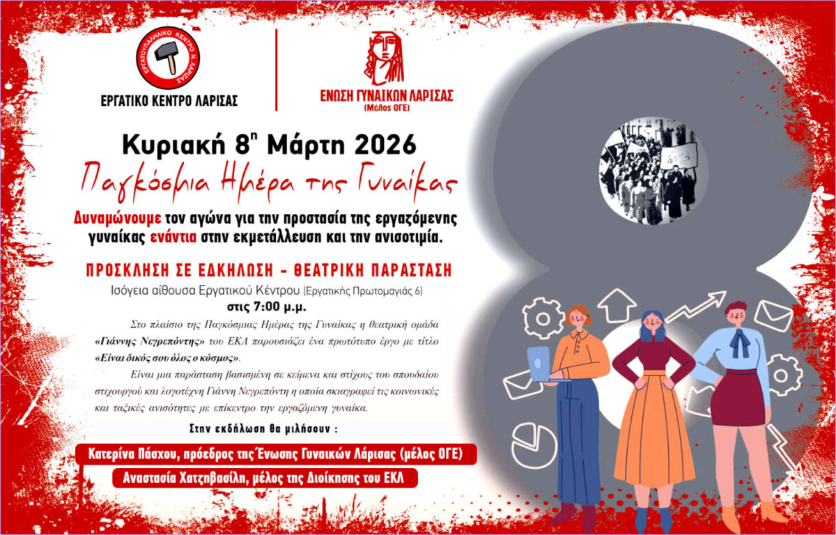 Την Κυριακή 8η Μάρτη 2026, στην Παγκόσμια Ημέρα της Γυναίκας θα πραγματοποιηθεί εκδήλωση της Ένωσης Γυναικών Λάρισας (μέλος ΟΓΕ) και του Εργατικού Κέντρου Λάρισας στην ισόγεια αίθουσα Εργατικού Κέντρου (Εργατικής Πρωτομαγιάς 6) στις 7:00 μμ: