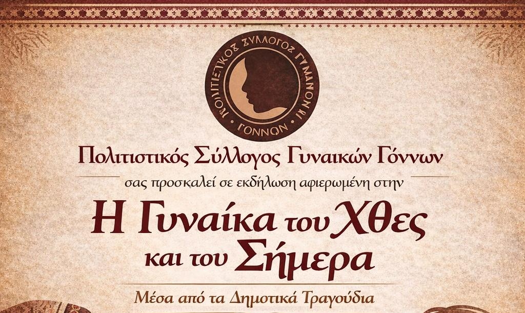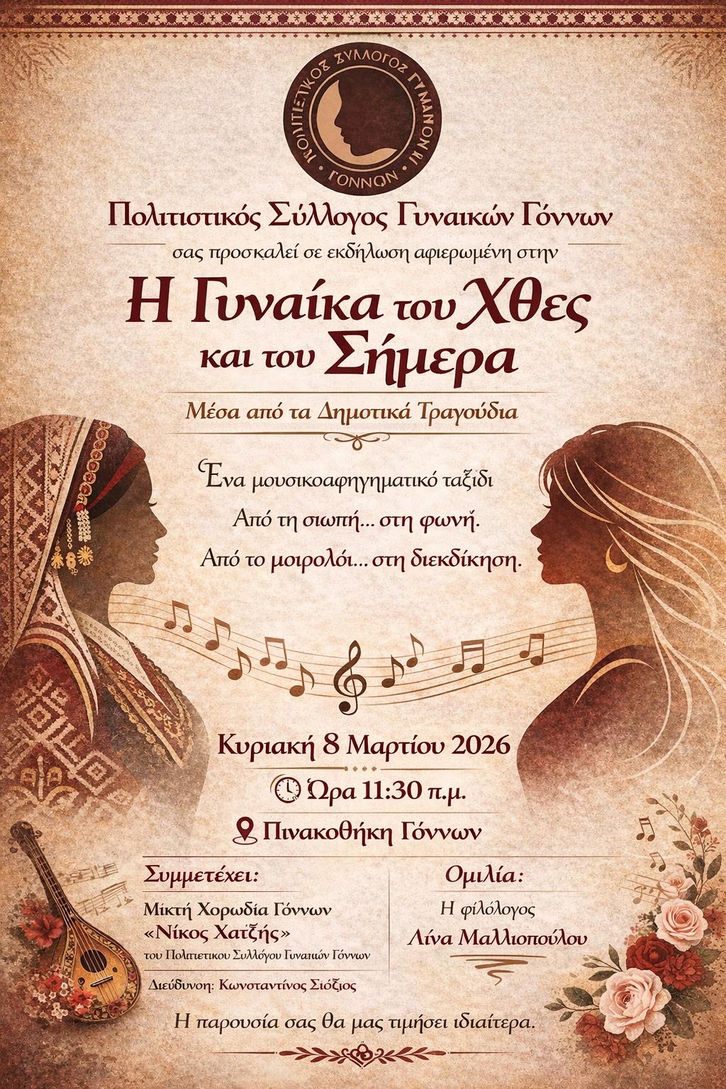 Ο Πολιτιστικός Σύλλογος Γυναικών Γόννων διοργανώνει εκδήλωση για την Παγκόσμια Ημέρα της Γυναίκας, την Κυριακή 8 Μαρτίου 2026 και ώρα 11:30 π.μ., στην Δημοτική Πινακοθήκη Γόννων.