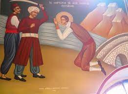 ΤΟ ΜΑΡΤΥΡΙΟ: Φυσικά η δικαστική… διαδικασία ήταν συνοπτική και η ετυμηγορία των δικαστών προαποφασισμένη: «θάνατος με μαρτύριο». Ο Γεώργιος ρίχτηκε αρχικά γυμνός σε καυτό λουτρό, εν συνεχεία τρυπήθηκε με σιδερένια νύχια, ακολούθησε το πετάλωμα των ποδιών του, για να ολοκληρωθεί η πρώτη φάση του μαρτυρίου του με διαπόμπευση στους δρόμους του Τυρνάβου. Έπειτα τον κάρφωσαν σε στύλο και αφού τον έδεσαν με σκοινιά βουτηγμένα σε πίσσα και πετρέλαιο, τον έβαλαν φωτιά. Ο Άγιος Νεομάρτυρας προς απογοήτευση των Αγαρηνών, όχι απλώς δεν πέθανε, αλλά δεν υπέστη, χάρι στη Θεία Χάρη και βοήθεια, το παραμικρό έγκαυμα! Στις ιστορήσεις των εικόνων παρουσιάζονται και άλλες σκηνές βασανισμών, όπως στραγγαλισμοί, εξαρθρώσεις, κτυπήματα με το σπαθί, τοποθέτηση πυρακτωμένου σιδερένιου στεφανιού πάνω στο γυμνό σώμα του Νεομάρτυρος. Εξοργισμένοι οι Οθωμανοί, εν τέλει, οδήγησαν τον Γεώργιο στη γέφυρα του Τυρνάβου, όπου και τον αποκεφάλισαν. Η ημέρα του θανάτου του ήταν η 5η Μαρτίου 1818, ημέρα Τρίτη, μετά την Κυριακή της Ορθοδοξίας. Πάνω στο άνθος της νιότης του, ο εικοσάχρονος αθλητής της πίστης του Χριστού, πορεύτηκε προς την επουράνια και αιώνια Βασιλεία των Ουρανών στεφανωμένος, θριαμβευτής, Μάρτυρας. Το σώμα του Αγίου ενταφιάστηκε στο σημείο του μαρτυρίου του, κάτω από τη γέφυρα του Τυρνάβου. Ο Άγιος Νικόδημος Αγιορείτης έγραψε: «Τα τίμια λείψανα θέλει δοξάσει (ο Θεός) εδώ κάτω εις την γην ή με την επιφάνεια του Φωτός του ή και με άλλα σημεία και θαύματα, καθὼς ήθελε κρίνει η θεία δικαιοσύνη Του, ή το ολιγώτερον ολιγώτερον θέλει τα τιμήση με την παρὰ των Χριστιανών προσκύνησιν και ευλάβεια». Πραγματικά, την πρώτη νύχτα του ενταφιασμού του Αγίου, οι σκοποί των οθωμανικών στρατώνων, που βρίσκονταν στην περιοχή, αντίκρισαν μια τεράστια στήλη φωτός να σημαδεύει τον τάφο του Γεωργίου. Όταν αναφέρθηκε το παράδοξο αυτό θαύμα στο Βελή, εκείνος διέταξε να καλέσουν από τη Ραψάνη, το συντομότερο, τους συγγενείς του Αγίου για να ξεθάψουν και να παραλάβουν το λείψανό, πλην της κάρας του Αγίου που, πιθανώς, εξαφάνισαν οι Οθωμανοί. Πραγματικά με …
