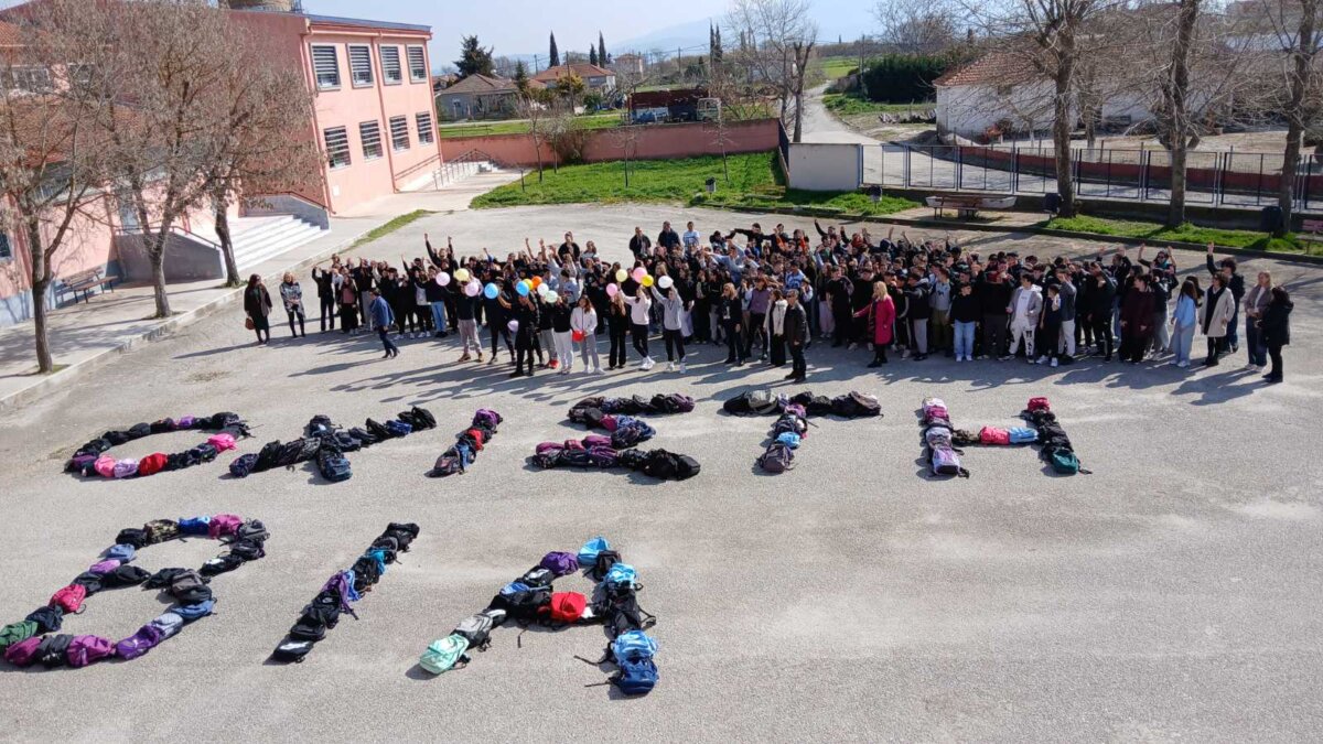 Στη συνέχεια, το μήνυμά της σημερινής ημέρας αλλά και κάθε ημέρας ακούστηκε δυνατά από την αυλή του σχολείου! Σε μια συμβολική κίνηση ενότητας, οι μαθητές χρησιμοποίησαν τις σχολικές τους τσάντες για να σχηματίσουν τη φράση «ΟΧΙ ΣΤΗ ΒΙΑ», δημιουργώντας μια εικόνα που αποτυπώνει τη συλλογική μας δέσμευση για ένα ασφαλές σχολικό περιβάλλον.