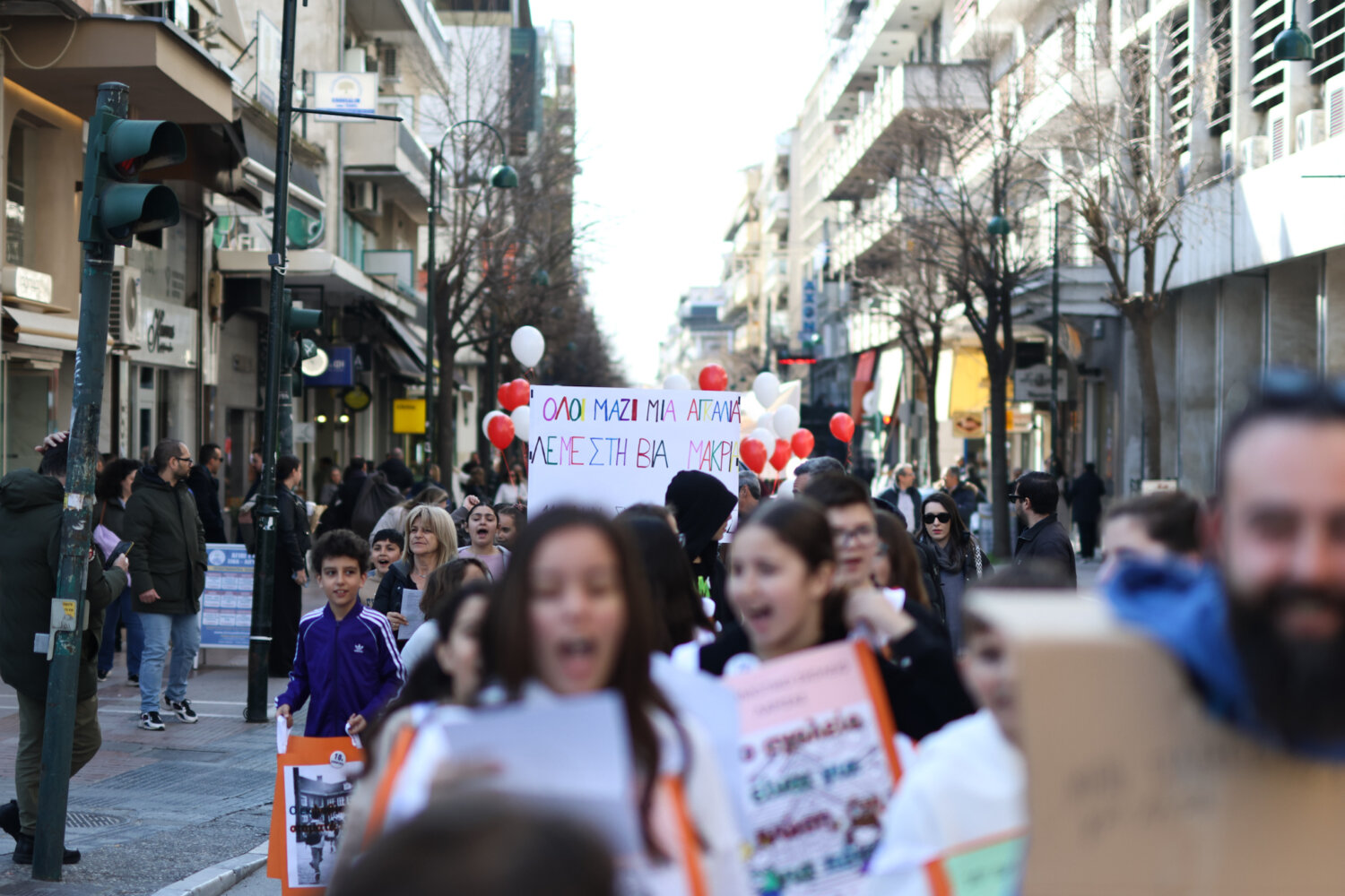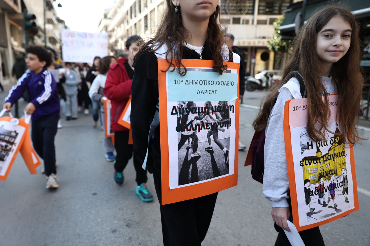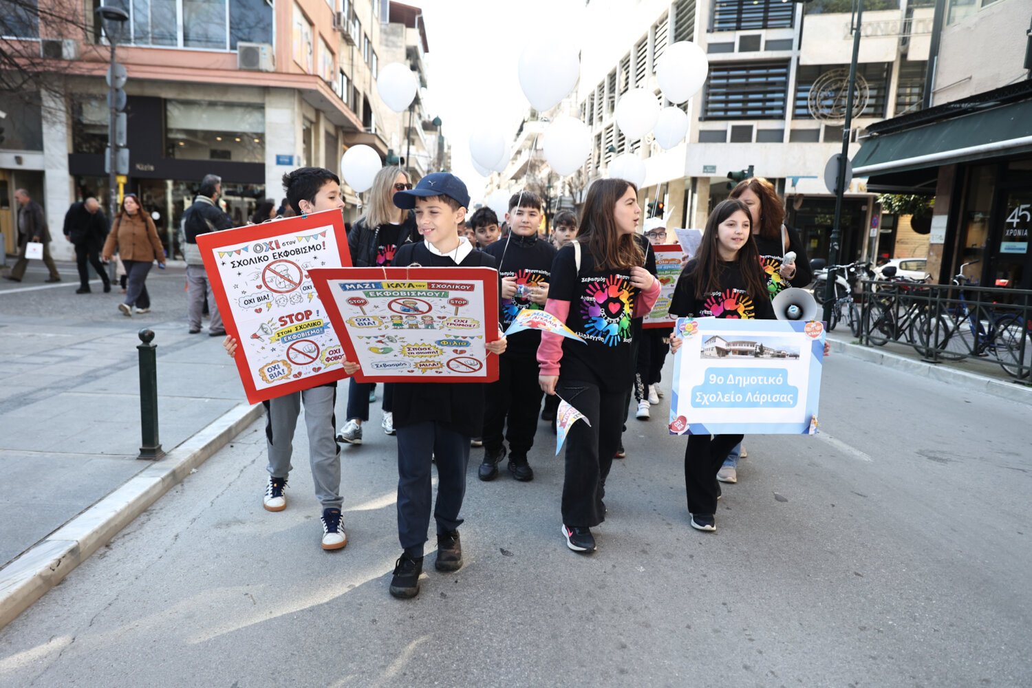 Το πρωί της Παρασκευής πλήθος μαθητών και μαθητριών από Δημοτικά Σχολεία και Νηπιαγωγεία της Λάρισας, συνοδεία εκπαιδευτικών και γονέων/κηδεμόνων- συγκεντρώθηκαν στην Πλατεία Νομαρχίας και κατευθύνθηκαν διά μέσου των οδών Παπαναστασίου, Κύπρου και Ασκληπιού, στην Πλατεία Εθνάρχου Μακαρίου (Ταχυδρομείου), όπου αυτήν την ώρα παρουσιάζουν δρώμενα, τραγούδια, ποιήματα και εικαστικά έργα, με θέμα τη φιλία, τη συμφιλίωση και την εξάλειψη της βίας.