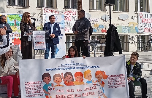 Με την ενθουσιώδη συμμετοχή εκατοντάδων μαθητών και μαθητριών Δημοτικών Σχολείων και Νηπιαγωγείων της Διεύθυνσης Πρωτοβάθμιας Εκπαίδευσης Λάρισας, πραγματοποιήθηκε την Παρασκευή 6/3/2026, η μαθητική δράση με τίτλο: «Όλοι μαζί μια αγκαλιά, λέμε στη βία μακριά», με αφορμή την Πανελλήνια Ημέρα κατά της Ενδοσχολικής Βίας και του Εκφοβισμού.