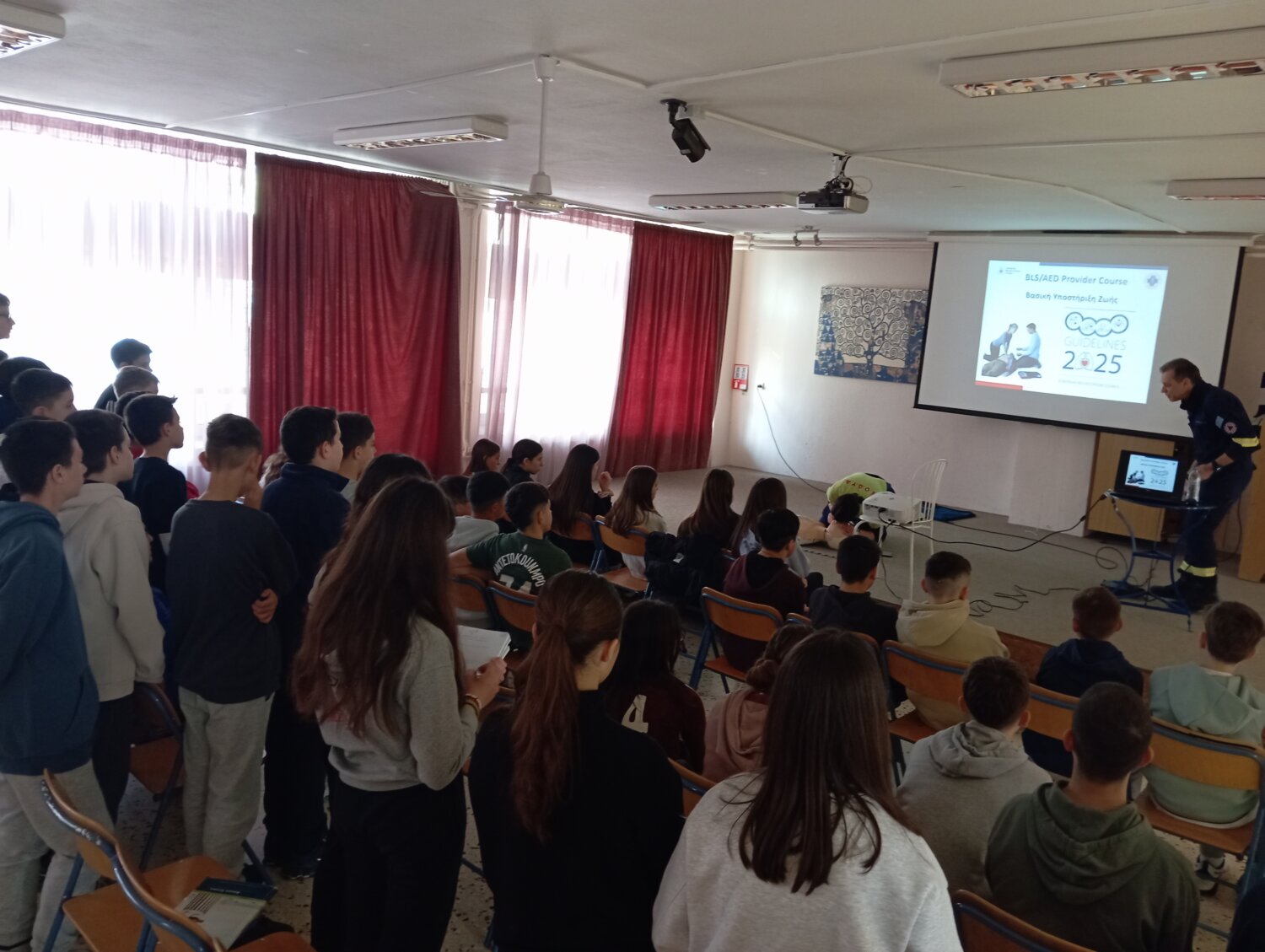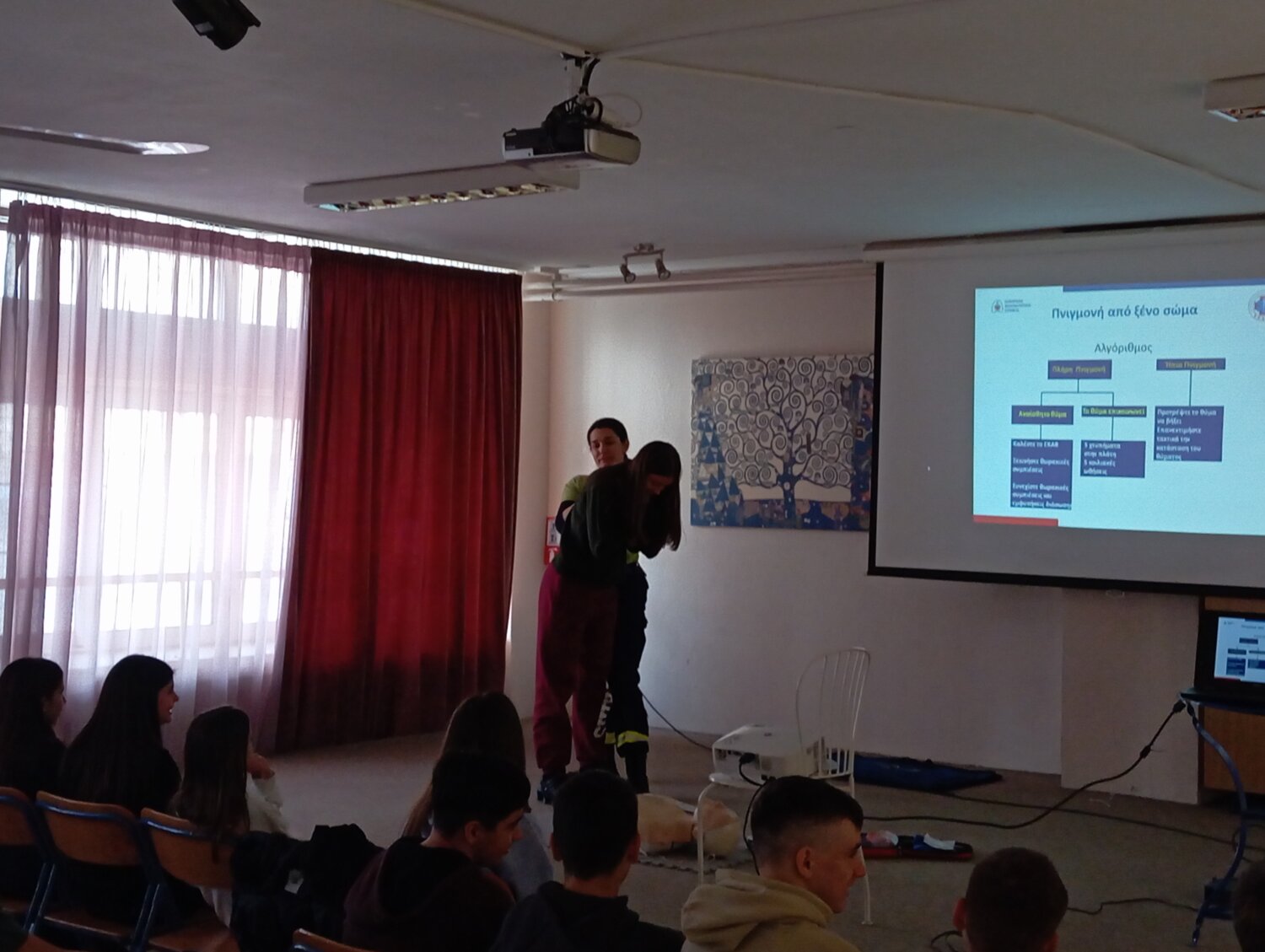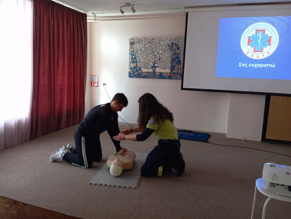 Οι μαθητές ενημερώθηκαν για βασικές και ιδιαίτερα σημαντικές δεξιότητες παροχής πρώτων βοηθειών, όπως η Καρδιοαναπνευστική Αναζωογόνηση (ΚΑΡΠΑ), η χρήση απινιδωτή και η αντιμετώπιση πνιγμονής. Την ενημέρωση και εκπαίδευση πραγματοποίησαν η κα Καλαϊτζή Αφροδίτη και ο κ. Ευστρατιάδης Αρχοντής Βασίλειος, μέλη της ομάδας.