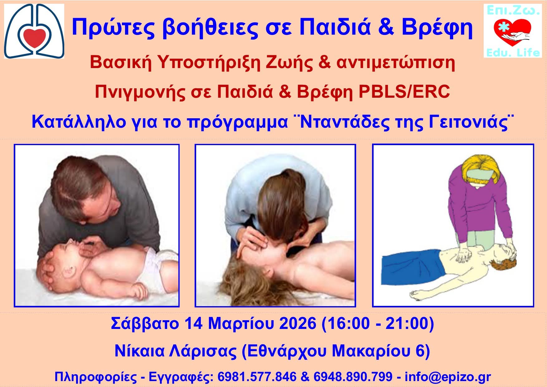 Το Σάββατο 14 Μαρτίου 2026 το απόγευμα (16:00 – 21:00), θα υλοποιηθεί το πιστοποιημένο σεμινάριο ¨Βασική Υποστήριξη Ζωής & αντιμετώπιση πνιγμονής σε Παιδιά & Βρέφη – PBLS, ERC¨, στη Νίκαια Λάρισας (Εθνάρχου Μακαρίου 6).