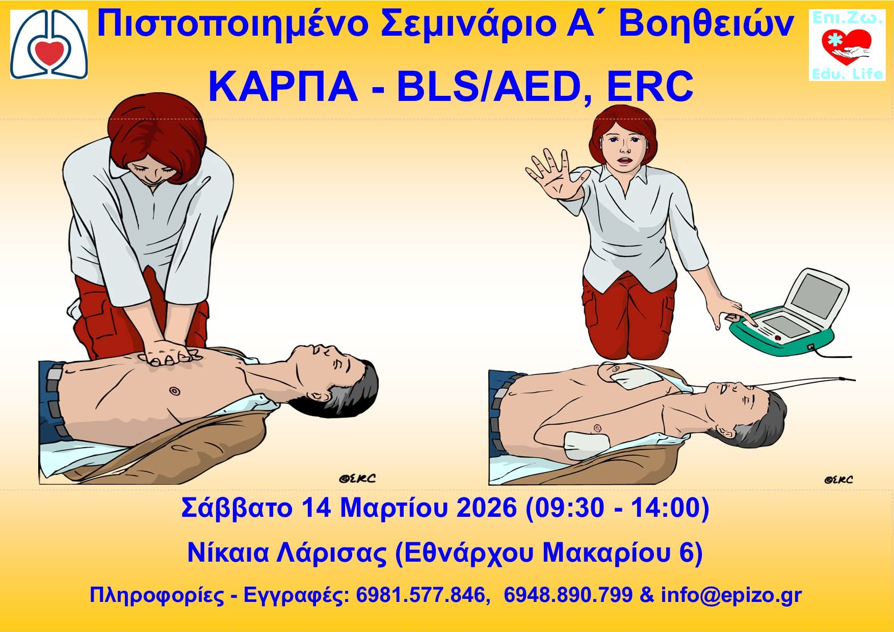 Το Σάββατο 14 Μαρτίου 2026 το πρωί (09:30 – 14:00), θα υλοποιηθεί το πιστοποιημένο σεμινάριο ¨Βασική Υποστήριξη Ζωής με χρήση Αυτόματου Εξωτερικού Απινιδωτή (BLS/AED, ERC)¨, στη Νίκαια Λάρισας (Εθνάρχου Μακαρίου 6).