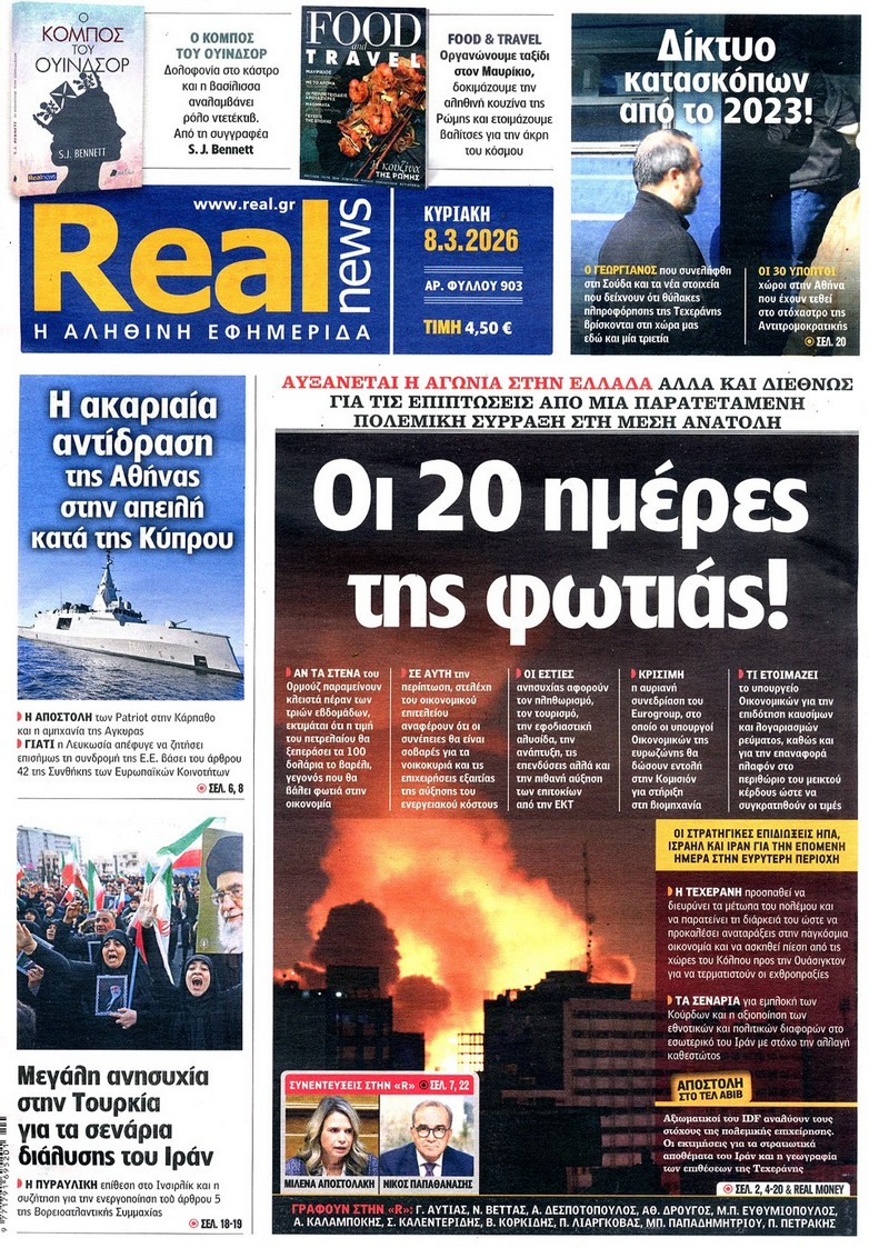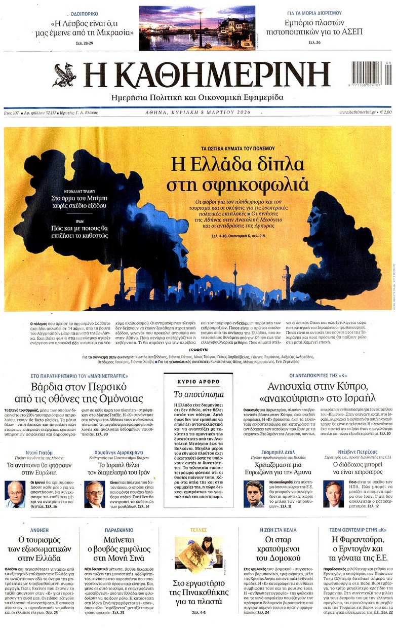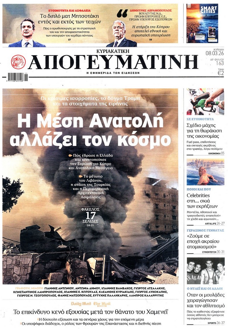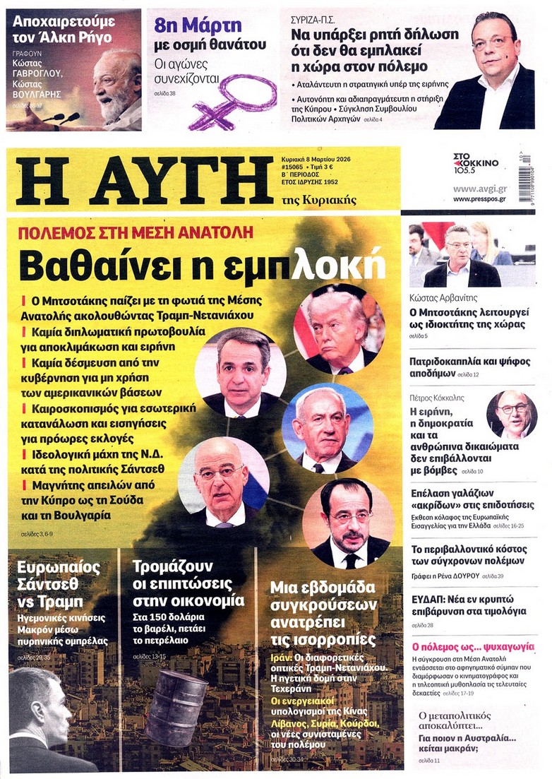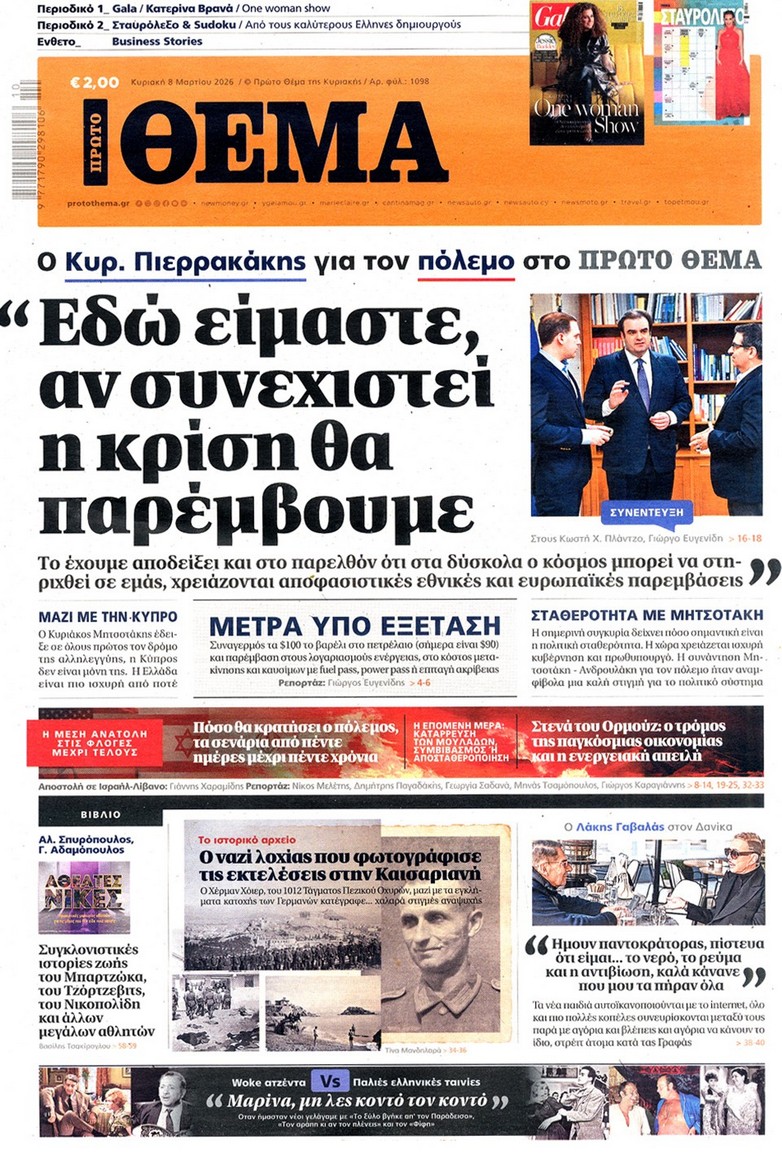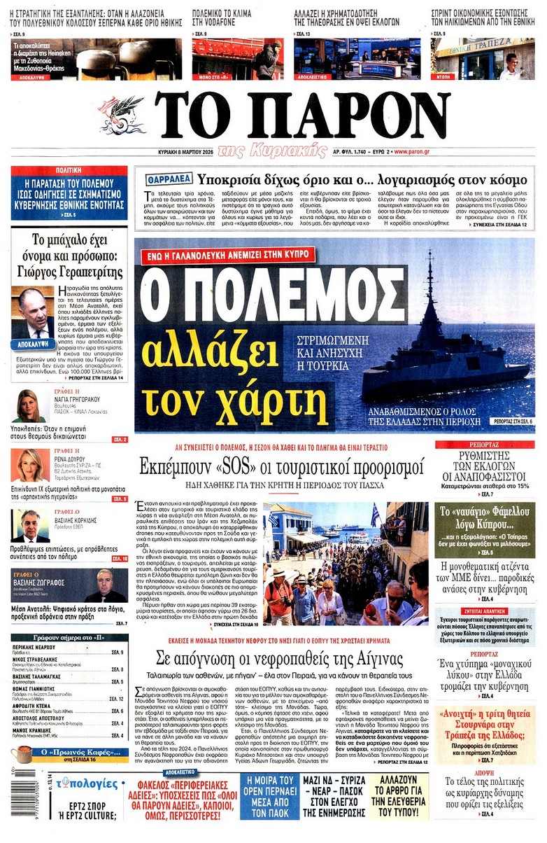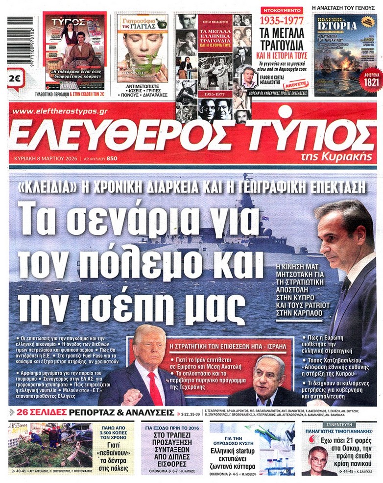 Τα σενάρια για τον πόλεμο και για την τσέπη μας, οι φόβοι για τον πληθωρισμό και τον τουρισμό, οι κυβερνητικές παρεμβάσεις αν συνεχιστεί η κρίση και τα υπό εξέταση μέτρα και η αντίδραση της Αθήνας στην απειλή κατά της Κύπρου, στα πρωτοσέλιδα των κυριακάτικων εφημερίδων.