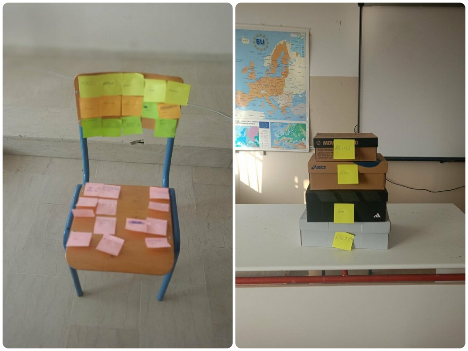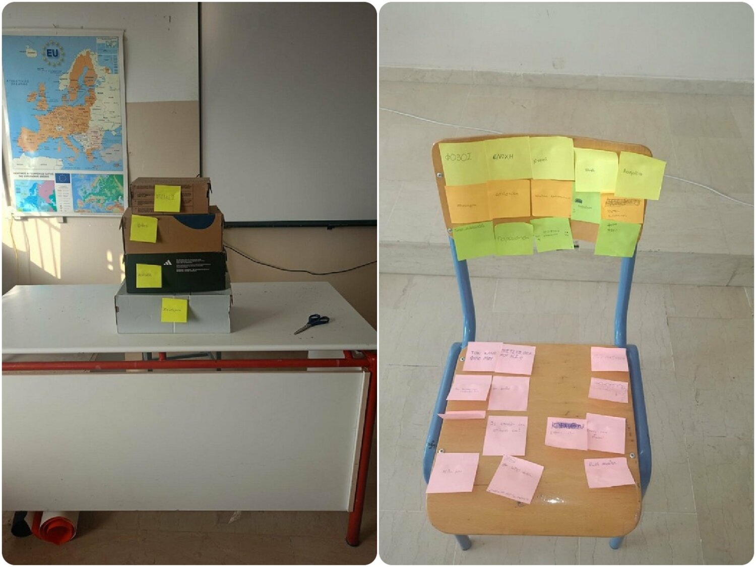 β. 1. Στην πρώτη δραστηριότητα, στο κέντρο της τάξης των τμημάτων της Γ΄ Τάξης Γυμνασίου τοποθετήθηκε μια άδεια καρέκλα, την οποία ονομάσαμε «ο αόρατος εχθρός». Οι μαθητές/μαθήτριες κλήθηκαν αρχικά να γράψουν σε μικρά χαρτάκια τα αρνητικά συναισθήματα που μπορεί να βιώνει ένα παιδί που γίνεται θύμα εκφοβισμού, όπως φόβο, μοναξιά, ντροπή, θλίψη και ανασφάλεια. Στη συνέχεια, τα παιδιά έγραψαν λόγια στήριξης και ενθάρρυνσης προς το θύμα, μετατρέποντας συμβολικά την καρέκλα από χώρο μοναξιάς σε χώρο συμπαράστασης και αποδοχής.
