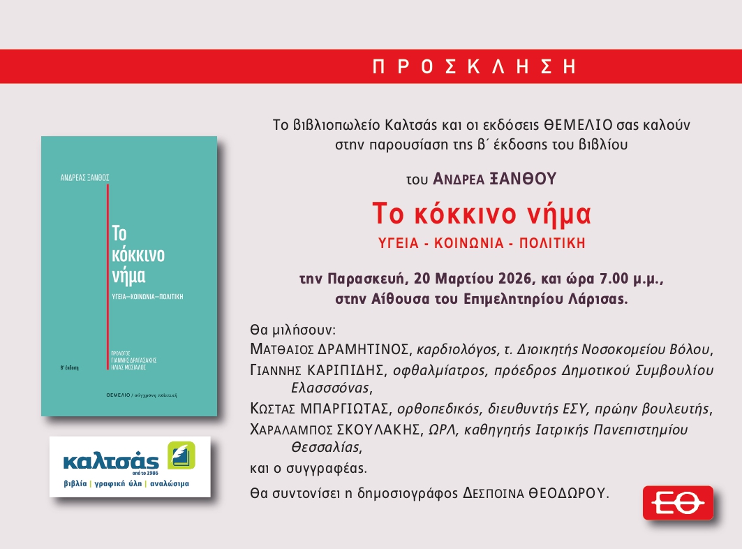 Η εκδήλωση διοργανώνεται από το Βιβλιοπωλείο Καλτσάς και τις εκδόσεις Θεμέλιο και θα πραγματοποιηθεί την Παρασκευή 20 Μαρτίου 2026, στις 7.00 το απόγευμα, στην αίθουσα του Επιμελητηρίου Λάρισας.