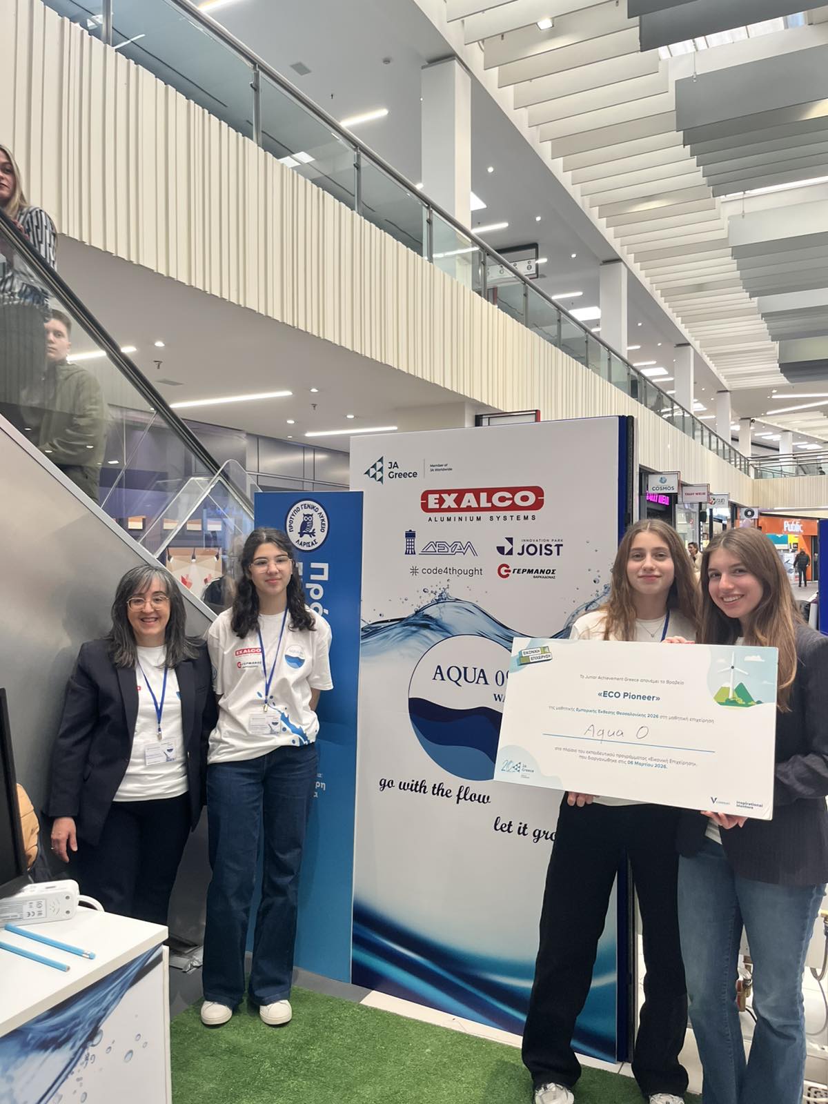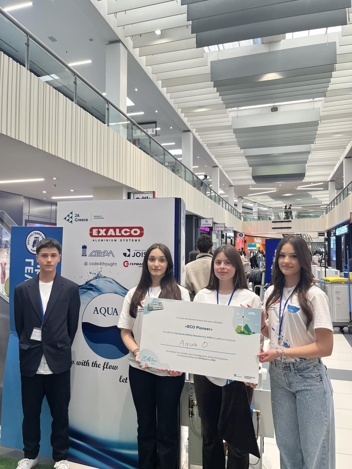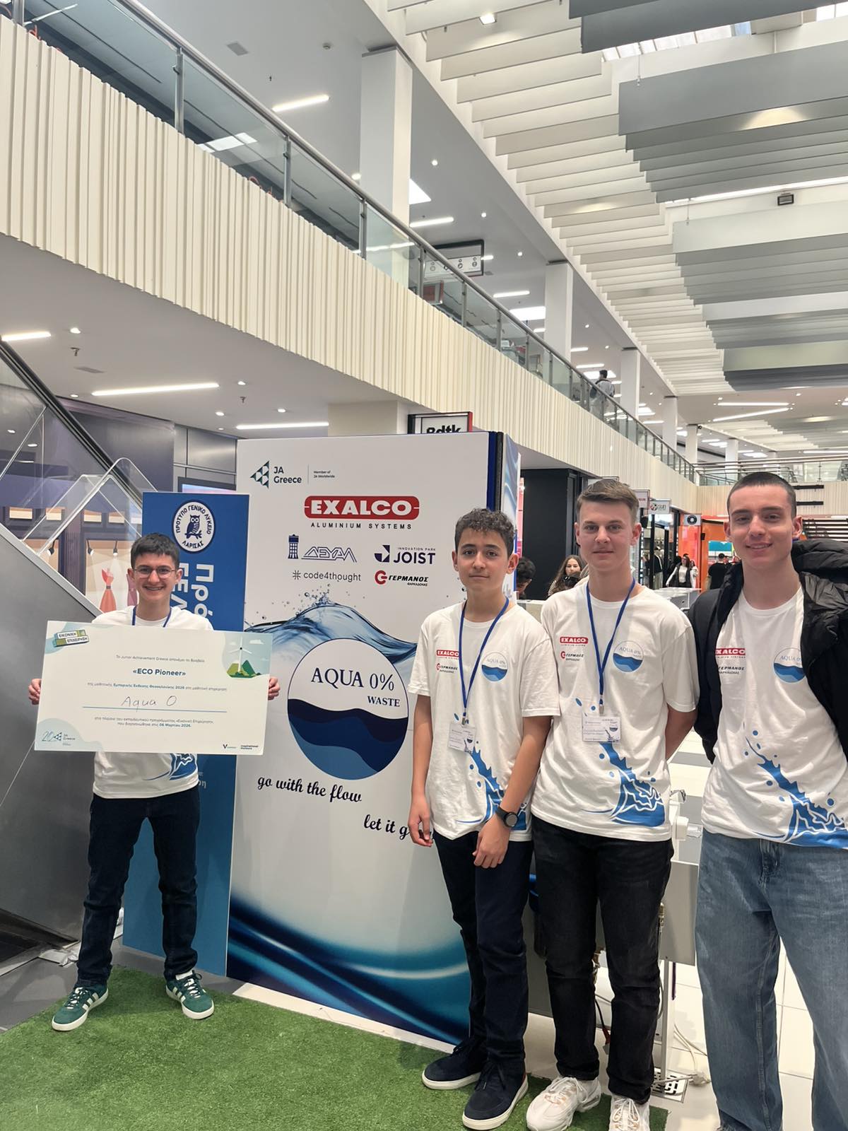 Το βραβείο της οικολογικής πρωτοπορίας “ECO Pioneer 2026” απέσπασε η καινοτόμος επιχειρηματική πρόταση “Aqua 0, Zero Waste” του Προτύπου Γενικού Λυκείου Λάρισας στον διαγωνισμό για την ανάδειξη των καλυτέρων μαθητικών «εικονικών επιχειρήσεων» από το Oργανισμό εκπαίδευσης και επιχειρηματικότητας “Junior Achievement Greece” (J.A. Greece). Η επιχειρηματική πρόταση παρουσιάσθηκε στην Εμπορική Μαθητική Έκθεση της Θεσσαλονίκης την περασμένη Παρασκευή, στην οποία συμμετείχαν σαράντα οκτώ (48) μαθητικές εικονικές επιχειρήσεις από Βόρεια Ελλάδα και Θεσσαλία και πραγματοποιήθηκε στις εγκαταστάσεις του «Mediterranean Cosmos». Mέγας χορηγός και σ΄ αυτή την προσπάθεια του σχολείου η γνωστή Λαρισινή βιομηχανία Αλουμινίου «Exalco A.E.».