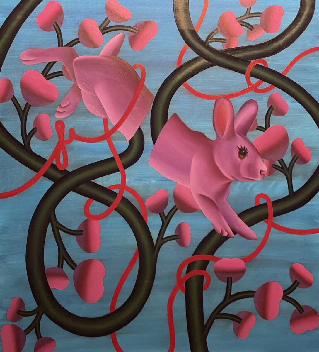 Η δημιουργική διαδικασία χαρακτηρίζεται από μια εμμονική επανάληψη σταθερών στοιχείων. Αυτός ο ρυθμός δεν είναι τυχαίος· αποτελεί μια συνειδητή προσπάθεια επιβολής ελέγχου και τάξης απέναντι στο χάος των ανεξέλεγκτων ανατροπών της ζωής. Στο επίκεντρο αυτού του κόσμου βρίσκεται το κουνέλι, μια μορφή που ενσαρκώνει το μητρικό πρότυπο και την αναπαραγωγή. Με μάτια που παραπέμπουν στην αθωότητα των παιδικών παιχνιδιών, το ζώο γίνεται ο συνδετικός κρίκος με την παιδική ηλικία, εκεί όπου η ασφάλεια και ο φόβος συνυπάρχουν.