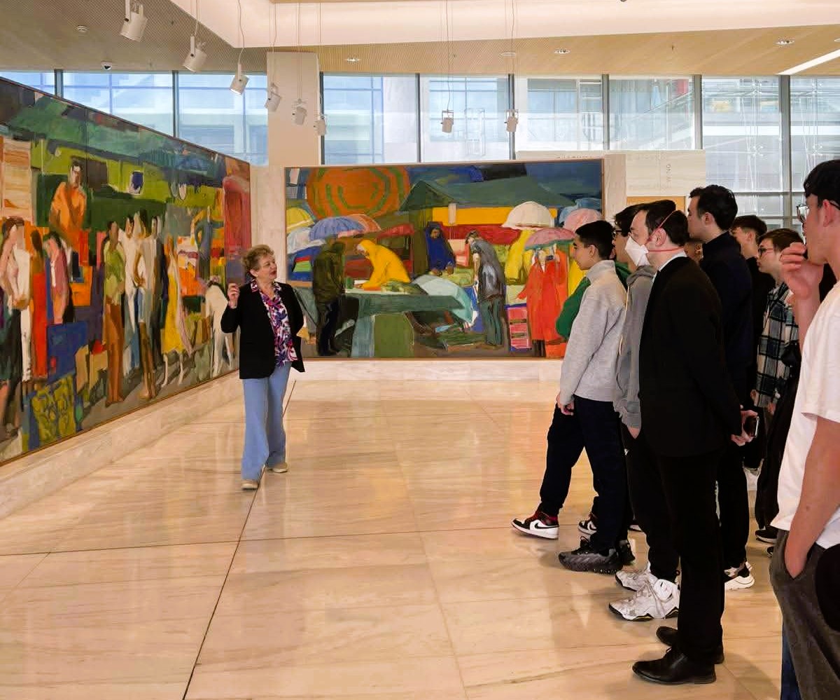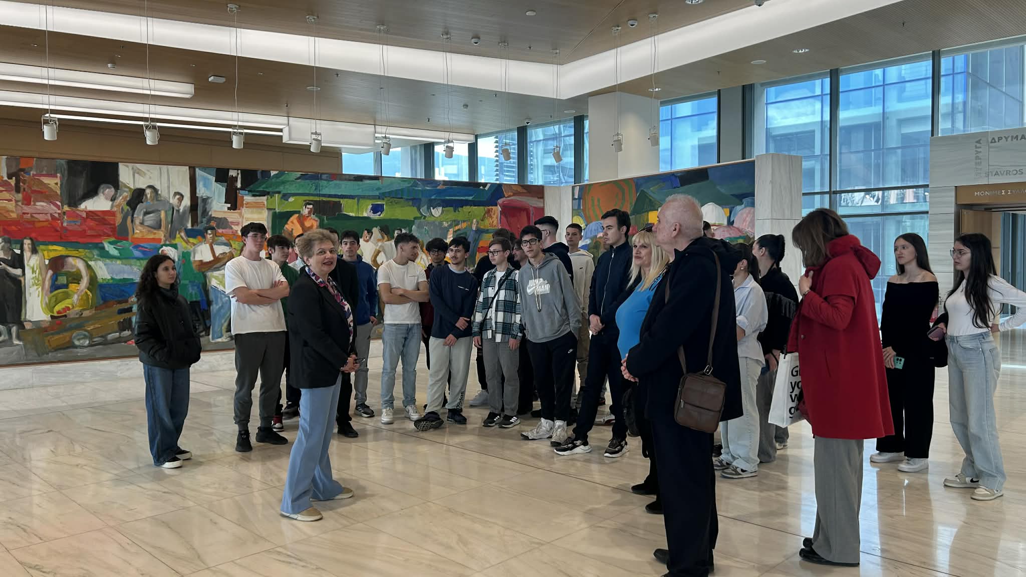 Κατά την επίσκεψή τους οι μαθητές και μαθήτριες του σχολείου είχαν τη σπάνια ευκαιρία, τη μεγάλη χαρά και την υψίστη τιμή να ξεναγηθούν στη μόνιμη έκθεση από τη Λαρισαία Διευθύντρια της Εθνικής Πινακοθήκης, Ιστορικό Τέχνης, Δρ. Συραγώ Τσιάρα. Η περιήγηση ξεκίνησε με την ενημέρωση των μαθητών/-τριών από την κ. Τσιάρα για το σκεπτικό διαμόρφωσης του περιβάλλοντος χώρου, της εισόδου και του φουαγιέ του κτηρίου της Εθνικής Πινακοθήκης και την παρουσίαση του «Πύθωνα», γλυπτής εγκατάστασης του Κώστα Τσόκλη, και της μνημειακής πολυχρωμίας της «Λαϊκής Αγοράς» του Παναγιώτη Τέτση.