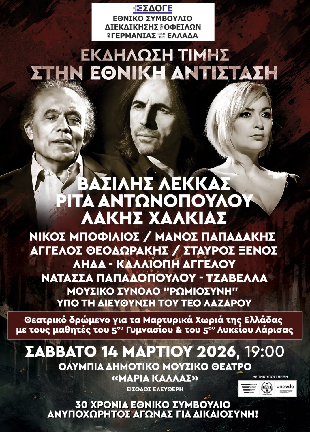 Η εκδήλωση διοργανώνεται από το Εθνικό Συμβούλιο Διεκδίκησης των Οφειλών της Γερμανίας προς την Ελλάδα (ΕΣΔΟΓΕ), με την υποστήριξη του Δήμου Αθηναίων και του Οργανισμού Πολιτισμού, Αθλητισμού και Νεολαίας του Δήμου Αθηναίων (ΟΠΑΝΔΑ). Έχει μουσικοθεατρικό χαρακτήρα και θα πλαισιωθεί από καταξιωμένους καλλιτέχνες, όπως οι Βασίλης Λέκκας, Λάκης Χαλκιάς, Ρίτα Αντωνοπούλου και Μάνος Παπαδάκης. Η διασχολική ομάδα είχε ήδη συνεργαστεί με τον Λάκη Χαλκιά και τον Μάνο Παπαδάκη σε εκδήλωση στο Ηράκλειο Κρήτης, τον περασμένο Σεπτέμβριο του 2025.