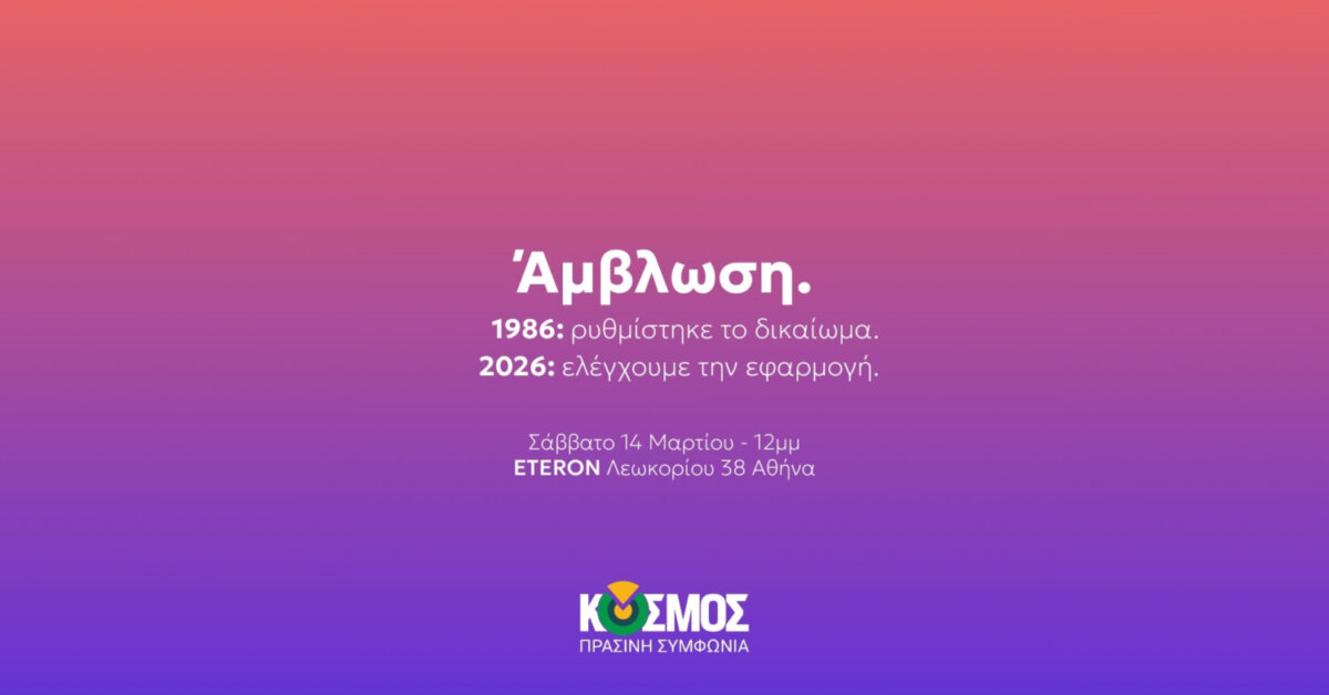 Ο ΚΟΣΜΟΣ Πράσινη Συμφωνία διοργανώνει δημόσια συζήτηση με τίτλο «Άμβλωση. 1986: Ρυθμίστηκε το δικαίωμα. 2026: Ελέγχουμε την εφαρμογή», το Σάββατο 14 Μαρτίου στις 12:00 μμ στο ETERON (Λεωκορίου 38-40, Αθήνα).