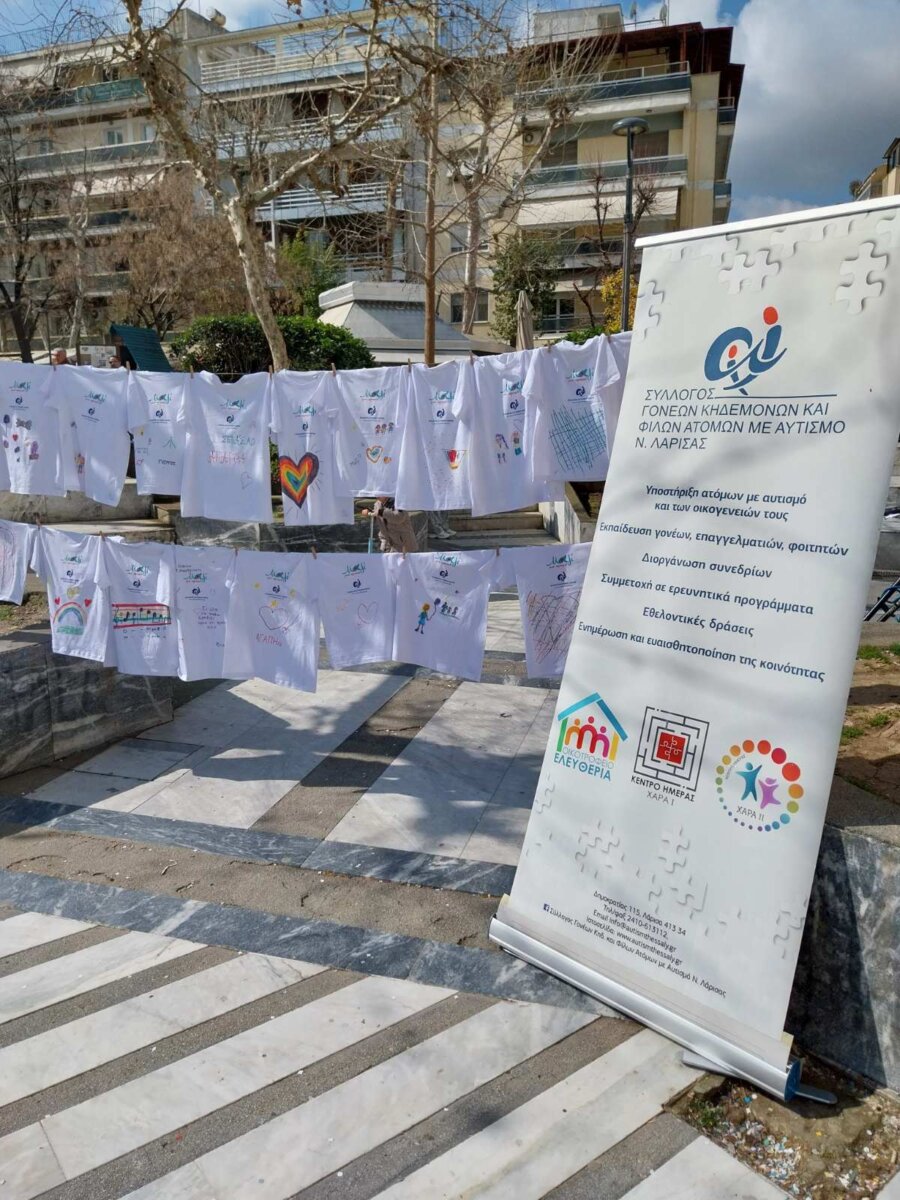 Τα μπλουζάκια φέρουν τα λογότυπα τόσο του Συλλόγου Αυτισμού Λάρισας όσο και της δράσης «Μαζί μια Αγκαλιά», αναδεικνύοντας τη συνεργασία των δύο φορέων γύρω από το κοινό μήνυμα της ευαισθητοποίησης και της κοινωνικής αλληλεγγύης.
