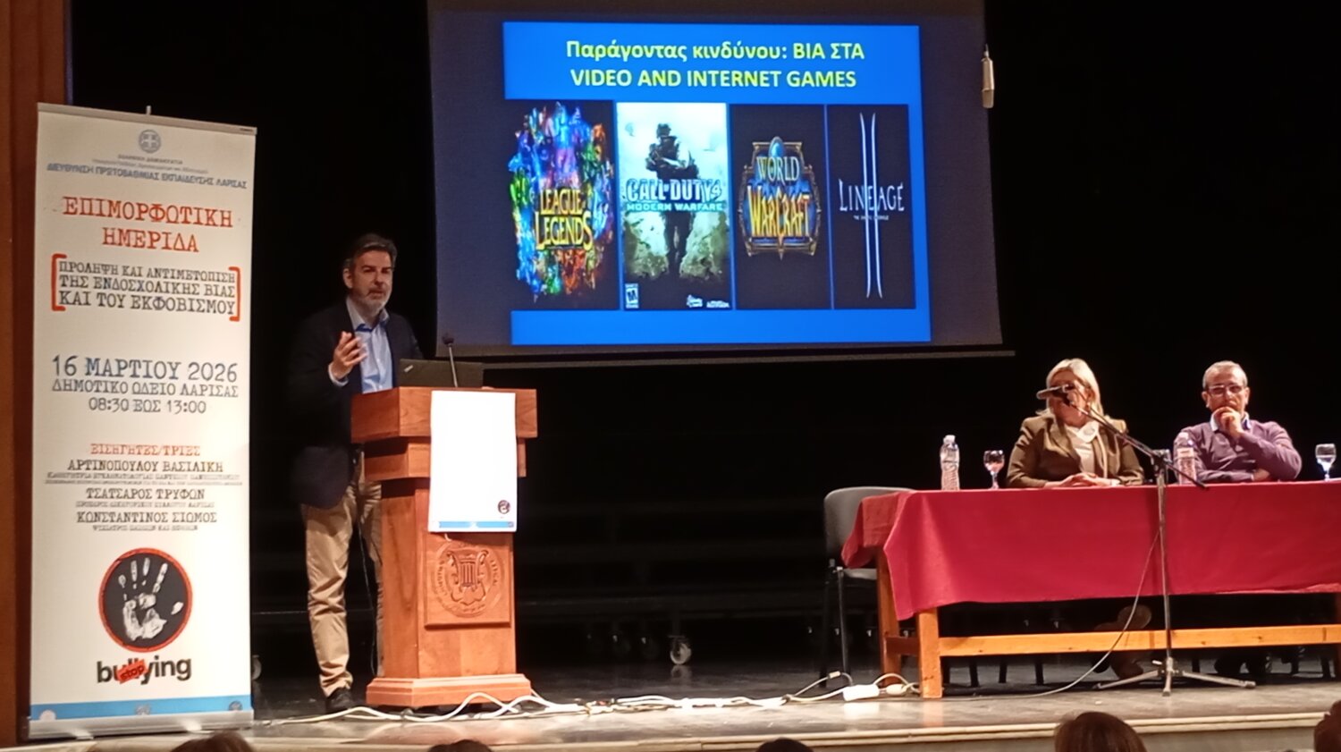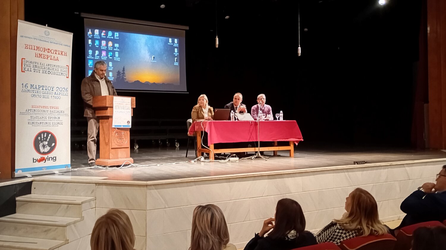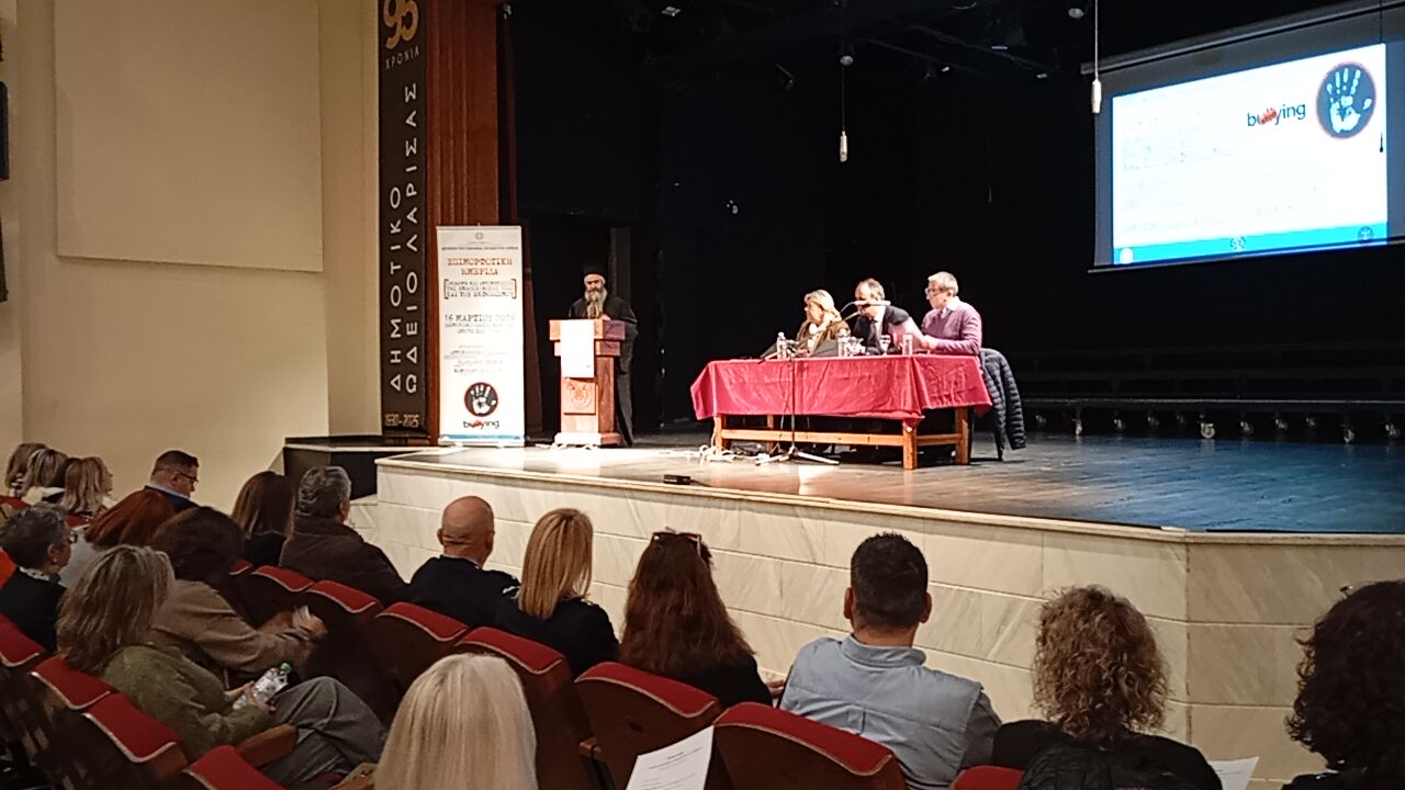 «Με ιδιαίτερη χαρά αλλά και αίσθημα ευθύνης σας καλωσορίζω στη σημερινή επιμορφωτική ημερίδα με θέμα: «Πρόληψη και αντιμετώπιση της Ενδοσχολικής Βίας και του Εκφοβισμού», η οποία διοργανώνεται από τη Διεύθυνση Πρωτοβάθμιας Εκπαίδευσης Λάρισας και την Ομάδα Δράσης της για την πρόληψη και αντιμετώπιση της Ενδοσχολικής Βίας και του Εκφοβισμού, σε συνεργασία με την Ιερά Μητρόπολη Λαρίσης και Τυρνάβου και τον Δήμο Λαρισαίων.