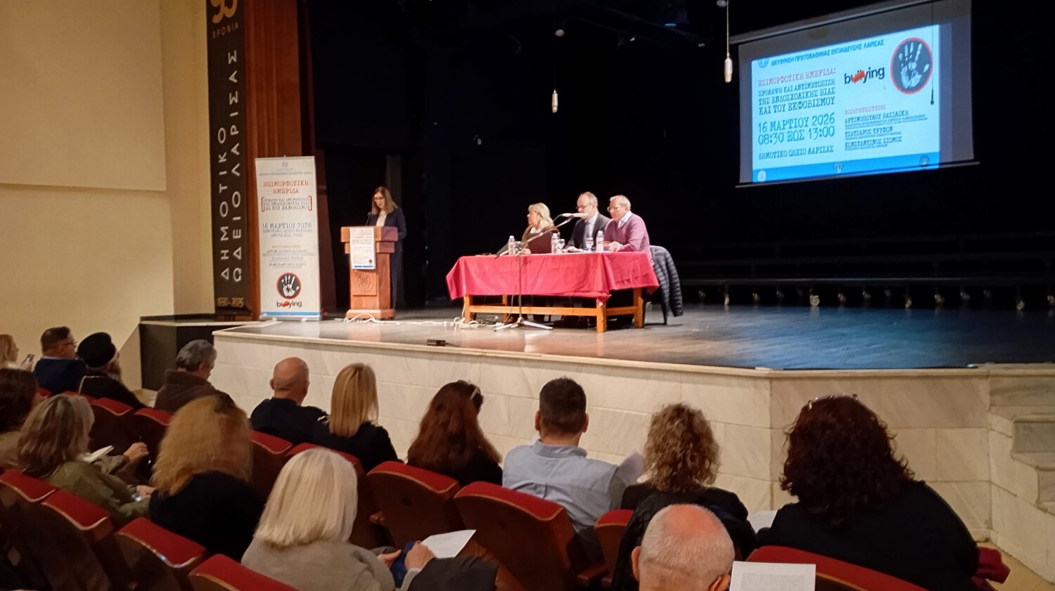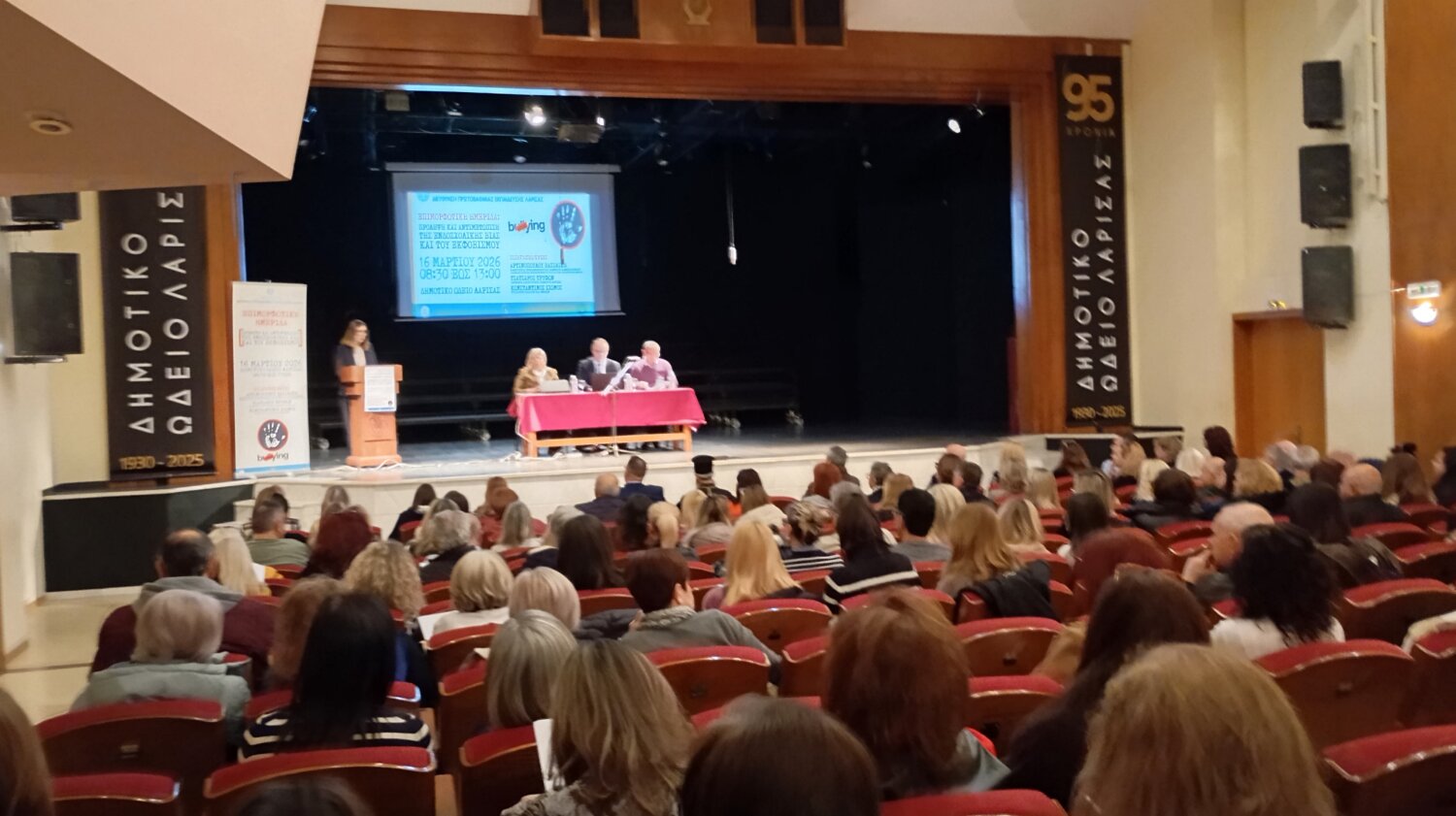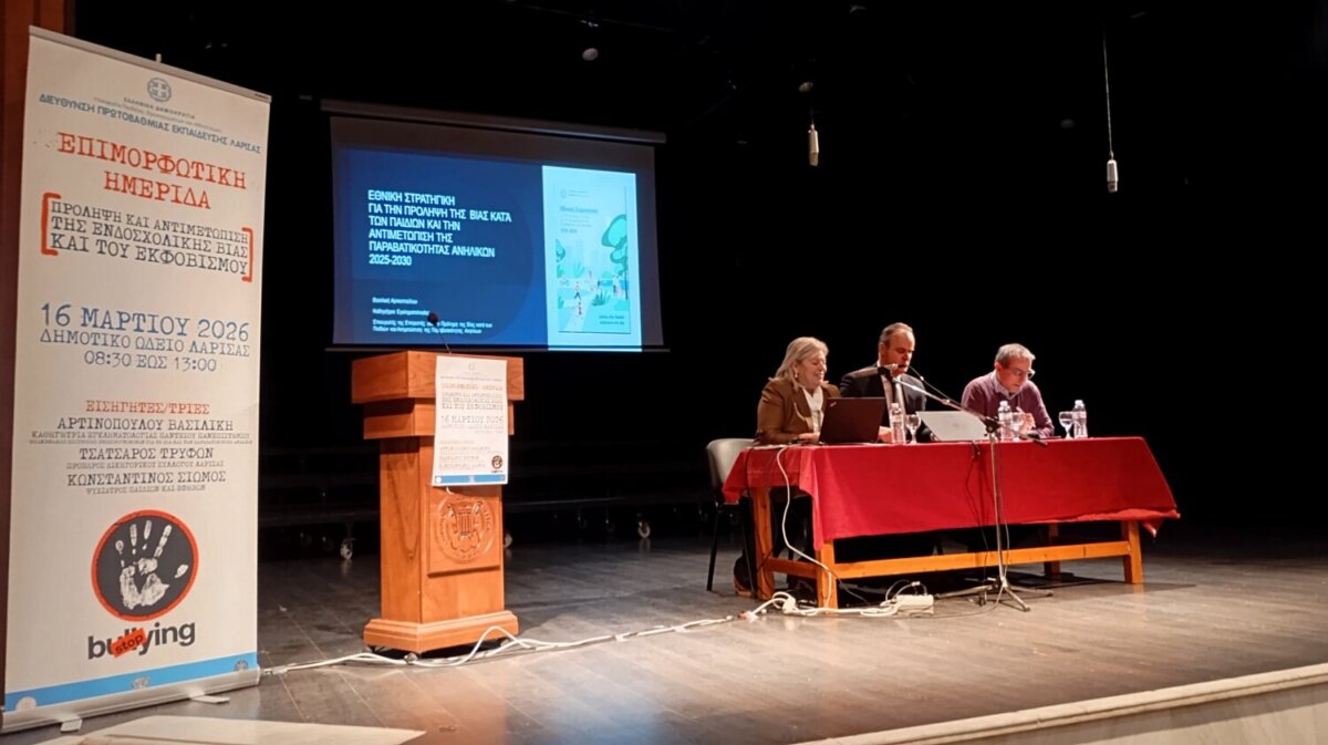 H Διεύθυνση Πρωτοβάθμιας Εκπαίδευσης Λάρισας και η Ομάδα Δράσης της για την Πρόληψη και Αντιμετώπιση της Ενδοσχολικής Βίας και Εκφοβισμού (Ε.ΒΙ.Ε.), σε συνεργασία με υην Ιερά Μητρόπολη Λαρίσης και Τυρνάβου και τον Δήμο Λαρισαίων, διοργάνωσε με ιδιαίτερη επιτυχία τη Δευτέρα 16/3/2026, στο Δημοτικό Ωδείο Λάρισας, την επιμορφωτική Ημερίδα, με θέμα: “Πρόληψη και Αντιμετώπιση της Ενδοσχολικής Βίας και του Εκφοβισμού”, στην οποία συμμετείχαν εκατοντάδες μέλη της σχολικής κοινότητας και συγκεκριμένα Δ/ντές-ντριες εκπαιδευτικοί, Ψυχολόγοι ΠΕ23, Κοινωνικοί Λειτουργοί ΠΕ30, αλλά και γονείς/κηδεμόνες μαθητών και μαθητριών Δημοτικών Σχολείων και Νηπιαγωγείων.