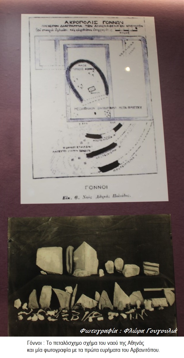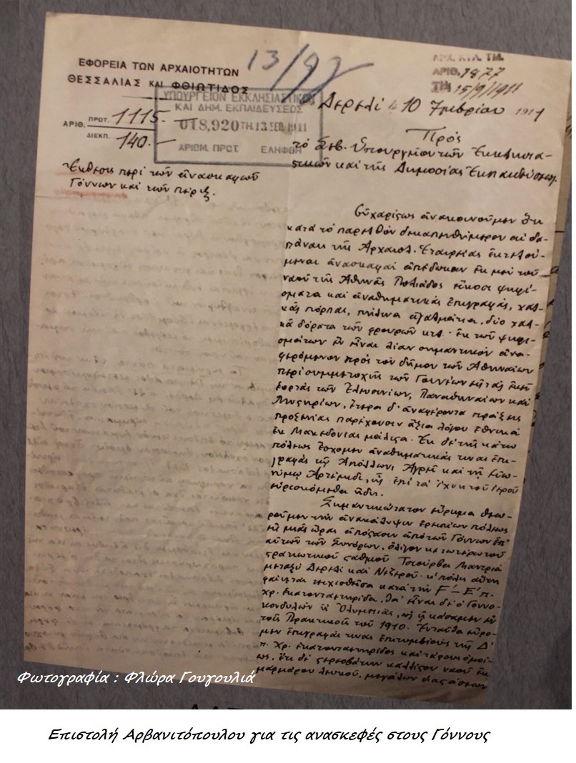 «… και συνεχίζουμε με τους Γόννους, μια από τις πιο πρώιμες ανασκαφές το 1910, από τον Απόστολο Αρβανιτόπουλο – ήταν ο σημαντικότερος Έλληνας Έφορος αρχαιοτήτων της εποχής εκείνης. Εδώ στους Γόννους είχε την τύχη να πέσει πάνω στο ναό της Αθηνάς στην Ακρόπολη και το τείχος που ήταν ορατό. Ο ίδιος ο ναός χρονολογείται τον 6ο-7ο αιώνα π.Χ. Όπως αναφέρει στην επιστολή του ο ίδιος, με ενθουσιασμό, προς το τότε υπουργείο Εκκλησιαστικών και Δημοσίας Εκπαιδεύσεως, που είχε και την αρμοδιότητα για τα αρχαία “Ευχαρίστως ανακοινούμεν ότι οι δαπάνες από τις ανασκαφές απέδωσαν εκ του ναού της Αθηνάς Πολυάδος, είκοσι ψηφίσματα και αναθηματικάς επιγραφάς”, κ.λ.π. Και συνεχίζει αναφέροντας τις περιπέτειες που είχε για να στεγάσει τις αρχαιότητες στο σχολείο, που δεν χωρούσαν…