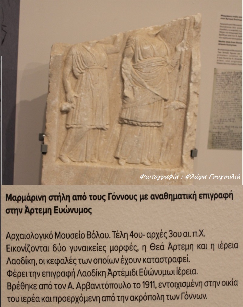 Τώρα από τα δεκάδες γλυπτά που υπάρχουν μας ήρθαν από το Βόλο δύο στήλες : Μία αναθηματική στήλη αφιερωμένη στην Αθηνά και η άλλη στην Άρτεμη. Και οι δύο είναι από το 3ο αιώνα π.Χ. Εκτίθεται επίσης το σχέδιο της περιοχής των Γόννων που σχεδίασε ο Μπρούνο Ελί με τα μέρη που βρέθηκαν επιγραφές, τις οποίες μελέτησε ο ίδιος στη διατριβή του, καθώς έγγραφα, κυρίως του Αρβανιτόπουλου που αναφέρονται στις ανασκαφές και τα ευρήματα των Γόννων. Εντυπωσιάζει δε το μεγάλο πλήθος των στηλών και των επιγραφών», καταλήγει στην ξενάγηση για την περιοχή των Γόννων η Σταυρούλα Σδρόλια, την οποία και ευχαριστούμε θερμά.