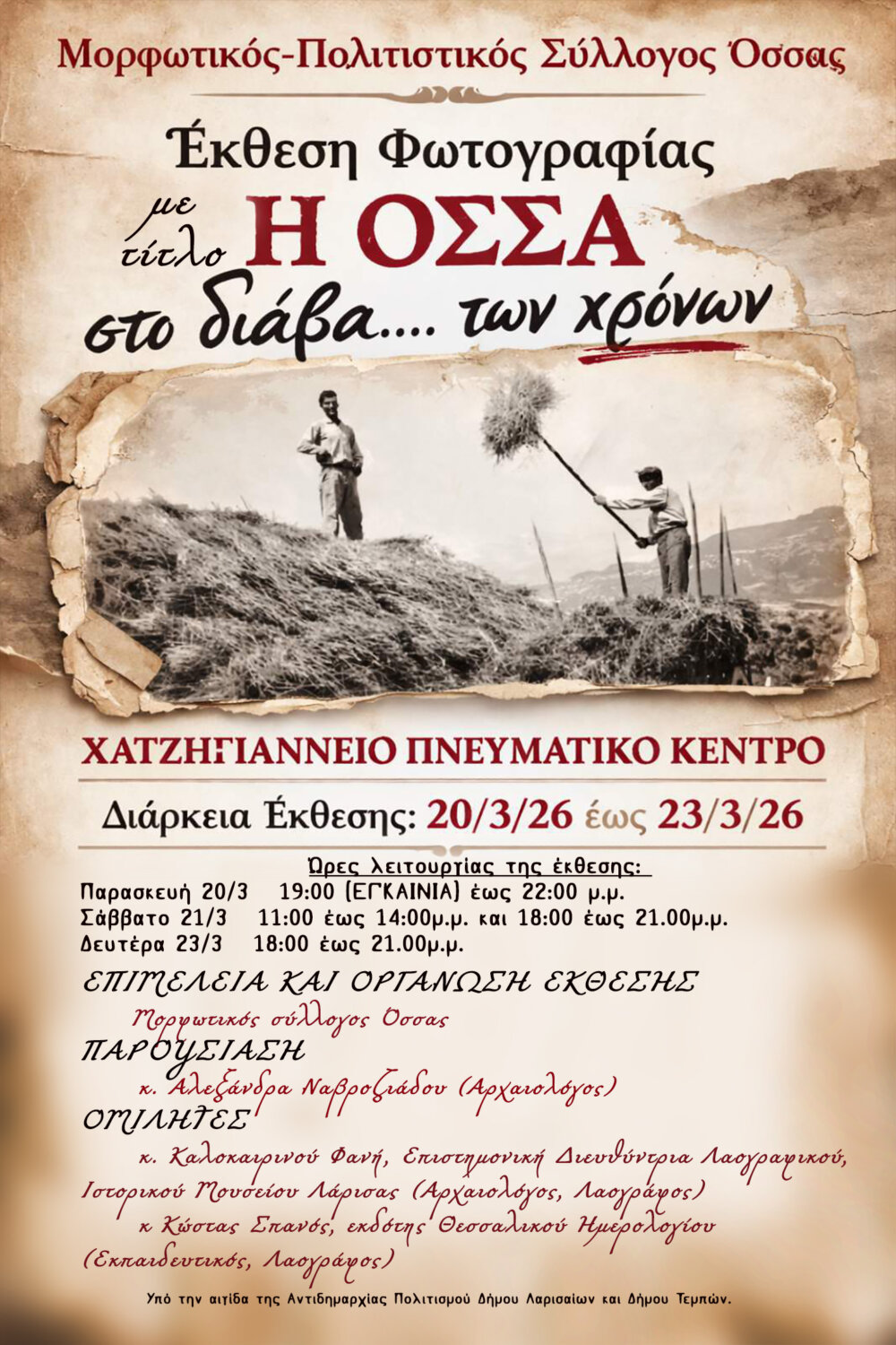 Ο Δήμος Τεμπών και η Αντιδημαρχία Πολιτισμού στηρίζουν και θέτουν υπό την αιγίδα τους την έκθεση φωτογραφίας με τίτλο «Η Όσσα στο διάβα… των χρόνων», που διοργανώνει ο Μορφωτικός Σύλλογος Όσσας.