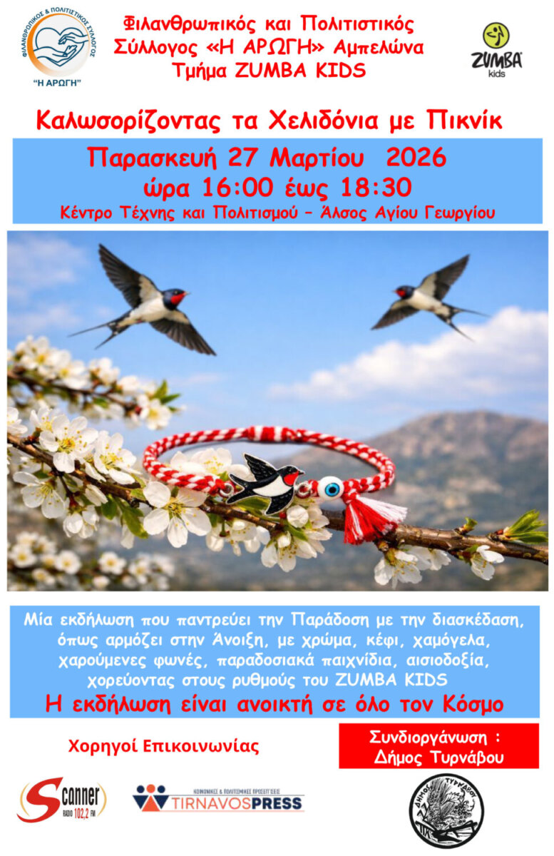 Ο Φιλανθρωπικός & Πολιτιστικός Σύλλογος «Η Αρωγή» Αμπελώνα συνδιοργανώνει με τον Δήμο Τυρνάβου, την Παρασκευή 27 Μαρτίου 2026 και ώρες 16:00 έως 18:30, στο Κέντρο Τέχνης και Πολιτισμού, στο Άλσος Αγίου Γεωργίου εκδήλωση με τίτλο ¨Καλωσορίζοντας τα Χελιδόνια με Πικνίκ¨.