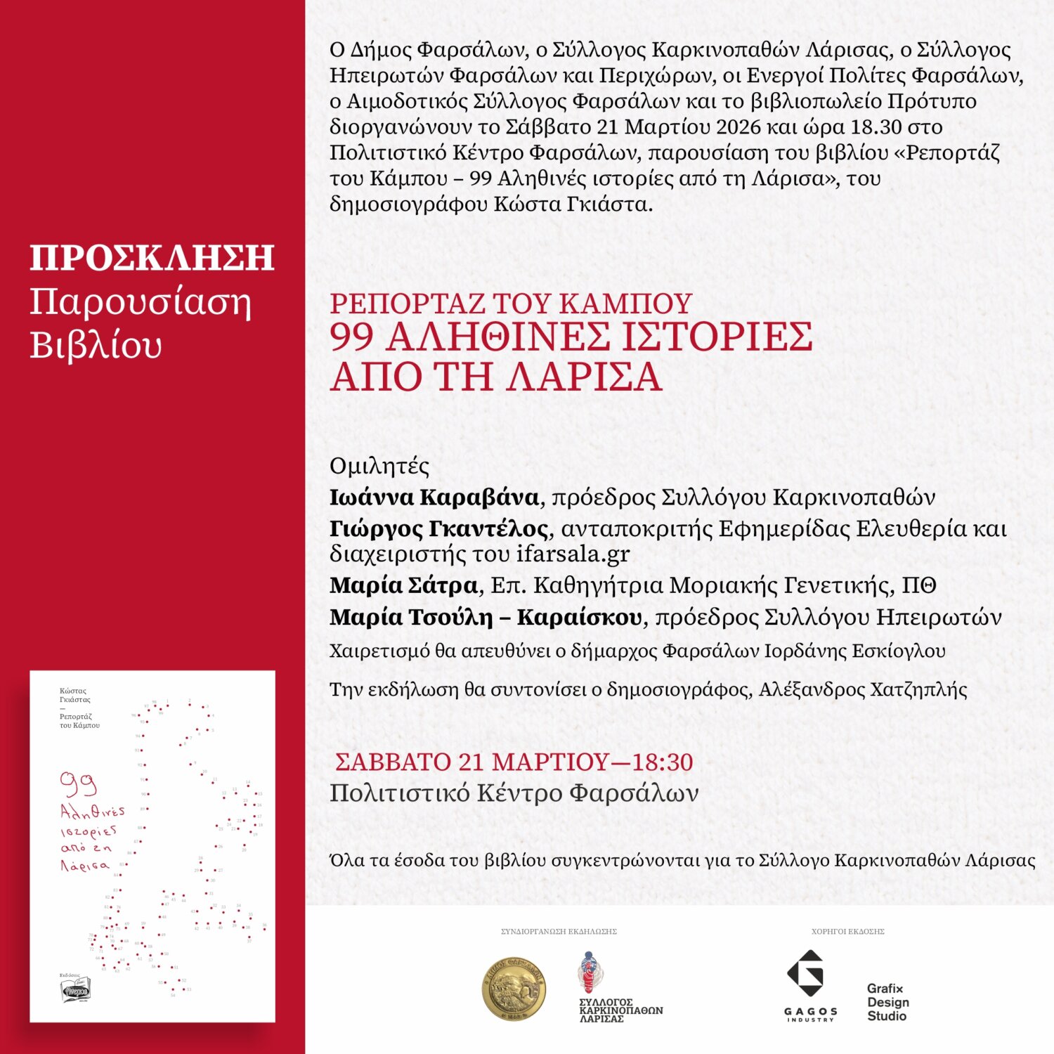 Ο Δήμος Φαρσάλων, ο Σύλλογος Καρκινοπαθών Λάρισας, ο Σύλλογος Ηπειρωτών Φαρσάλων και Περιχώρων, οι Ενεργοί Πολίτες Φαρσάλων, ο Αιμοδοτικός Σύλλογος Φαρσάλων και το βιβλιοπωλείο Πρότυπο διοργανώνουν το Σάββατο 21 Μαρτίου 2026 και ώρα 18.30 στο Πολιτιστικό Κέντρο Φαρσάλων, παρουσίαση του βιβλίου «Ρεπορτάζ του Κάμπου – 99 Αληθινές ιστορίες από τη Λάρισα».
