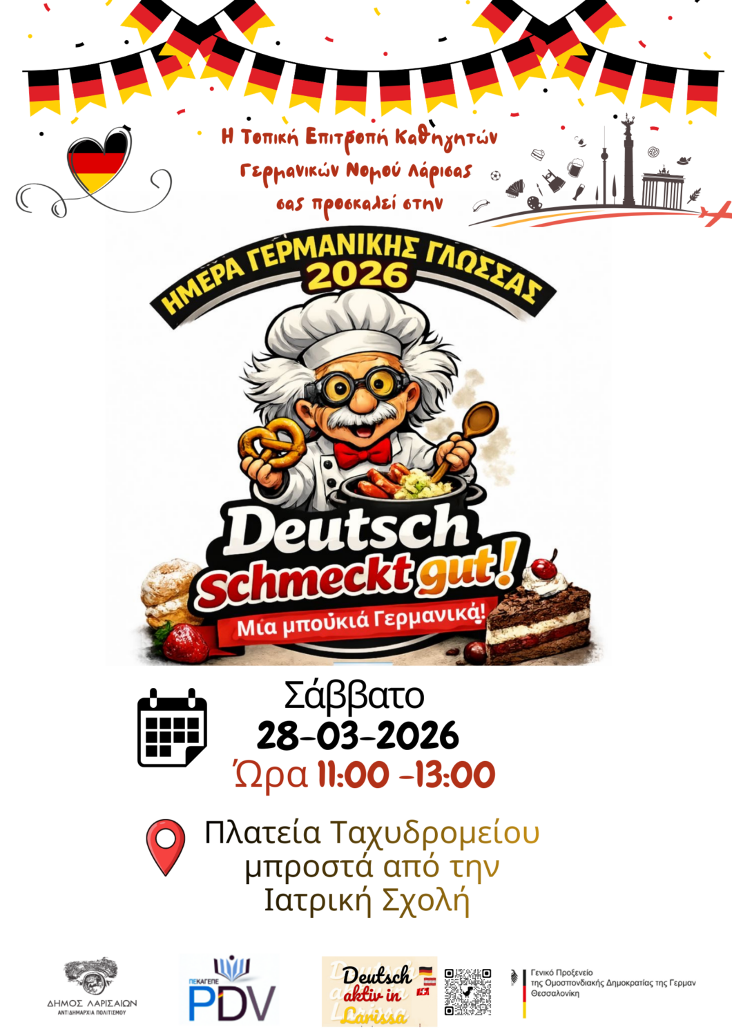 Το κεντρικό event εορτασμού της Ημέρας Γερμανικής Γλώσσας στη Λάρισα θα πραγματοποιηθεί στην Πλατεία Ταχυδρομείου, μπροστά στην Ιατρική Σχολή, στις 28 Μαρτίου 2026, ώρες 11:00–13:00.