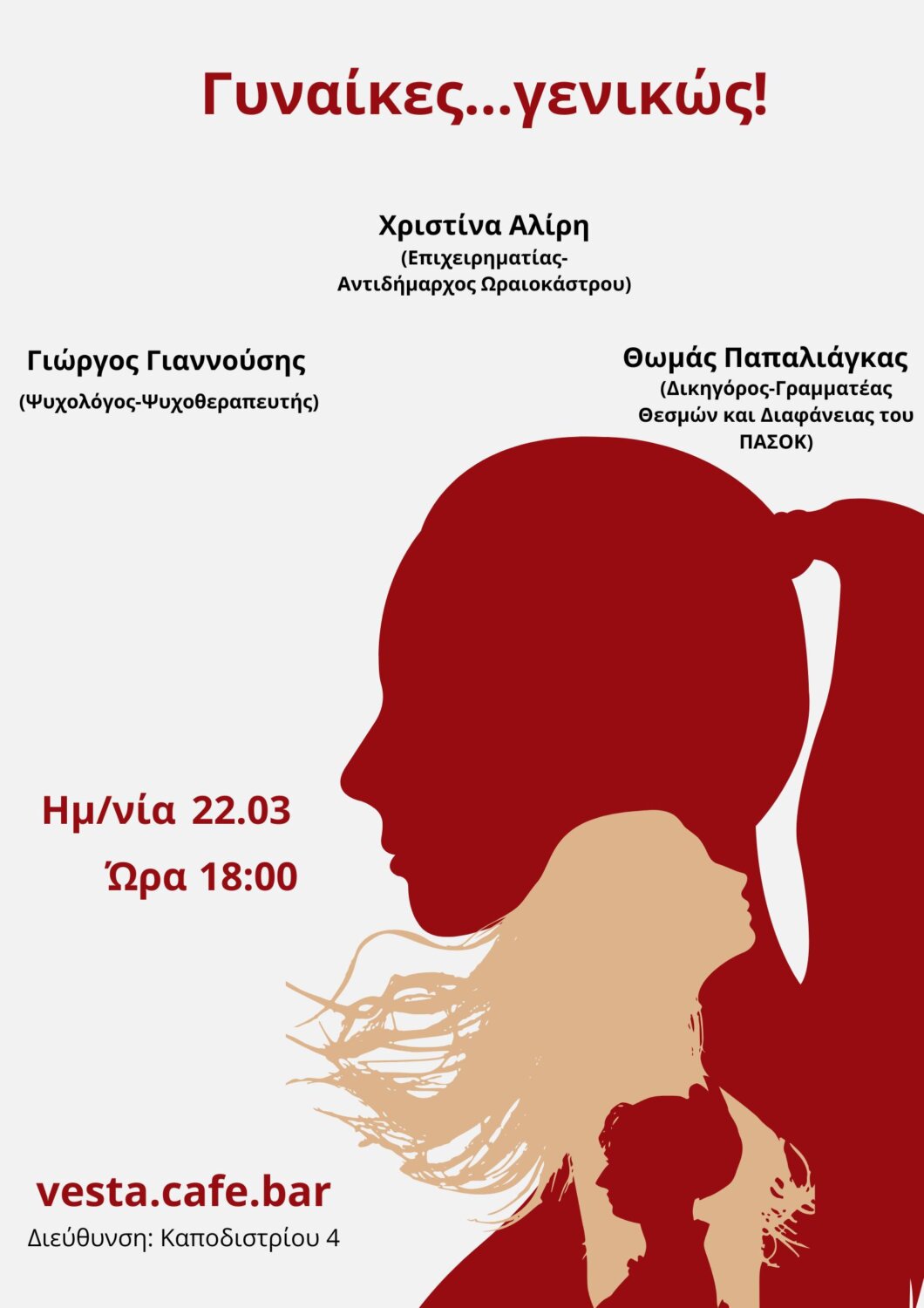 «Συζητάμε πίνοντας και τον καφέ μας για τις γυναίκες, με τις γυναίκες και ξεκινώντας από τις γυναίκες, με θέμα: «Γυναίκες… γενικώς!» Με καλεσμένους: Γιώργο Γιαννούση, Ψυχολόγο – Ψυχοθεραπευτή Χριστίνα Αλίρη, Επιχειρηματία, Αντιδήμαρχο Δήμου Ωραιοκάστρου Και όλες εσάς. Και περιμένουμε να σας ακούσουμε! Κυριακή 22 Μαρτίου Ώρα 18:00 Vesta, Καποδιστρίου 4 Η παρουσία σας θα μας τιμήσει ιδιαίτερα».