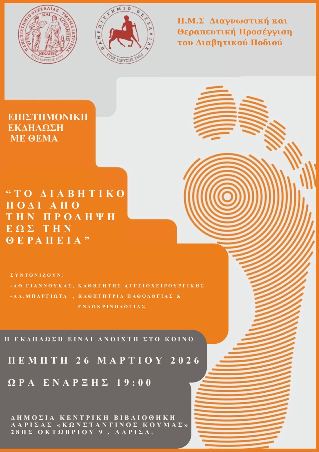Την Πέμπτη 26 Μαρτίου 2026, από τις 19:00 έως τις 20:30, θα πραγματοποιηθεί στην αίθουσα εκδηλώσεων της Δημόσιας Βιβλιοθήκης Λάρισας «Κωνσταντίνος Κούμας» επιστημονική εκδήλωση με τίτλο «Διαβητικό πόδι: Από την πρόληψη έως τη θεραπεία».