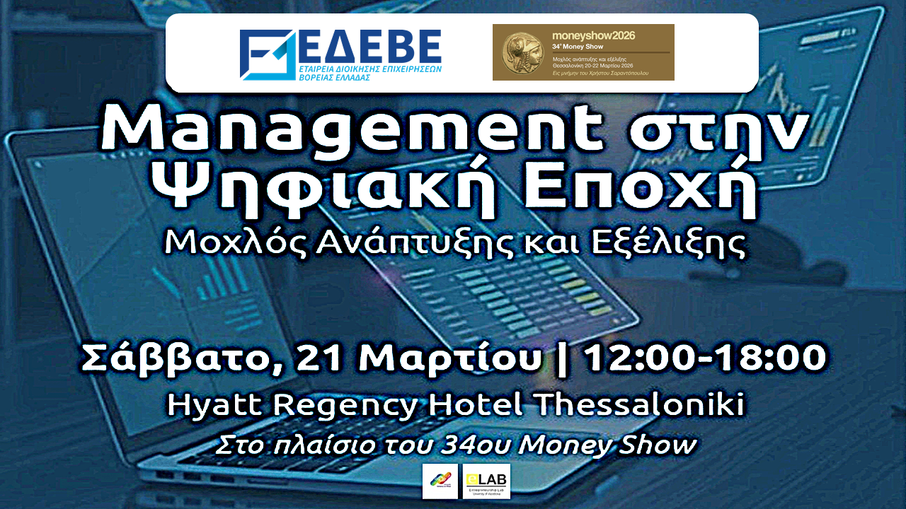 Η Εταιρεία Διοίκησης Επιχειρήσεων Βόρειας Ελλάδας (ΕΔΕΒΕ), στο πλαίσιο του 34ου Money Show, διοργανώνει το Σάββατο 21 Μαρτίου, από τις 12:00 έως τις 18:00, στη Θεσσαλονίκη, στο Hyatt Regency Hotel (Αίθουσα ΕΦΕΣΟΣ 1), πολυθεματική εκδήλωση με τίτλο «Management στην Ψηφιακή Εποχή».
