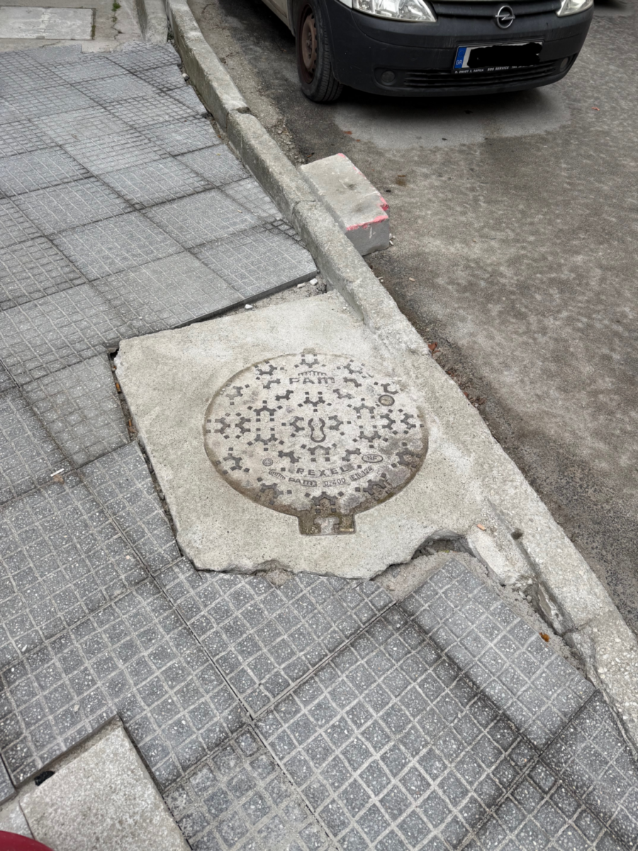 Δείτε εδώ… υπάρχει ένα φρεάτιο που το μπετόν το ρίξανε όπως να ‘ναι γιατί δεν καλούπωσαν και προσπαθούν – εφόσον δεν το τετραγωνίσανε – να σπάνε όλες τις πλάκες για να το ταιριάξουν.