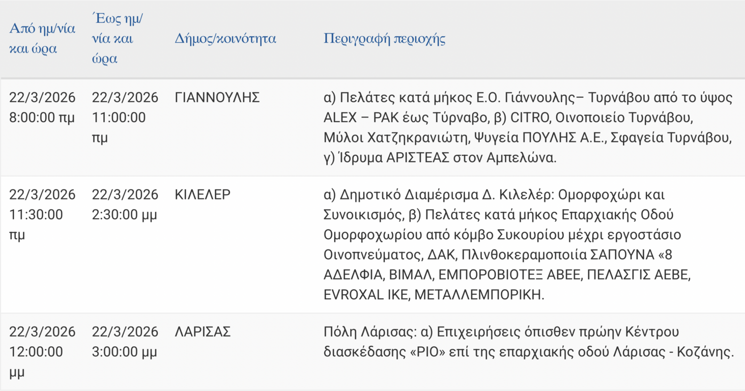 Σε προγραμματισμένες διακοπές στην παροχή ηλεκτρικού ρεύματος σε περιοχές της Λάρισας και της Περιφερειακής Ενότητας θα προχωρήσει την Κυριακή 22 Μαρτίου 2026 ο ΔΕΔΔΗΕ Α.Ε.