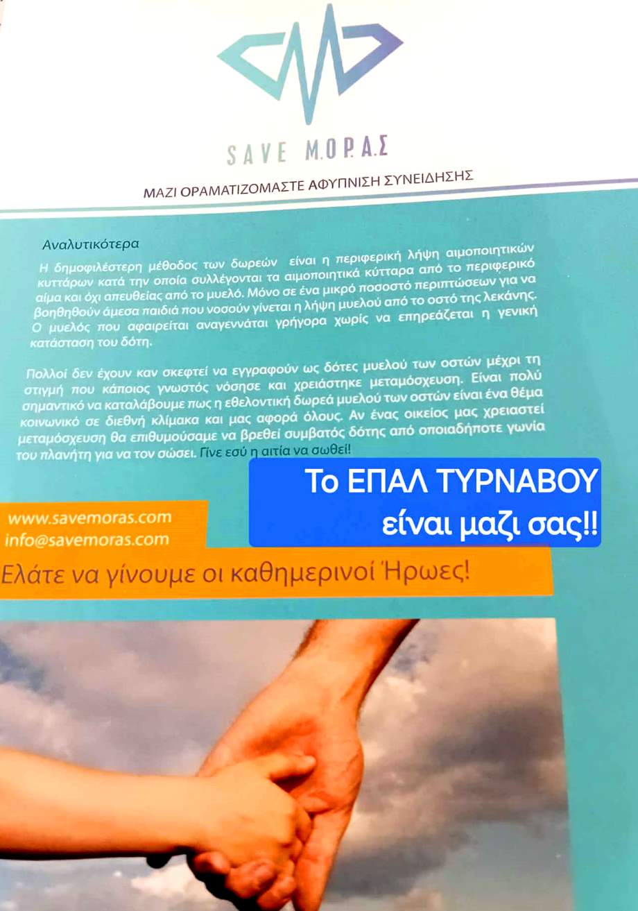 Στο πλαίσιο του προγράμματος Αγωγής Υγείας με θέμα: «Δωρεά οργάνων: Απόδειξη αλτρουισμού» η Ελένη Μόρα, μέλος του σωματείου Μ.ΟΡ.Α.Σ., με μη κερδοσκοπικό χαρακτήρα, μίλησε στους μαθητές του ΕΠΑΛ Τυρνάβου, οι οποίοι συμμετέχουν στο πρόγραμμα για τη Δωρεά μυελού των οστών. Το σωματείο ιδρύθηκε στη μνήμη του αγαπημένου της αδερφού, Δημήτρη ο οποίος μέσω του θάρρους, της αισιοδοξίας, της δύναμης, της ηρεμίας και της αξιοπρέπειάς του, ενέπνευσε κάποια άτομα να κάνουν με σεβασμό, πράξη το όραμά του. Ένα όραμα που πρωταρχικό στόχο έχει την ορθή ενημέρωση κι επαγρύπνηση του κοινού ως προς τη διαδικασία δωρεάς μυελού των οστών.