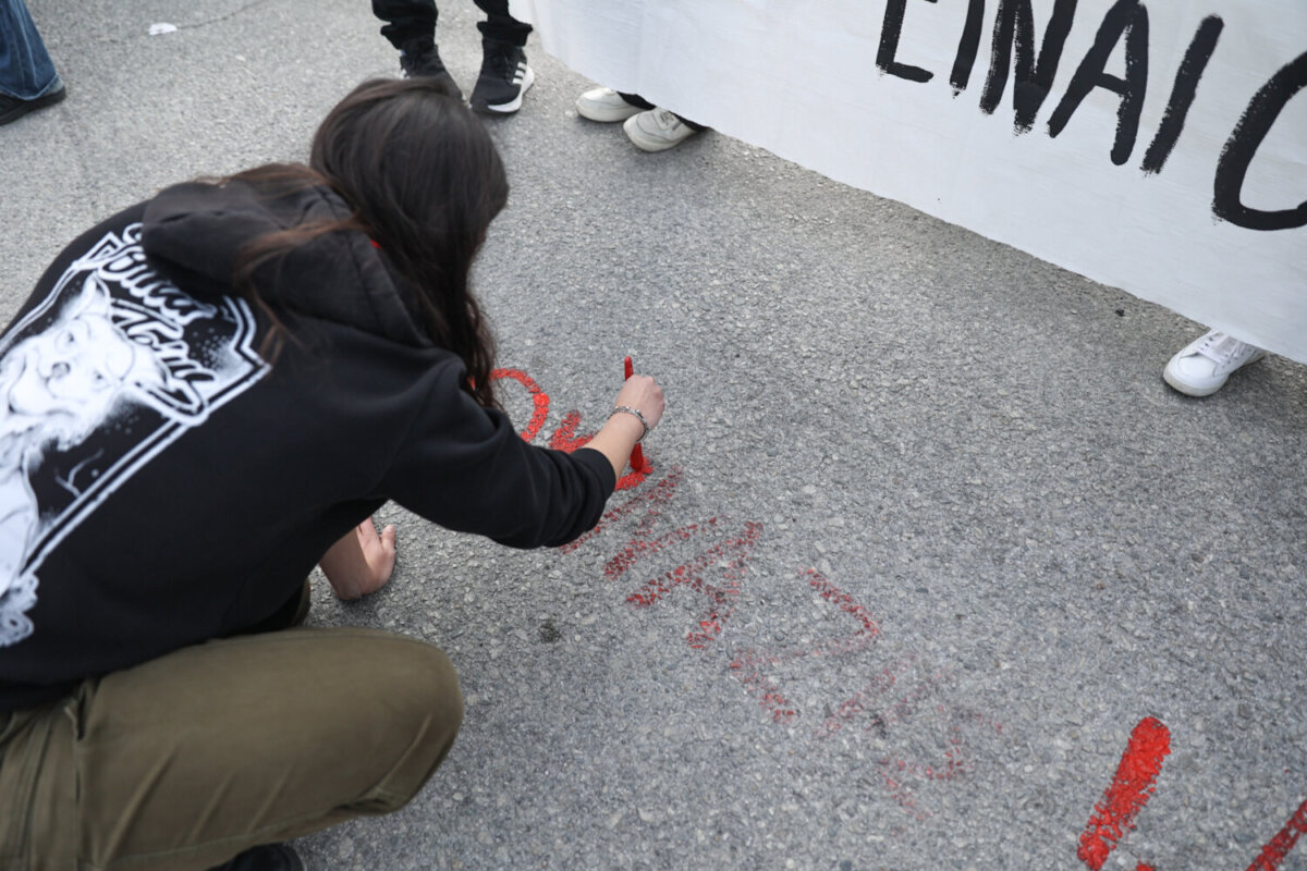 Ομάδα διαδηλωτών έγραψε με κόκκινη μπογιά τα ονόματα όσων έχασαν τη ζωή τους στην τραγωδία.