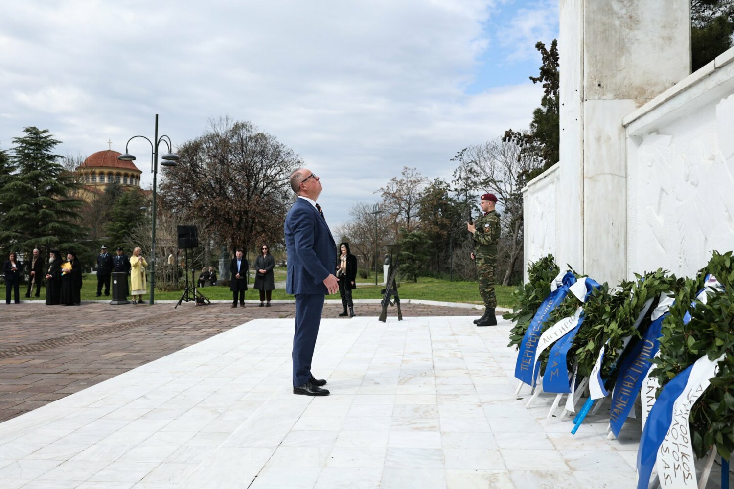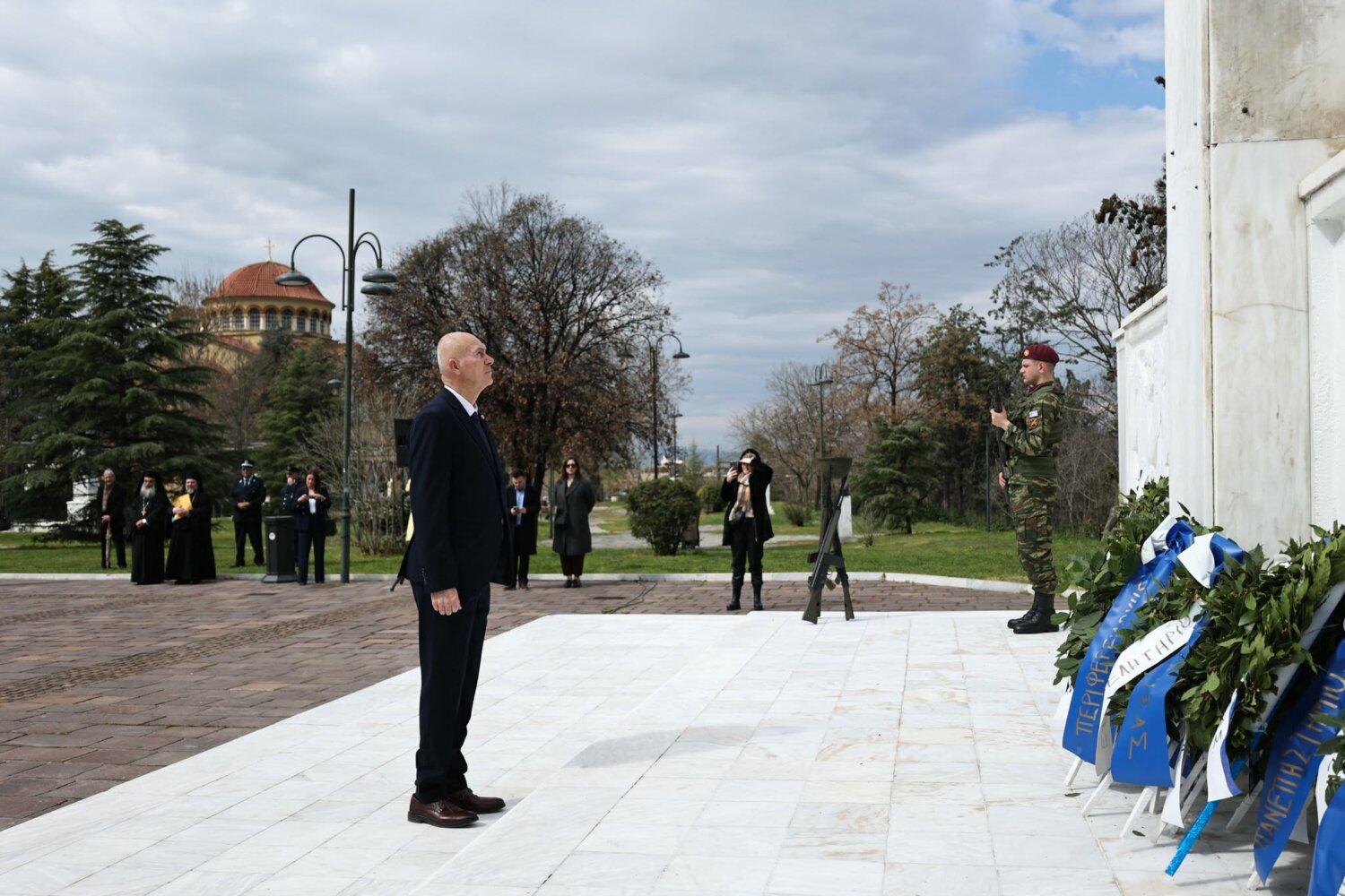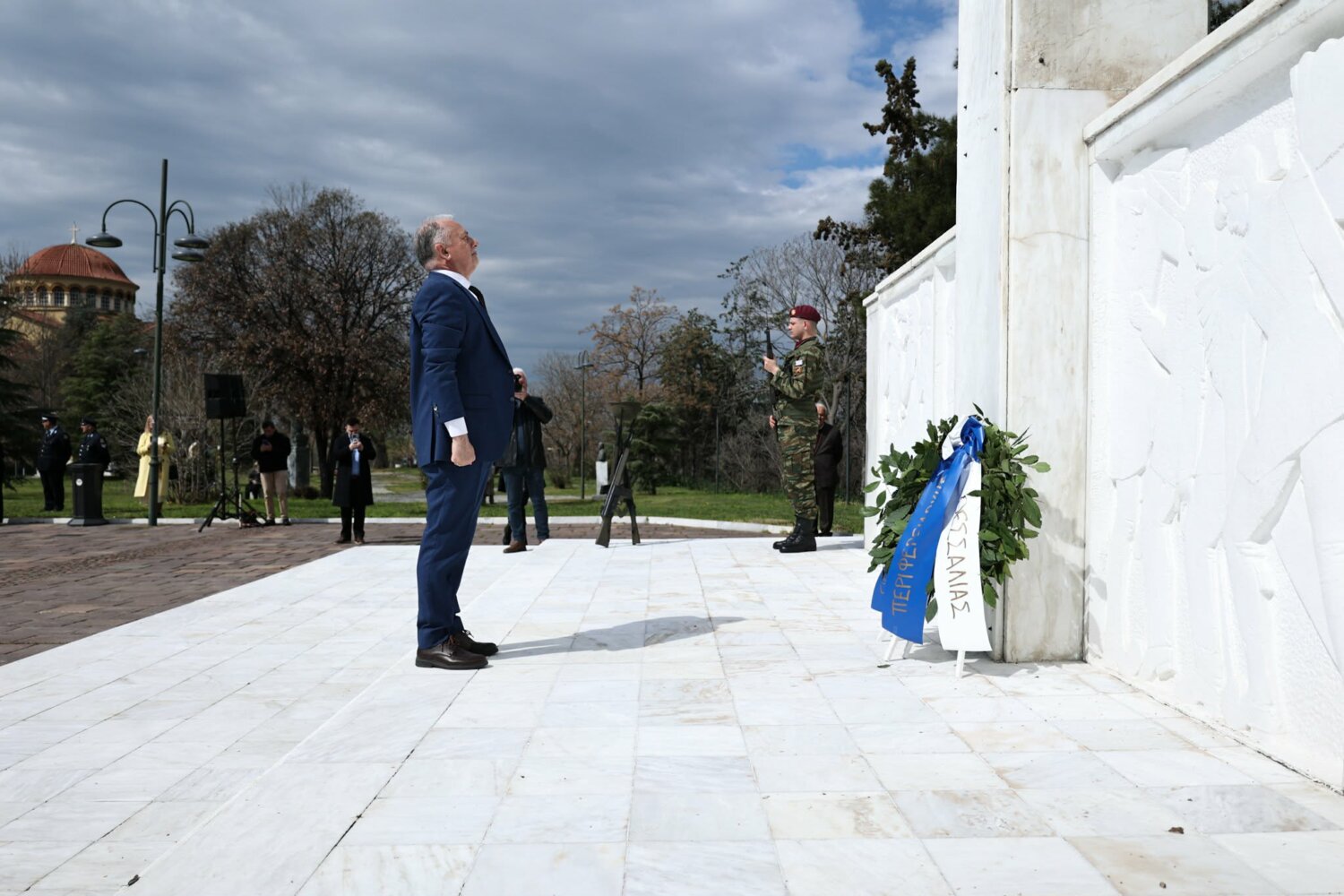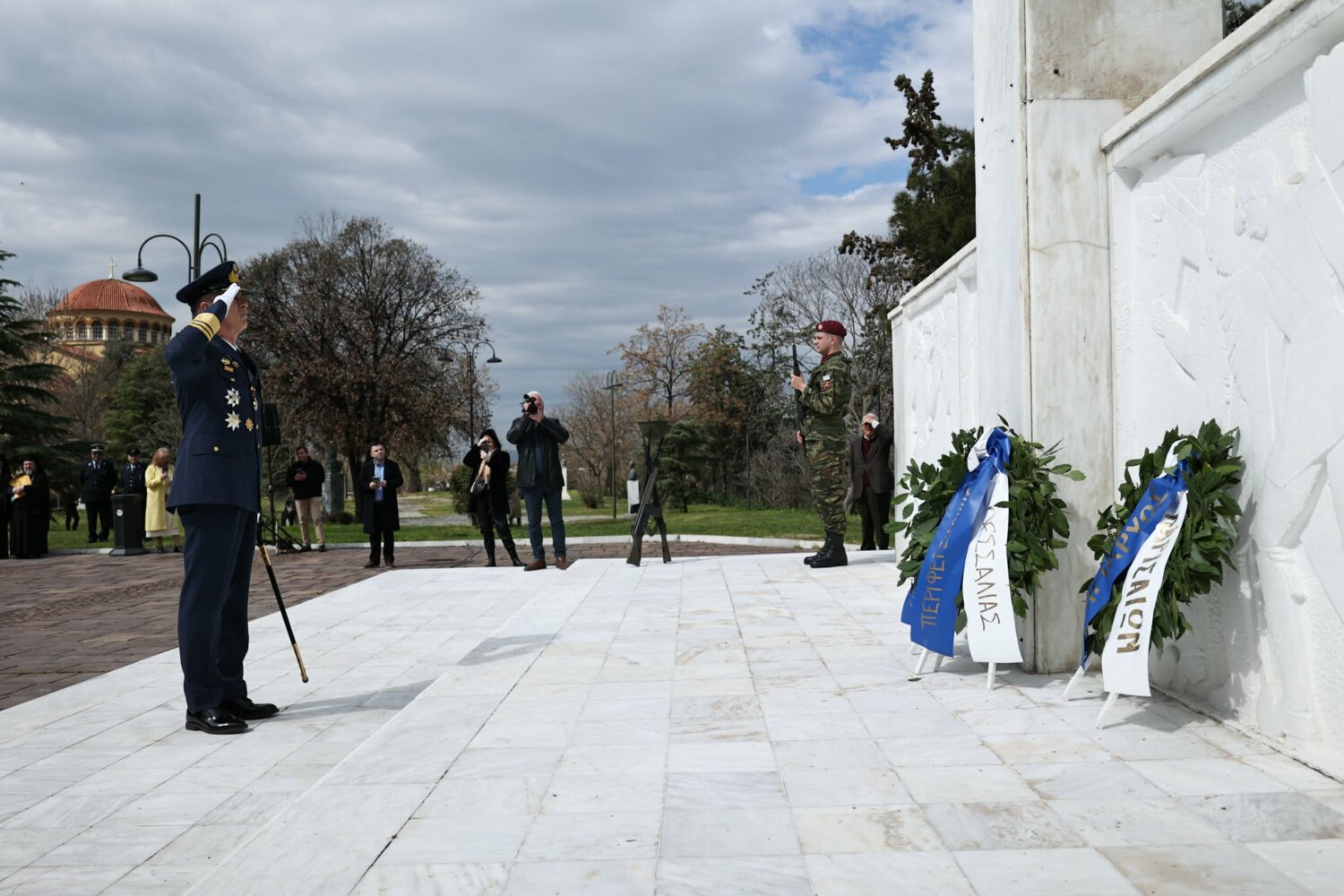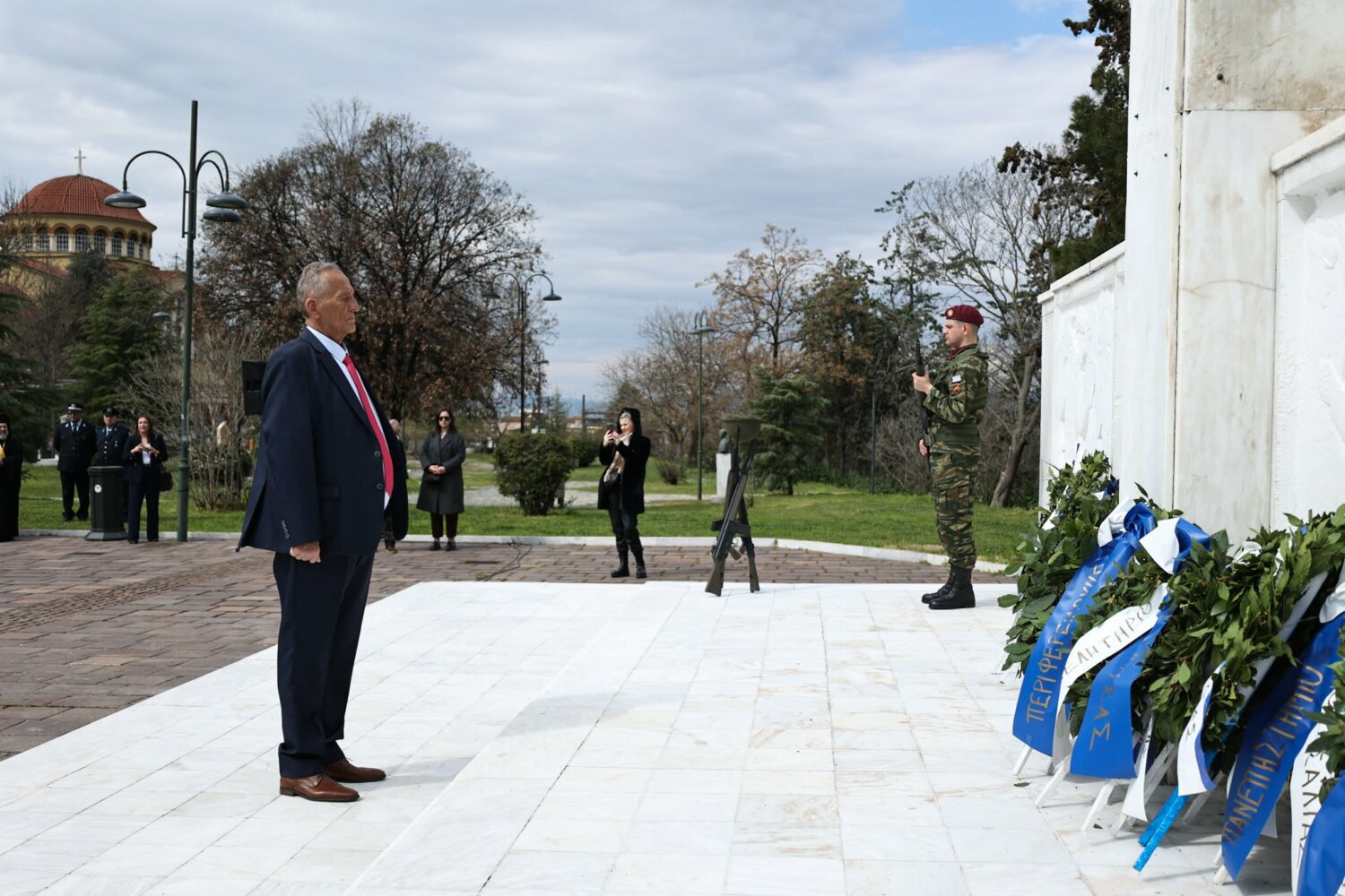 Εκπρόσωπος από την Κυβέρνηση, εκπρόσωπος Περιφερειάρχη Θεσσαλίας, ο δήμαρχος Λαρισαίων, εκπρόσωπος Ενόπλων Δυνάμεων, Αρχηγός Τακτικής Αεροπορίας, ο Πρύτανης Πανεπιστημίου Θεσσαλίας, ο γενικός Αστυνομικός Διευθυντής Περιφέρειας Θεσσαλίας, ο Περιφερειακός Διοικητής Πυροσβεστικών Υπηρεσιών Θεσσαλίας, Νέα Δημοκρατία Λάρισας, ΣΥΡΙΖΑ -ΠΣ Λάρισας, Νίκη Λάρισας, Πλεύση Ελευθερίας-Ζωη Κωνσταντοπούλου, Περιφερειακή Διευθύντρια Πρωτοβάθμιας και Δευτεροβάθμιας εκπαίδευσης Θεσσαλίας, πρόεδρος Ισραηλιτικής Κοινότητας Λάρισας, πρόεδρος Δικηγορικού Συλλόγου Λάρισας, Επιμελητήριο Λάρισας, πρόεδρος Ενώσεως αποστράτων αξιωματικού Περιφερειακής Ενότητας Λάρισας, πρόεδρος Ενώσεως αποστράτων Αξιωματικών Ναυτικού, πρόεδρος Ενώσεων αποστράτων Αξιωματικών Αεροπορίας Λάρισας, πρόεδρος συνδέσμου εφέδρων Αξιωματικών νομού Λάρισας, εκπρόσωπος του συνδέσμου απόστρατων αξιωματικών του νομού Λάρισας, πρόεδρος Ενώσεως Στρατιωτικών Περιφερειακής Ενότητας Λάρισας, ΑΧΕΠΑ Λάρισας, Σύλλογος Κυπρίων νομού Λάρισας, πρόεδρος του συνδέσμου Βορειοηπειρωτών Θεσσαλίας Ο ΠΥΡΟΣ, πρόεδρος του συνδέσμου Πελοποννησίων νομού Λάρισας Ο ΜΟΡΙΑΣ, Σύνδεσμος Σαρακατσαναίων νομού Λάρισας Ο ΚΑΤΣΑΝΤΩΝΗΣ, πρόεδρος πανηπειρωτικου συνδέσμου νομού Λάρισας.