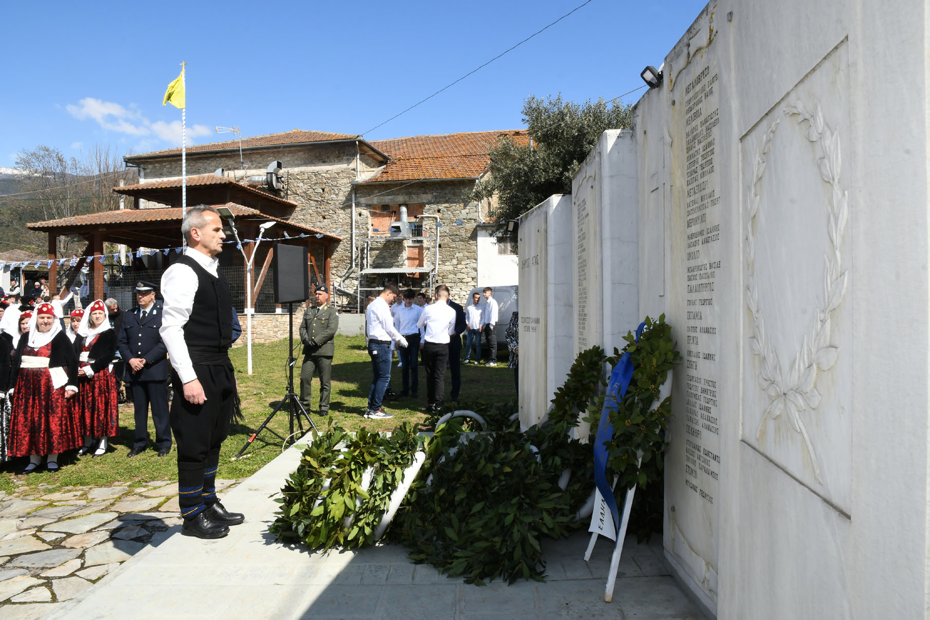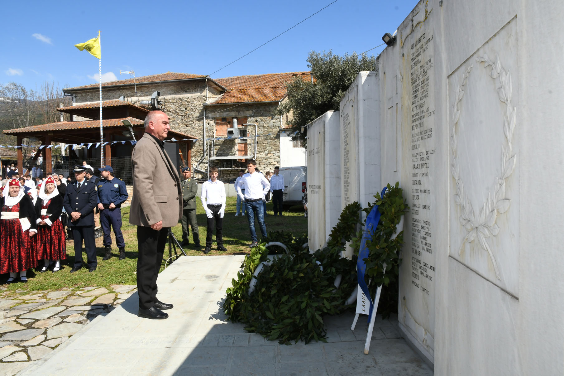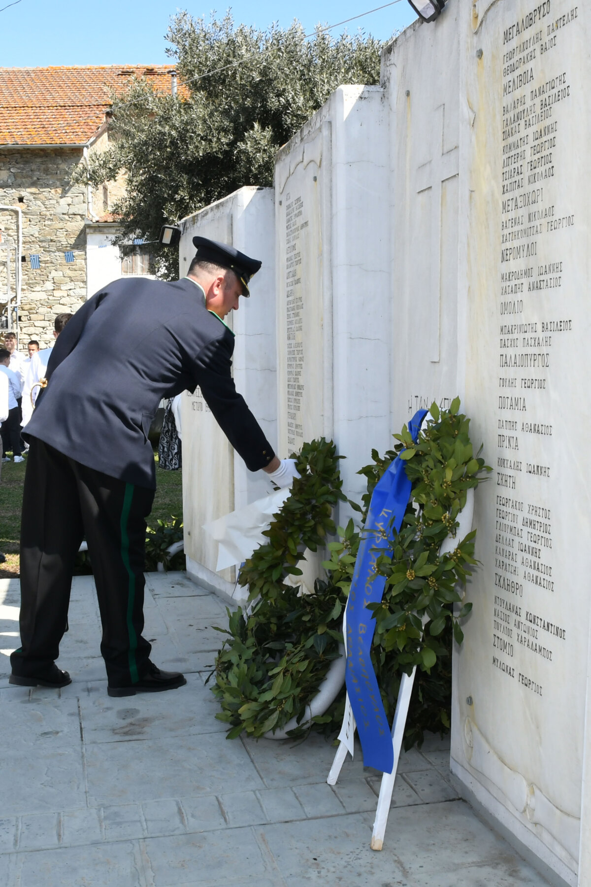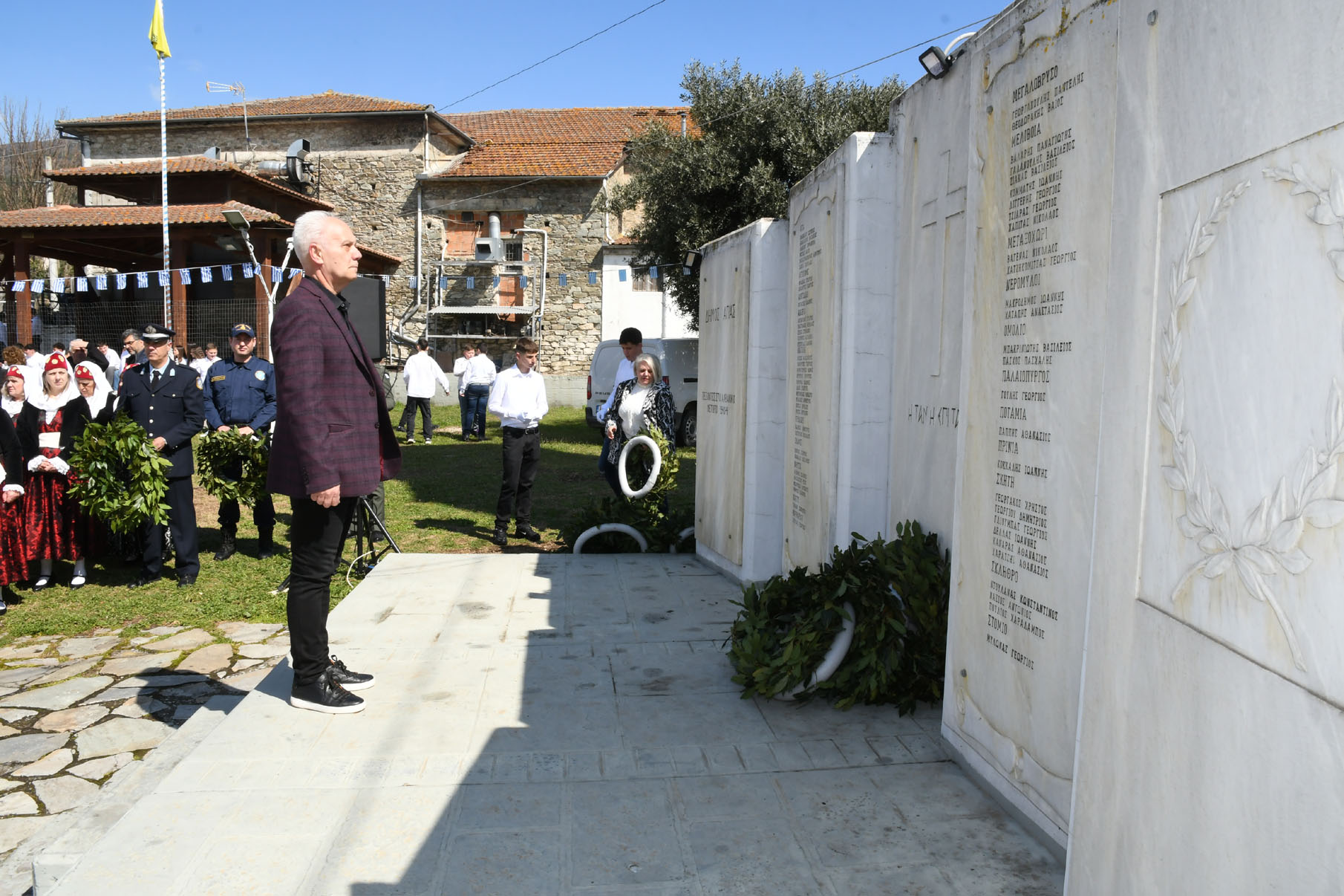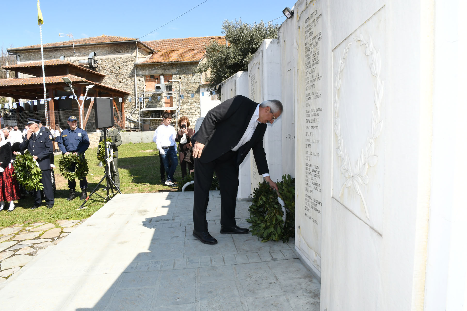 Της ομιλίας ακολούθησε επιμνημόσυνη δέηση στο Μνημείο των Πεσόντων Αγωνιστών, όπου ακούστηκε ο Εθνικός μας Ύμνος, κρατήθηκε ενός λεπτού σιγή και κατατέθηκαν στεφάνια από τον αντιπεριφερειάρχη Αθλητισμού και Πολιτισμού Σωτήριο Σουλούκο, από τον δήμαρχο Αγιάς Αντώνη Γκουντάρα, από τον κ. Γεώργιο Γουργιώτη, πρόεδρο της Δημοτικής Οργάνωσης Αγιάς της Νέας Δημοκρατίας, εκπροσωπώντας το κόμμα της Ν.Δ., από τον κ. Αθανάσιο Παλιοβάιο, πολιτευτή, εκπροσωπώντας το κόμμα «Ελληνική Λύση – Κυριάκος Βελόπουλος», από τον αντισυνταγματάρχη Πάνο Ηλία εκ μέρους των Ενόπλων Δυνάμεων, από τον διοικητή του Αστυνομικού Τμήματος Αγιάς Μιχάλη Κουπατσιάρα, από τον κ. Παντελή Βαλιάντζα εκπροσωπώντας το Πυροσβεστικό Κλιμάκιο Αγιάς, από τον υποδιοικητή του Λιμενικού Σταθμού Αγιοκάμπου Ανδρέα Λουλούδη, από τον τοπικό σύμβουλο της Δημοτικής Κοινότητας Αγιάς Ζάχο Μπατζιόλα για την Εθνική Αντίσταση, από τον διευθυντή του 2ου Δημοτικού Σχολείου Αγιάς Αθανάσιο Δεληζώνα εκ μέρους της Πρωτοβάθμιας Εκπαίδευσης, από την διευθύντρια του Γενικού Λυκείου Αγιάς Βικτώρια Δημητρίου εκ μέρους της Δευτεροβάθμιας Εκπαίδευσης, από τον κ. Αθανάσιο Μακρή ως εκπρόσωπο του 1ου Συστήματος Προσκόπων Αγιάς και από τον κ. Θεόδωρο Μαλαχτάρη εκ μέρους του Μορφωτικού Πολιτιστικού Συλλόγου Αγιωτών «Μιλτιάδης Δάλλας».
