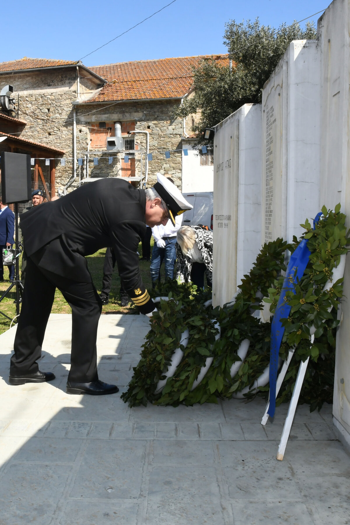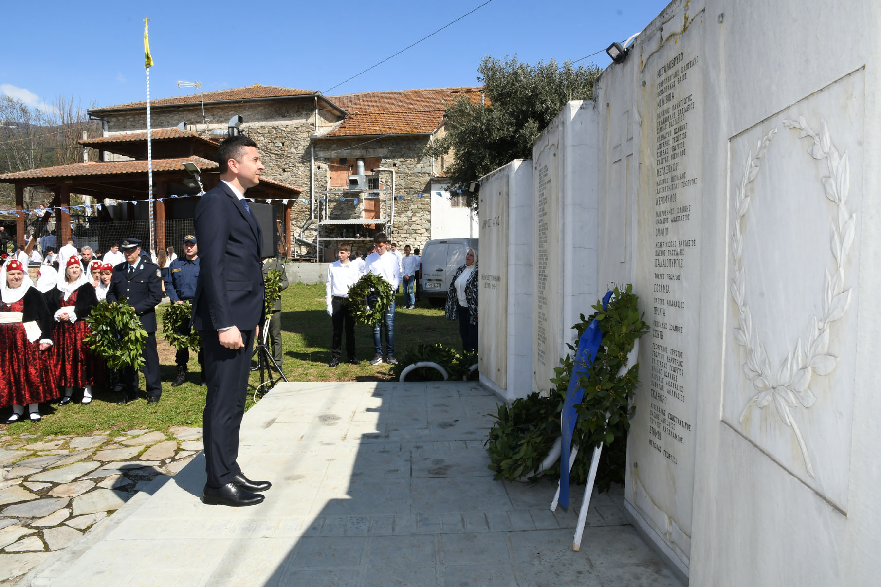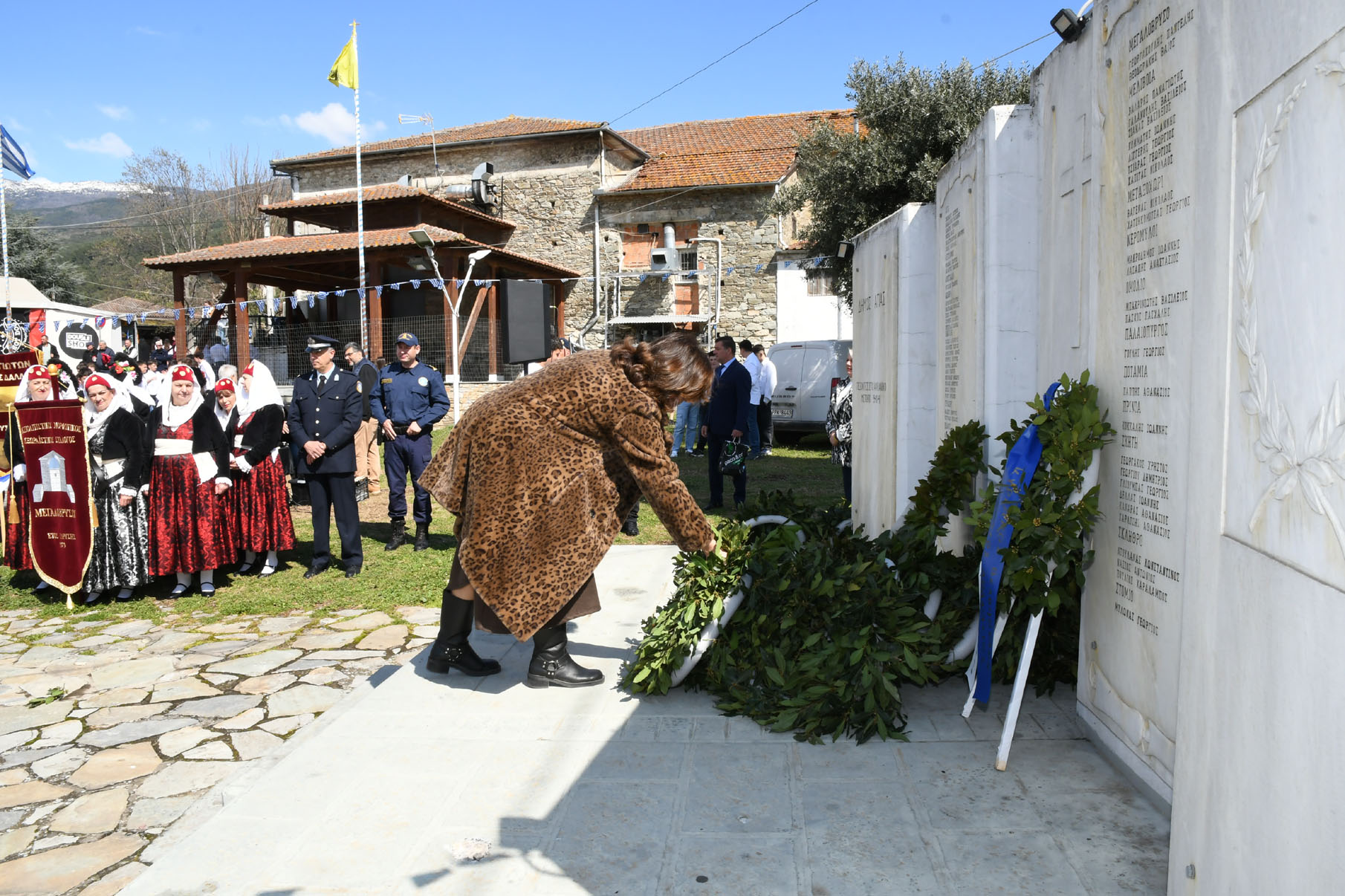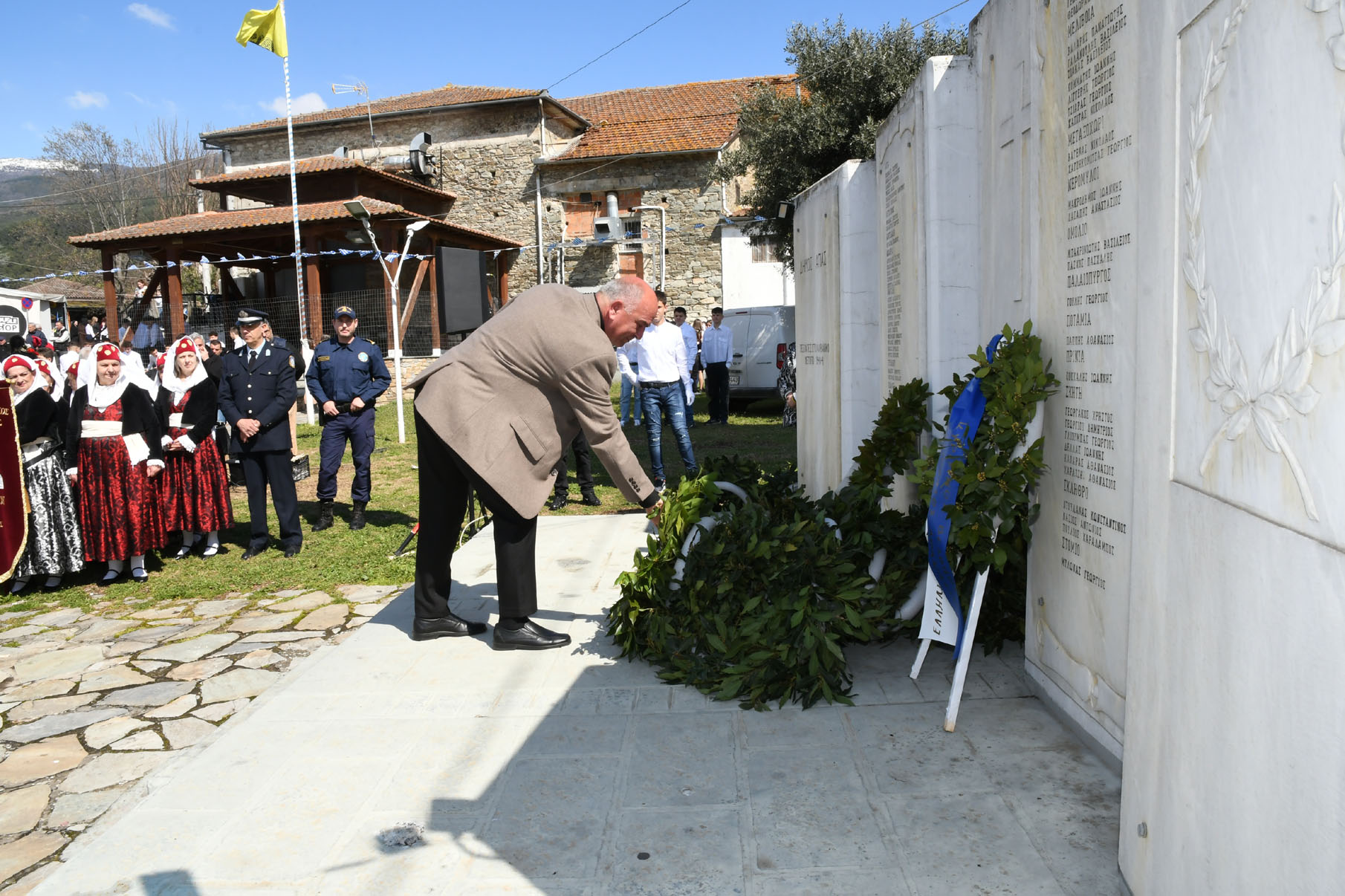 Της ομιλίας ακολούθησε επιμνημόσυνη δέηση στο Μνημείο των Πεσόντων Αγωνιστών, όπου ακούστηκε ο Εθνικός μας Ύμνος, κρατήθηκε ενός λεπτού σιγή και κατατέθηκαν στεφάνια από τον αντιπεριφερειάρχη Αθλητισμού και Πολιτισμού Σωτήριο Σουλούκο, από τον δήμαρχο Αγιάς Αντώνη Γκουντάρα, από τον κ. Γεώργιο Γουργιώτη, πρόεδρο της Δημοτικής Οργάνωσης Αγιάς της Νέας Δημοκρατίας, εκπροσωπώντας το κόμμα της Ν.Δ., από τον κ. Αθανάσιο Παλιοβάιο, πολιτευτή, εκπροσωπώντας το κόμμα «Ελληνική Λύση – Κυριάκος Βελόπουλος», από τον αντισυνταγματάρχη Πάνο Ηλία εκ μέρους των Ενόπλων Δυνάμεων, από τον διοικητή του Αστυνομικού Τμήματος Αγιάς Μιχάλη Κουπατσιάρα, από τον κ. Παντελή Βαλιάντζα εκπροσωπώντας το Πυροσβεστικό Κλιμάκιο Αγιάς, από τον υποδιοικητή του Λιμενικού Σταθμού Αγιοκάμπου Ανδρέα Λουλούδη, από τον τοπικό σύμβουλο της Δημοτικής Κοινότητας Αγιάς Ζάχο Μπατζιόλα για την Εθνική Αντίσταση, από τον διευθυντή του 2ου Δημοτικού Σχολείου Αγιάς Αθανάσιο Δεληζώνα εκ μέρους της Πρωτοβάθμιας Εκπαίδευσης, από την διευθύντρια του Γενικού Λυκείου Αγιάς Βικτώρια Δημητρίου εκ μέρους της Δευτεροβάθμιας Εκπαίδευσης, από τον κ. Αθανάσιο Μακρή ως εκπρόσωπο του 1ου Συστήματος Προσκόπων Αγιάς και από τον κ. Θεόδωρο Μαλαχτάρη εκ μέρους του Μορφωτικού Πολιτιστικού Συλλόγου Αγιωτών «Μιλτιάδης Δάλλας».